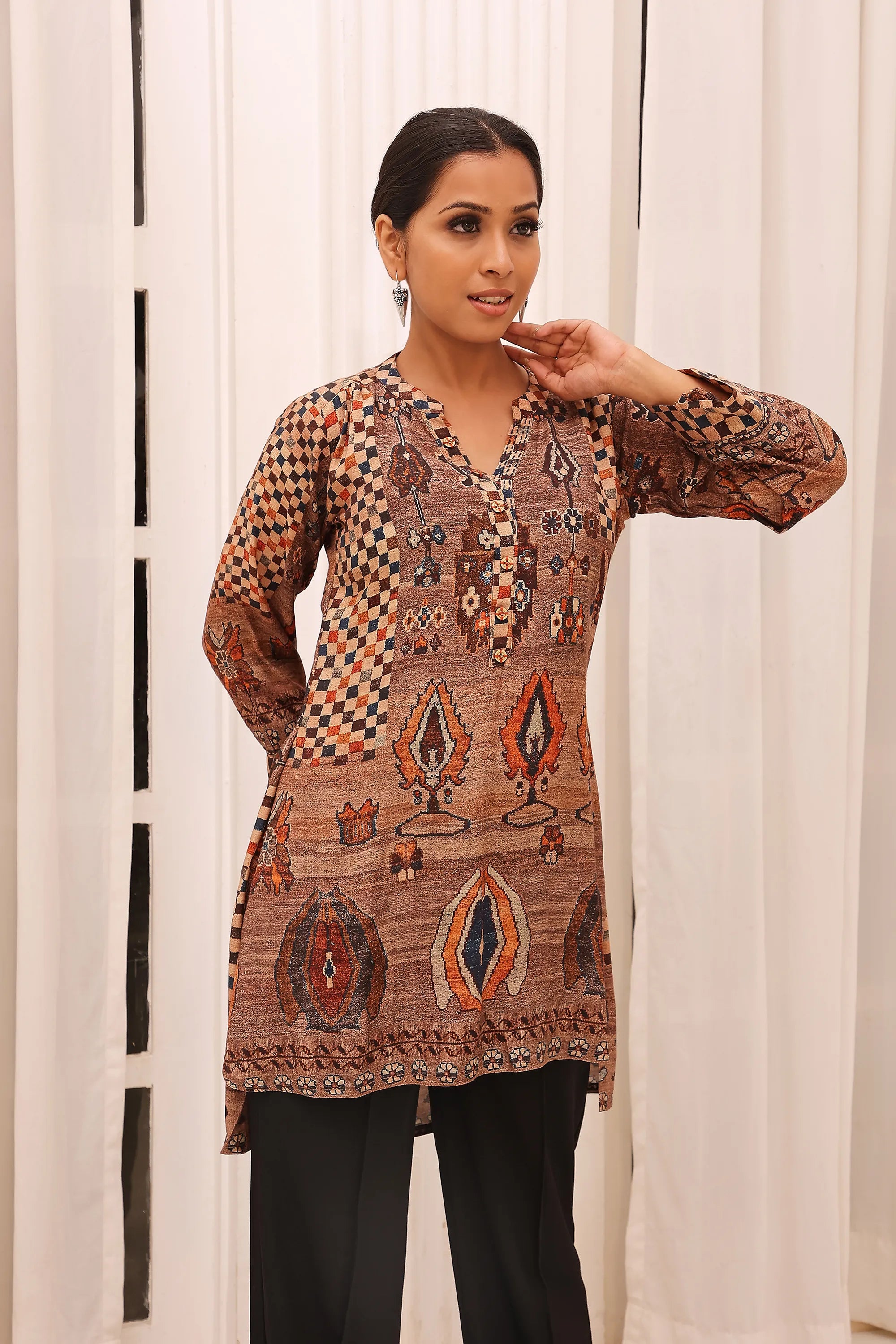 Brown High-Low Printed Muslin Tunic: Modern Charm