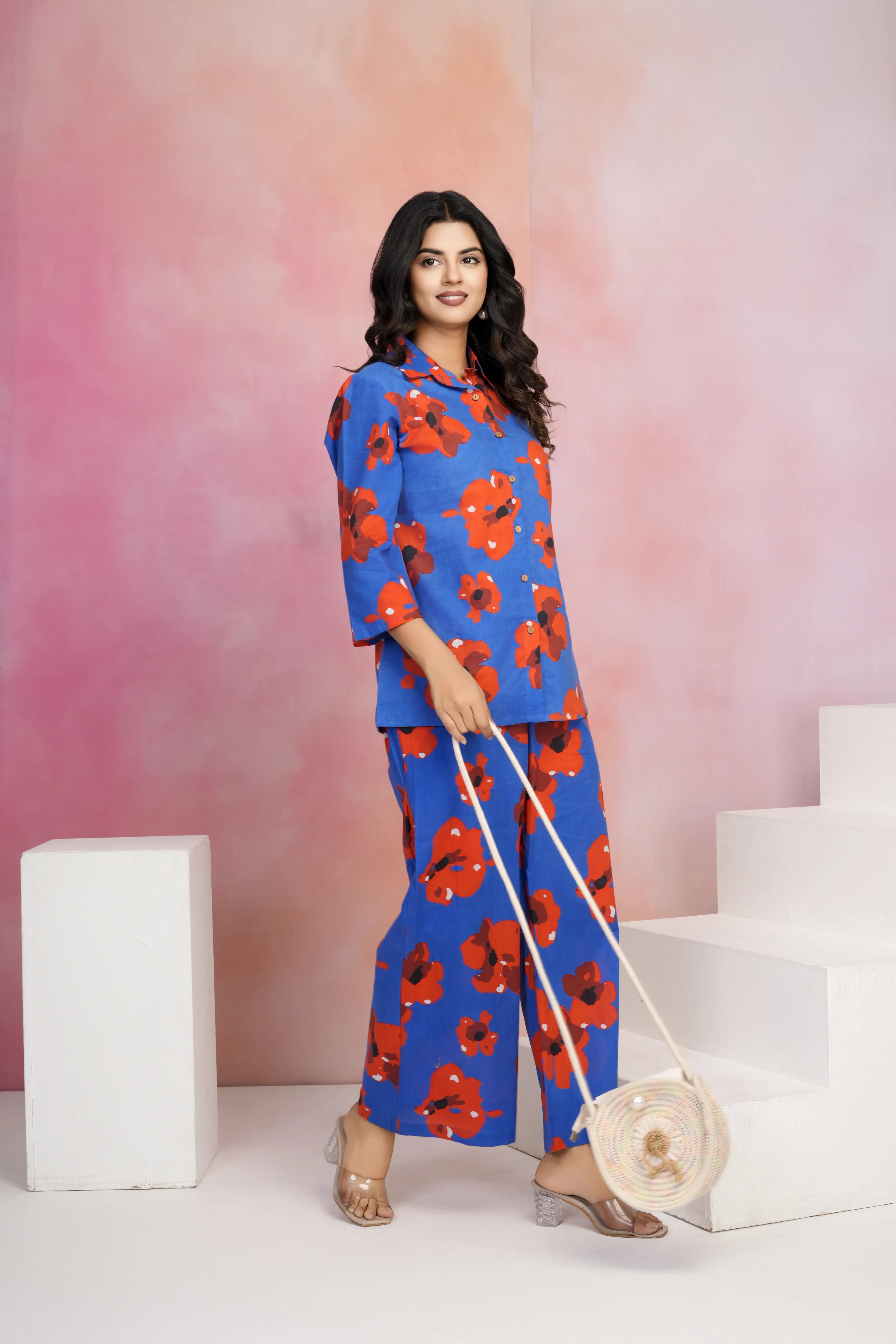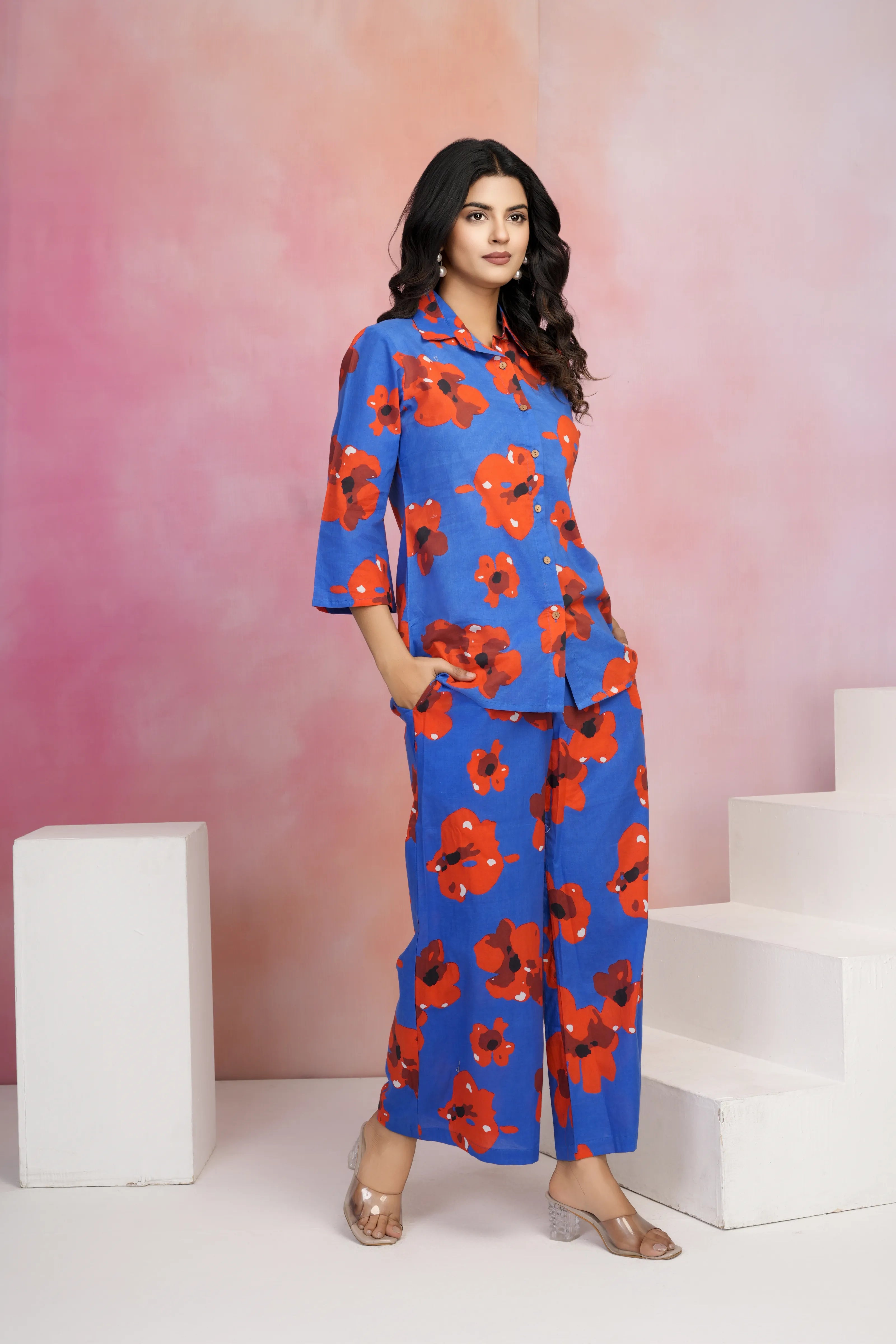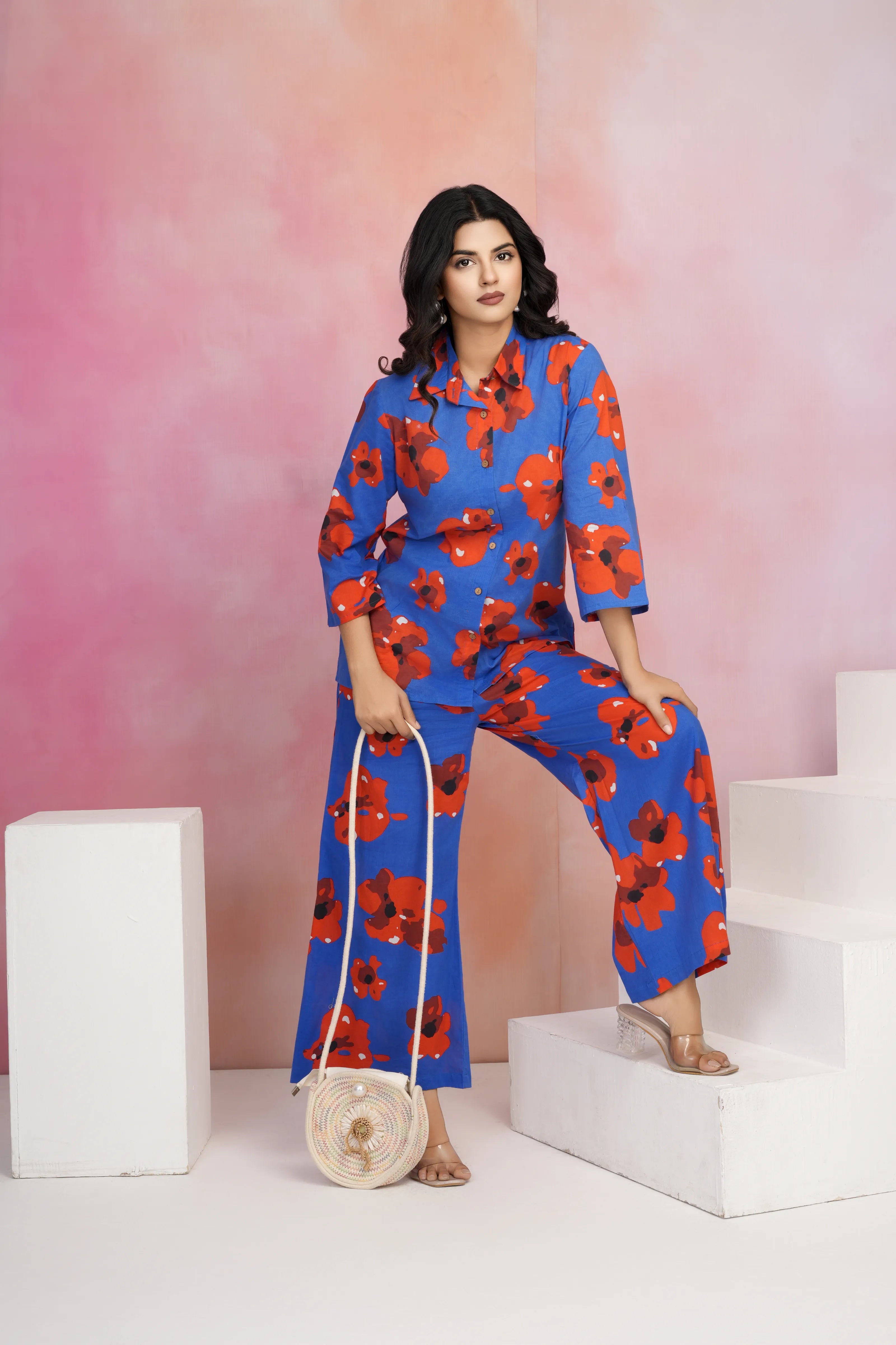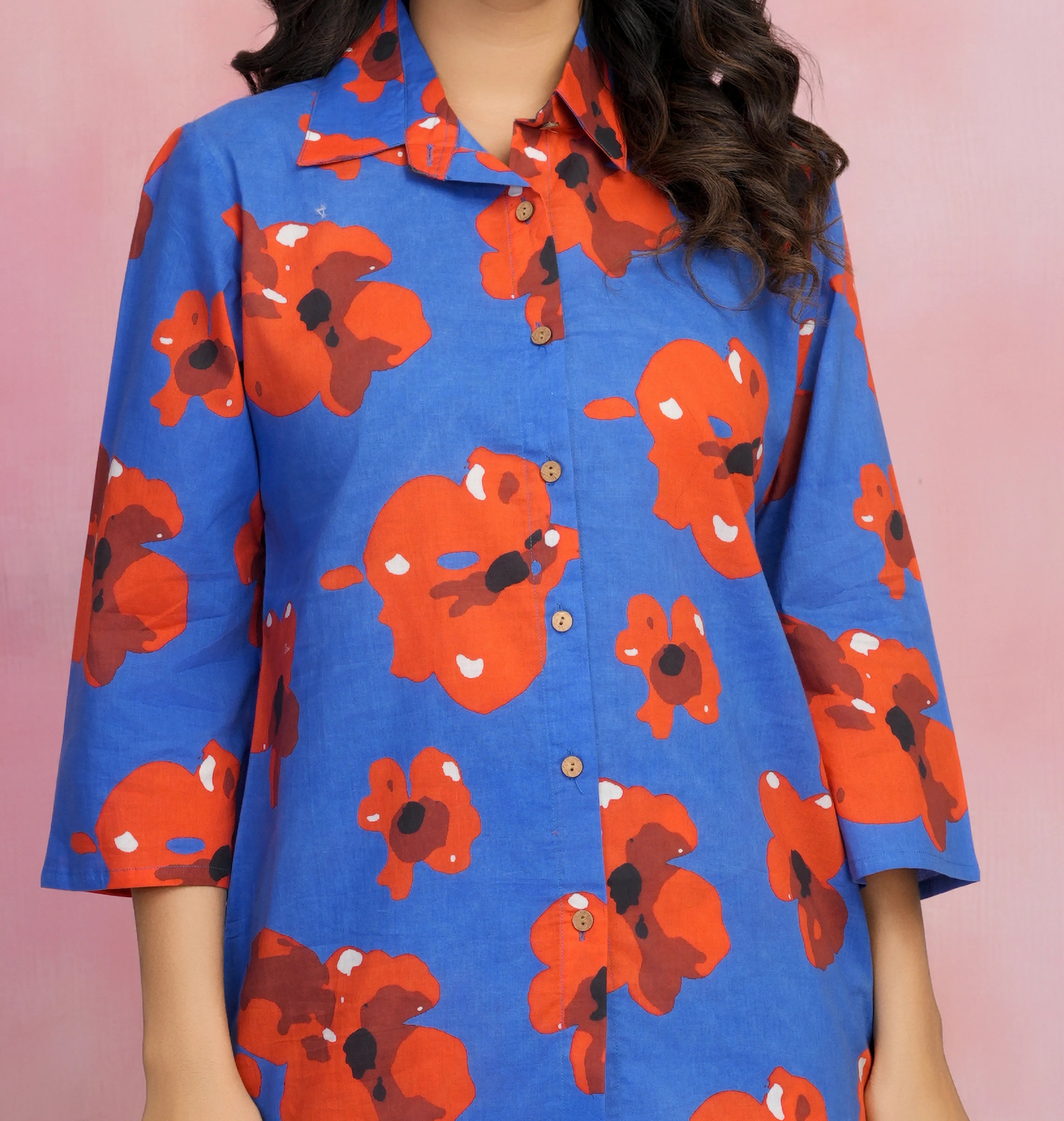 Bold, breezy, and unapologetically vibrant — the Midnight Bloom co-ord set is a head-turning pick for your sunshine hours or getaway plans. Set against a rich navy blue backdrop, its fiery red abstract floral print adds a fierce yet feminine touch to your summer wardrobe.