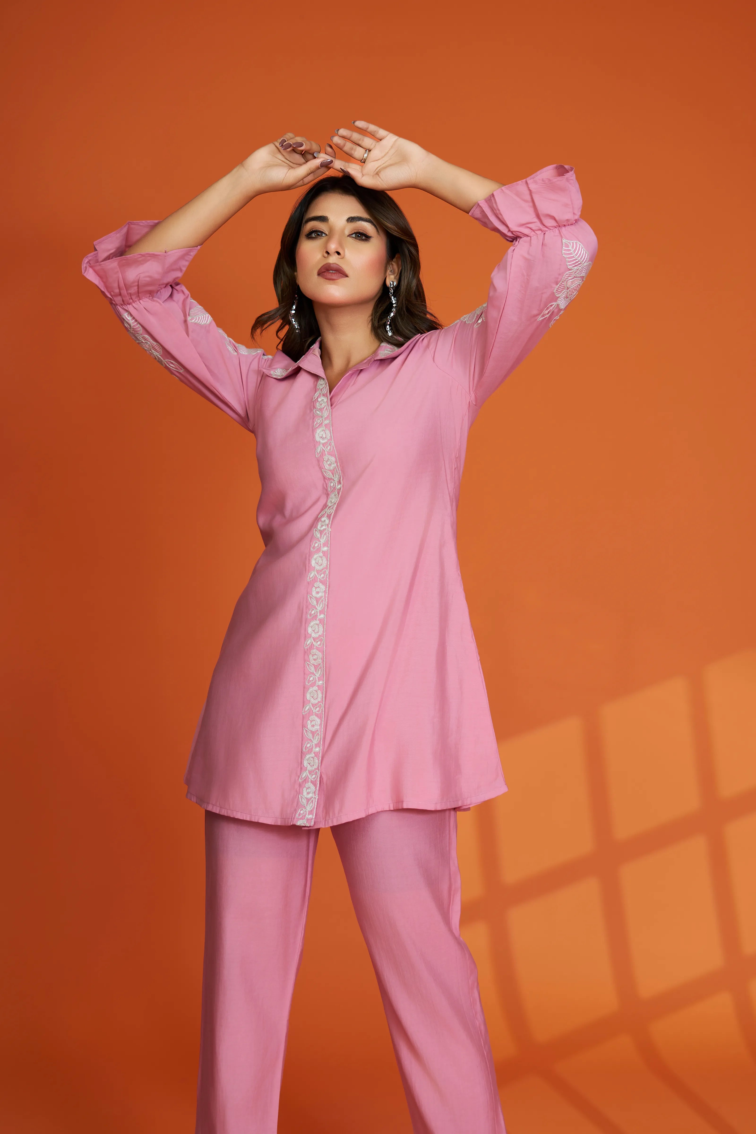 Delicate and poised, this baby pink ethnic set features exquisite silver lurex thread placement embroidery that adds a soft shimmer to the elegant silhouette. The shirt collar kurta with elasticated sleeves and a side slit flows beautifully in smooth Roman silk, paired with straight pants for a chic and contemporary ethnic look.