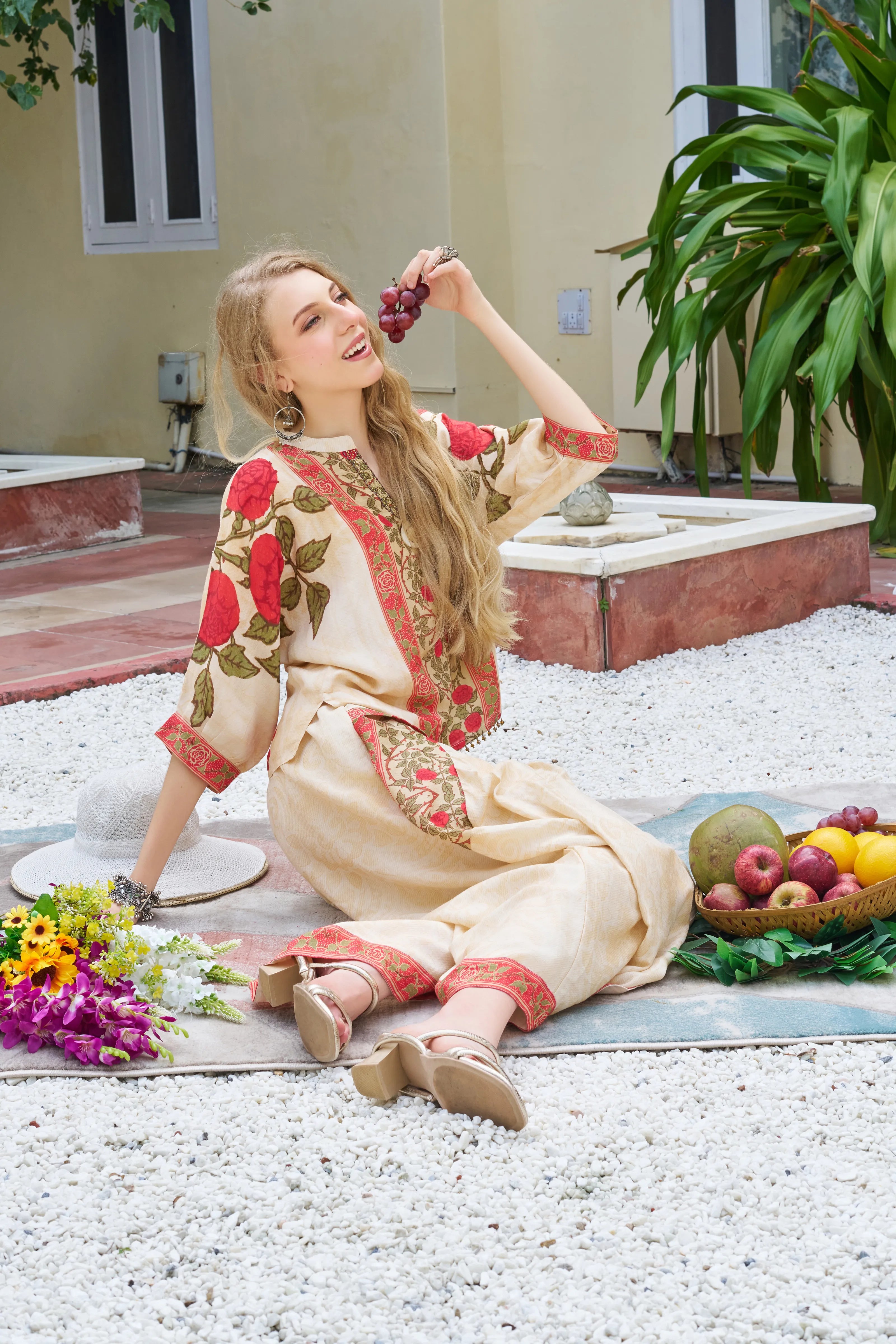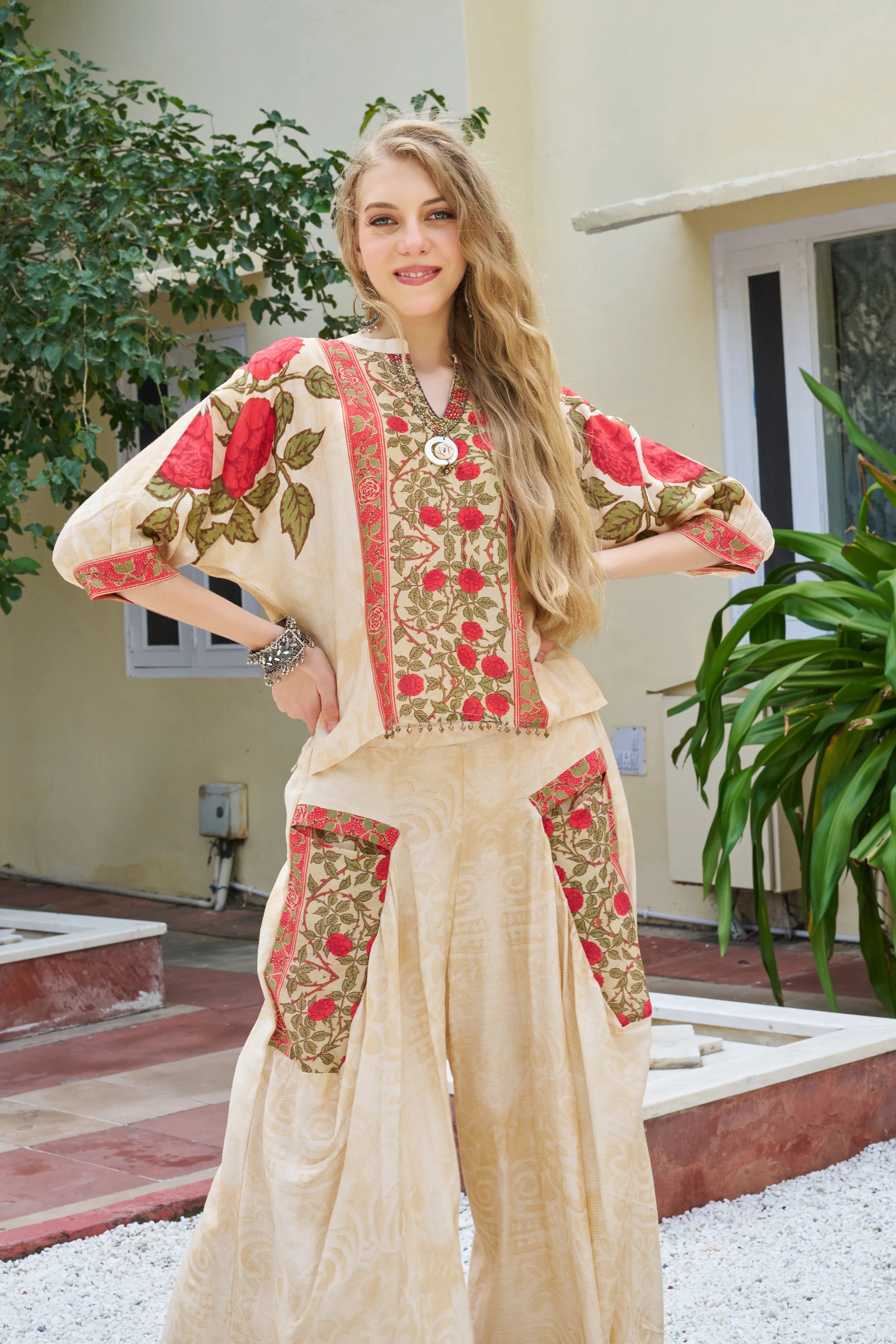 Channel regal elegance with our Gulzaar Grace co-ord set, an exquisite blend of heritage charm and modern silhouette. Crafted in rich viscose slub fabric, this outfit features a beautifully printed beige base enhanced with vibrant red floral motifs and traditional border detailing. The embellished top showcases balloon sleeves with intricate cuff work and a detailed neckline, while the wide palazzo pants come with contrast printed oversized patch pockets for a fusion twist.