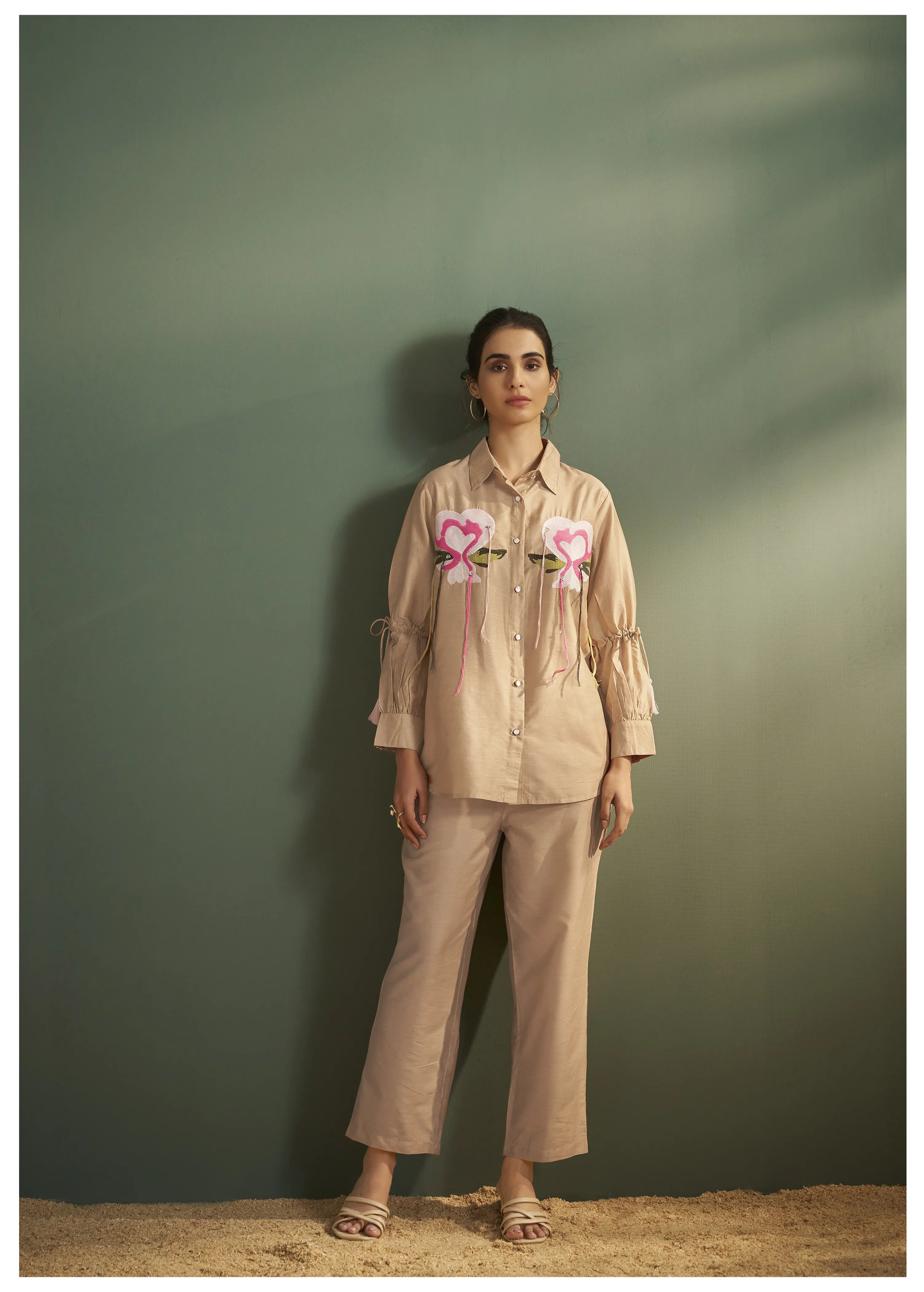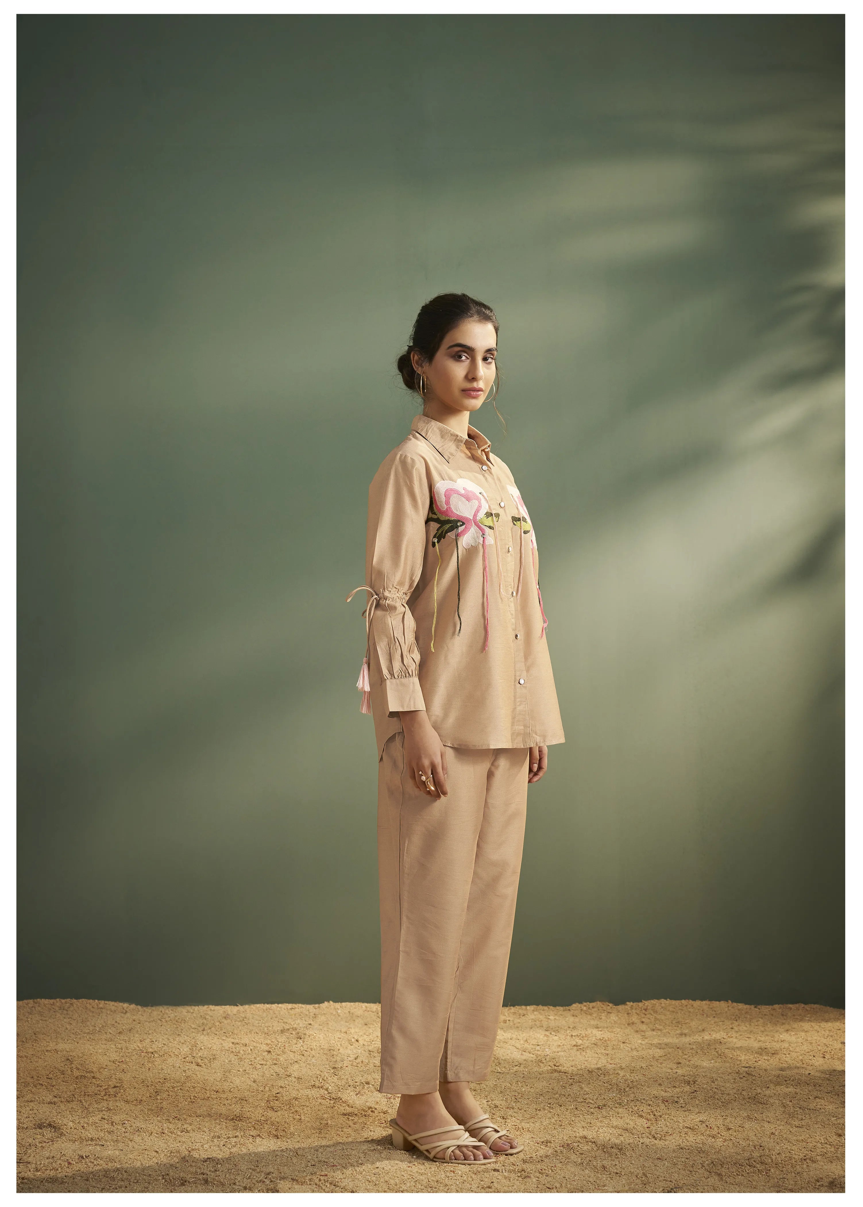Beige Multi-Thread Dola Silk Embroidered Patch Co-Ord Set