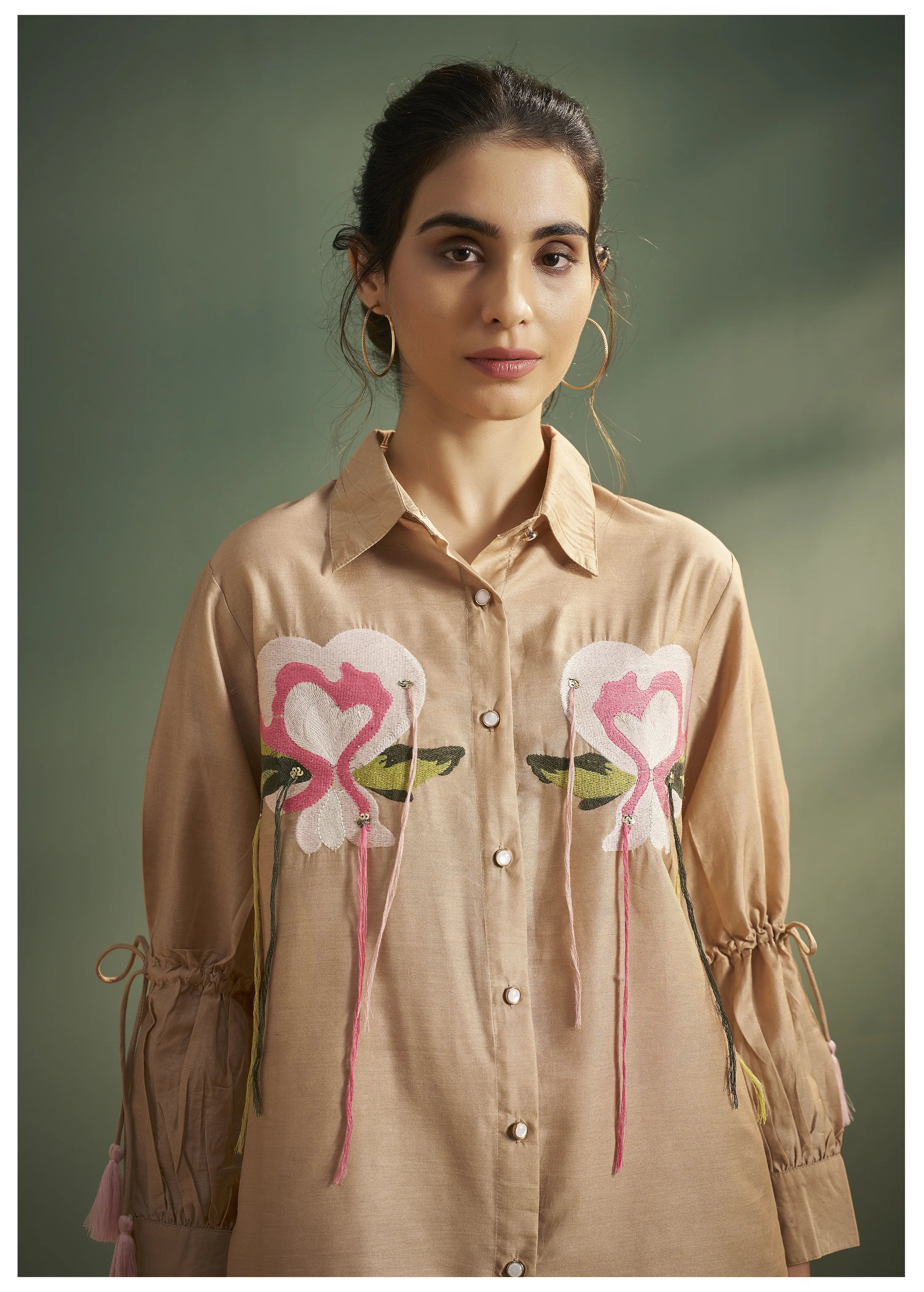 The Beige Multi-Thread Dola Silk Embroidered Patch Co-Ord Set combines luxurious fabric and exquisite detailing, making it an ideal choice for those who value elegance and timeless style.