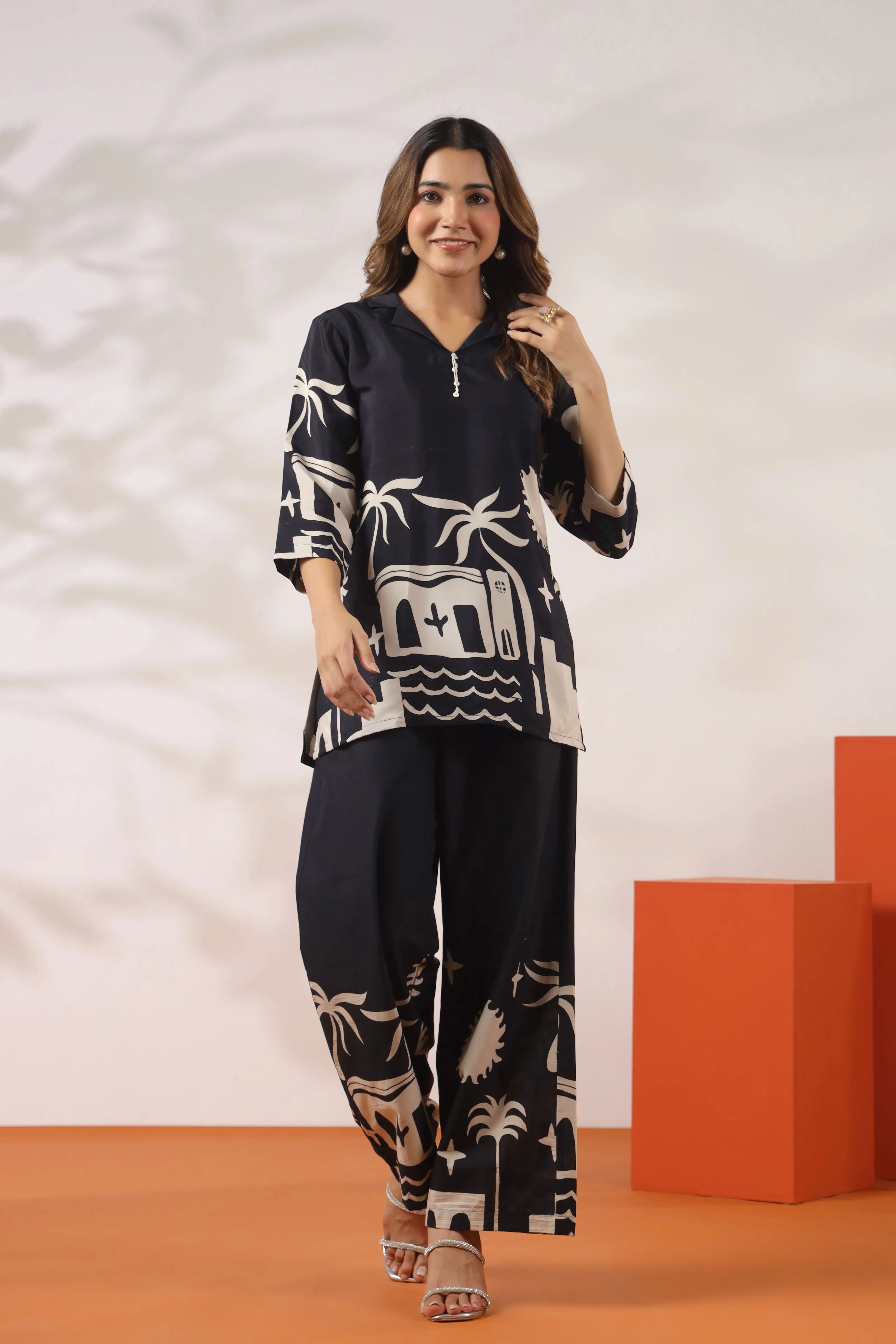 Coastal Mirage: Black Base & Beige Coastal Motif Russian Silk Co-ord Set