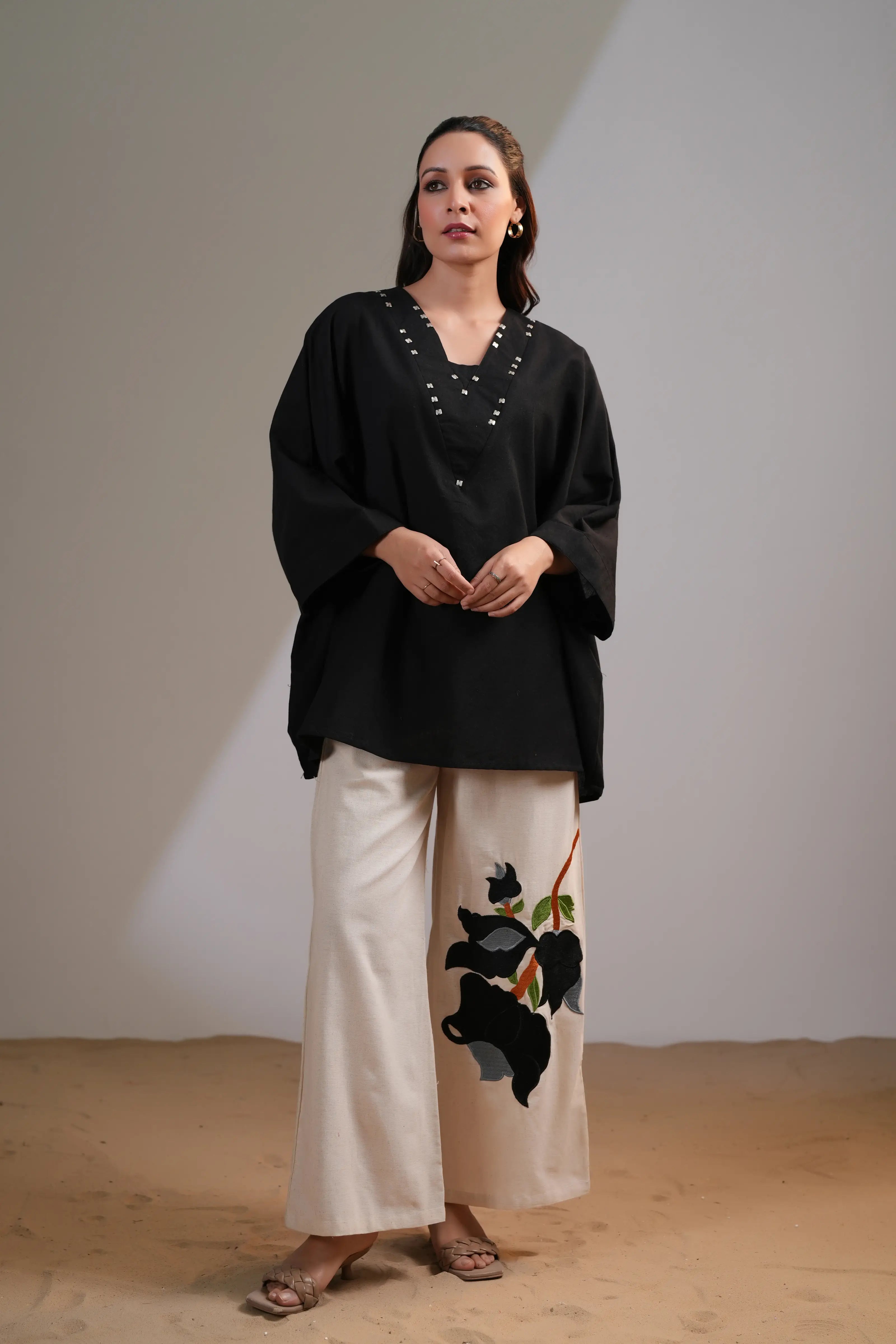 Step into effortless sophistication with this Solid Black Co-Ord Set, featuring a silver-embellished V-neck top and placement-embroidered wide-leg pants. Crafted from breathable cotton flex, this ensemble offers a perfect blend of comfort and style, making it ideal for elevated casual wear or chic evening outings.