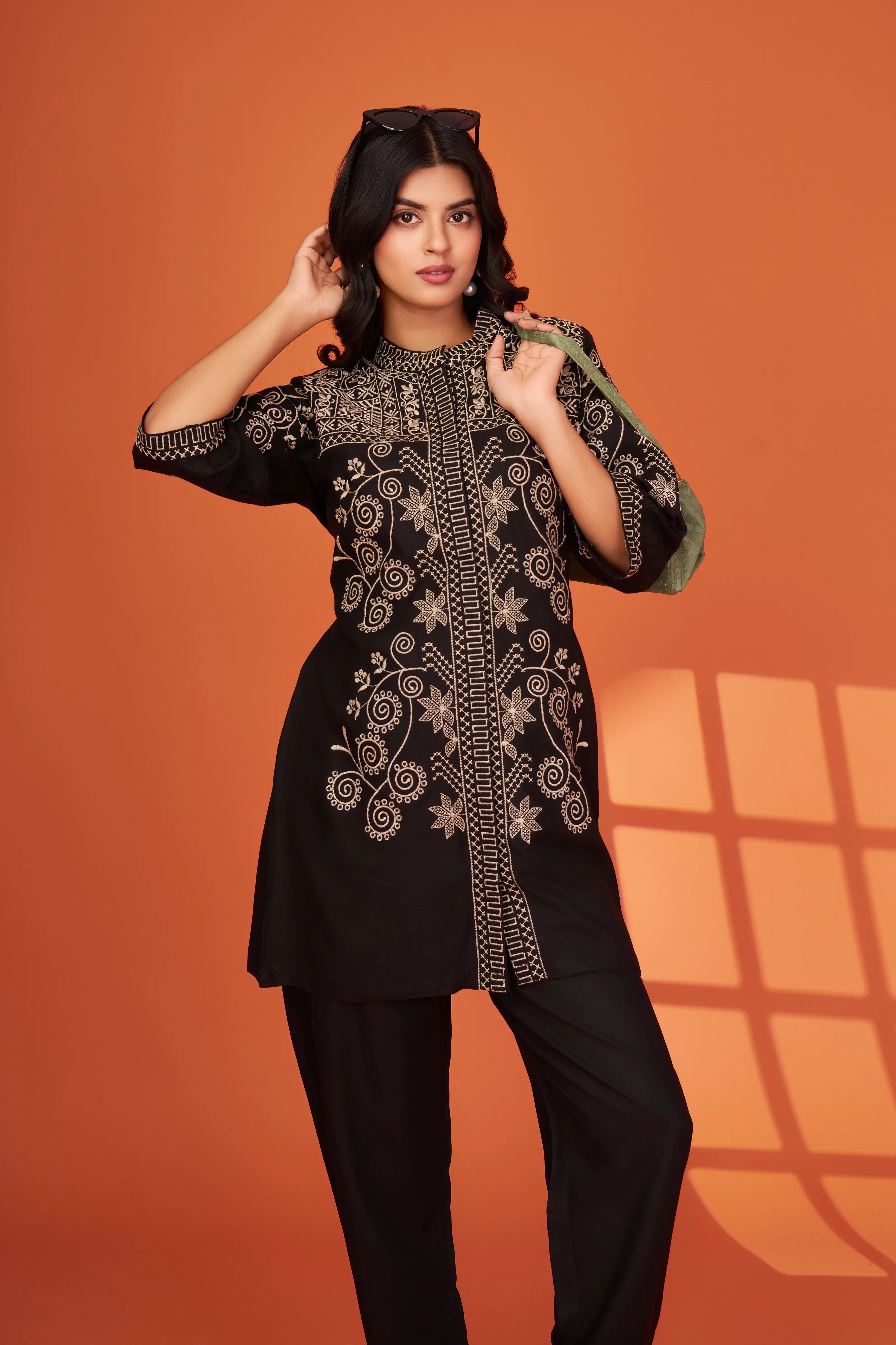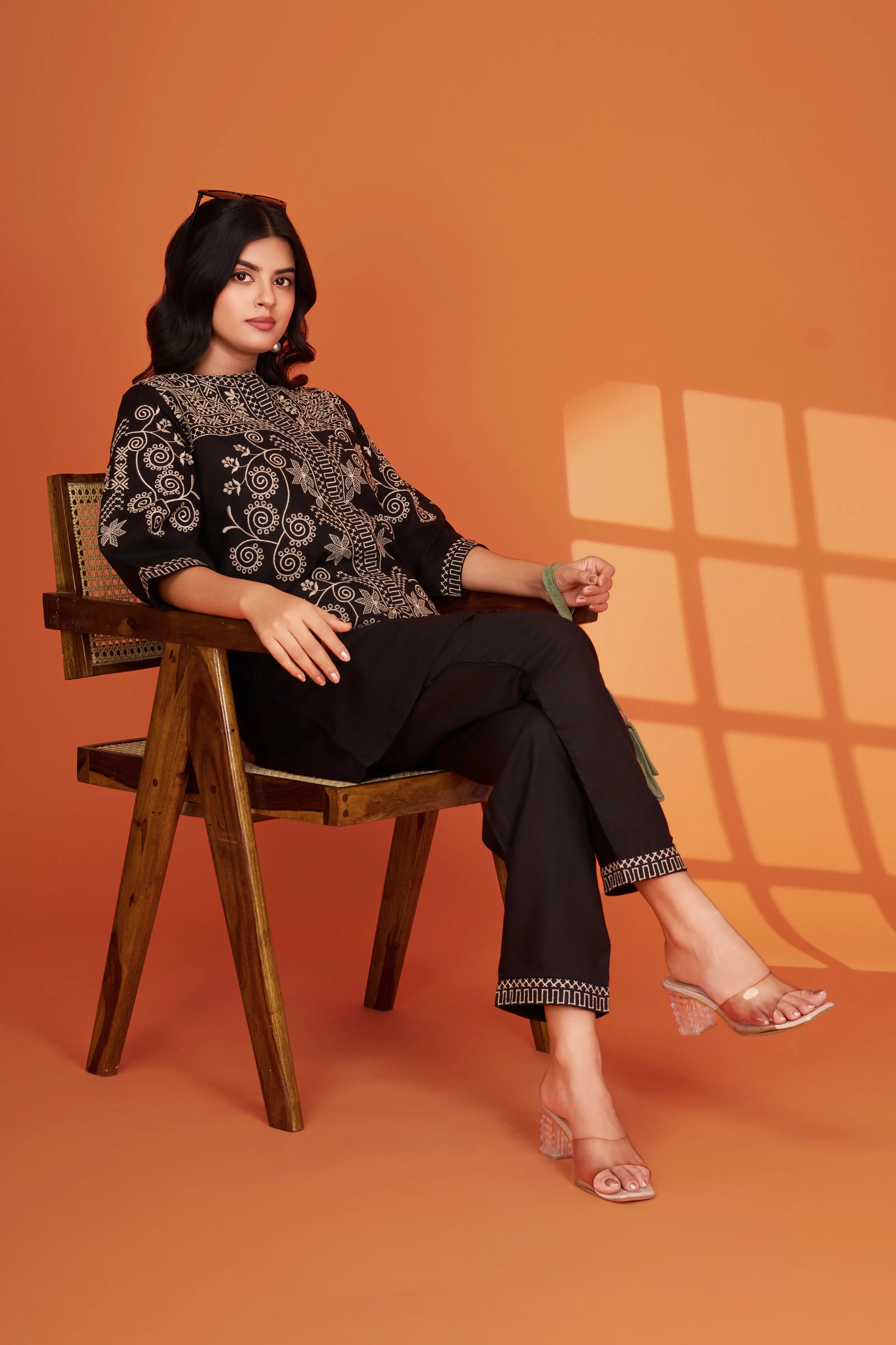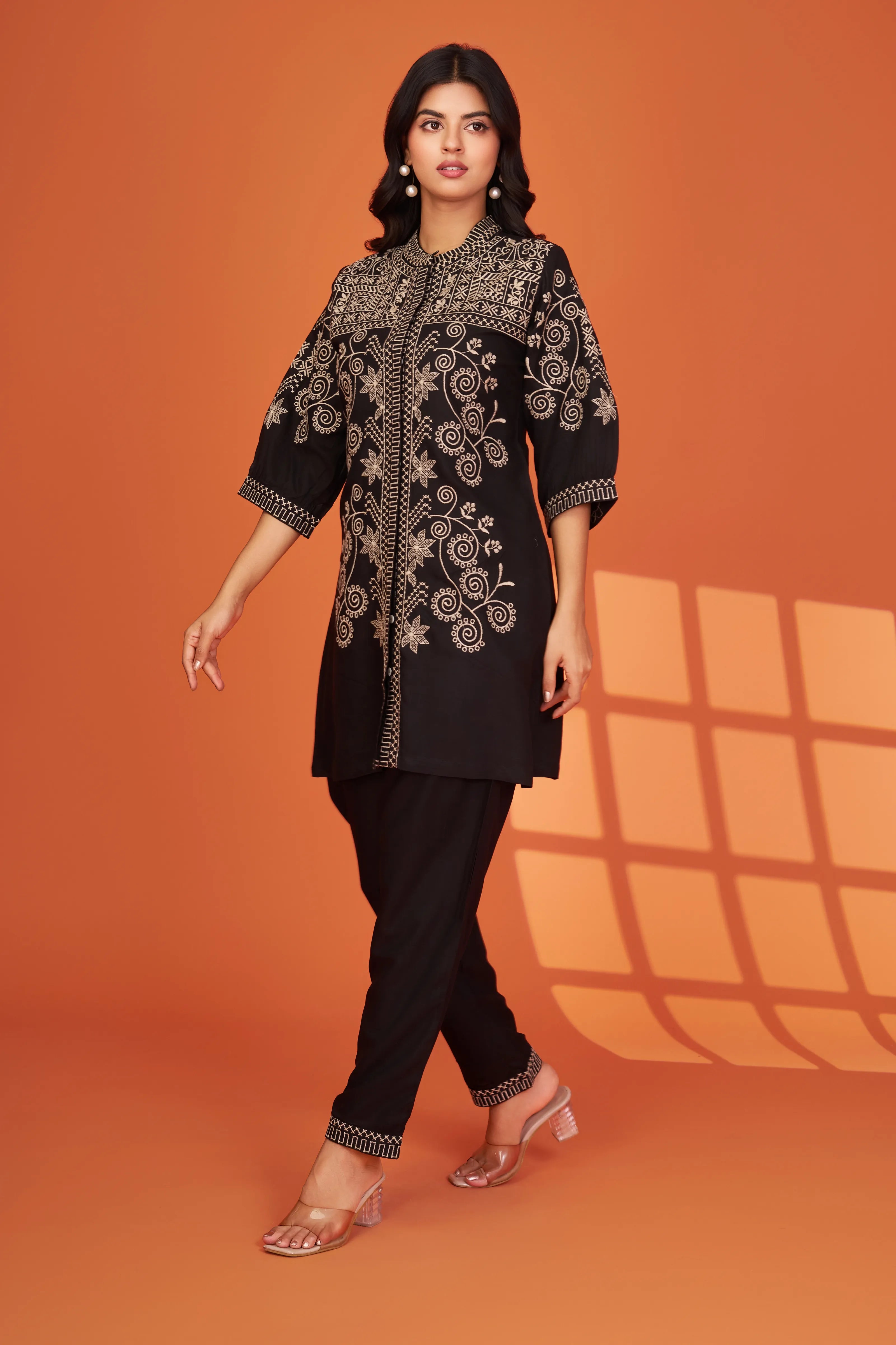 Step into understated opulence with Noir Élan, a black-on-black embroidered co-ord set designed to impress with quiet sophistication. Intricately detailed ivory threadwork graces the front, yoke, and sleeves, bringing a luxurious flair to this breathable cotton ensemble.