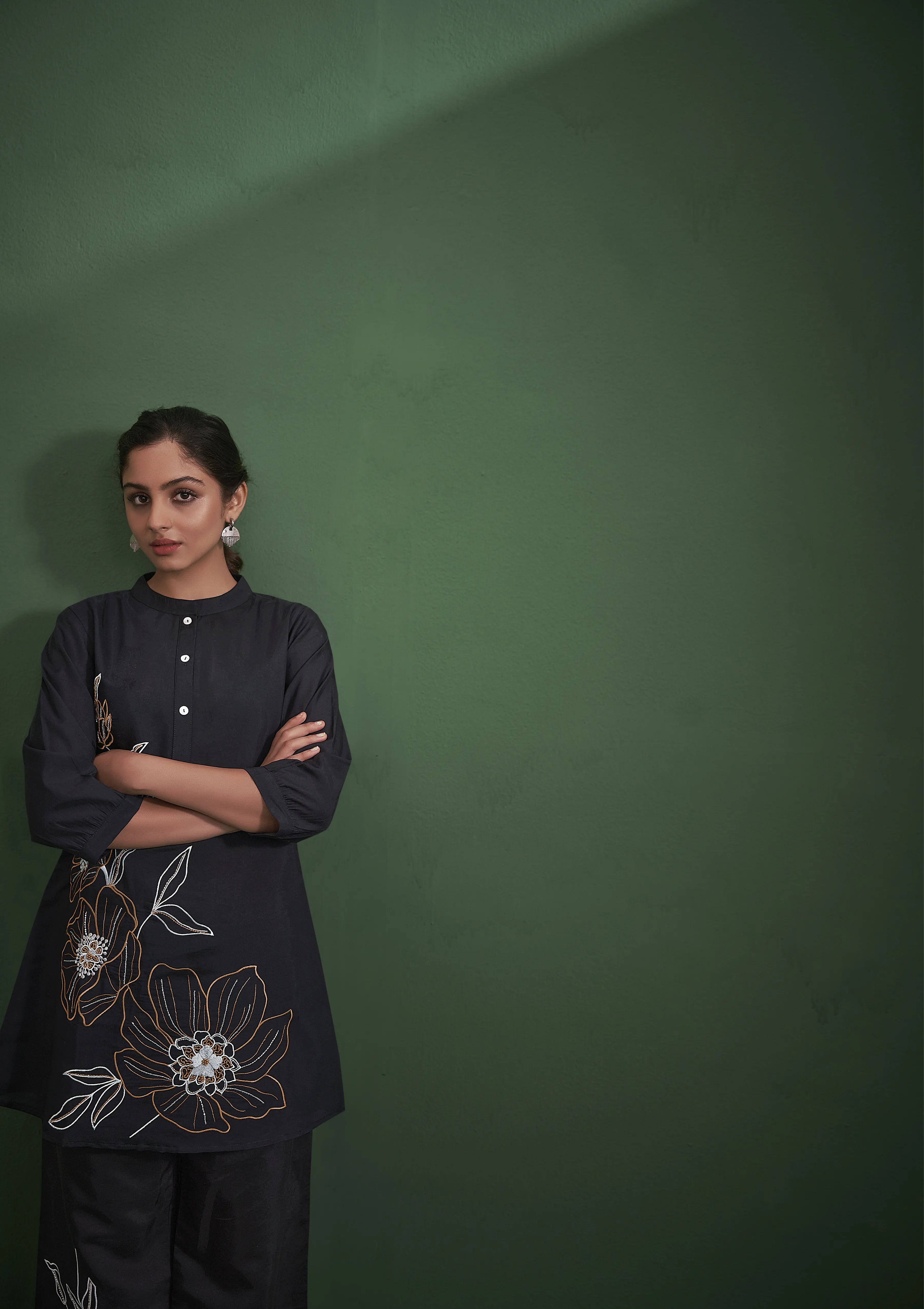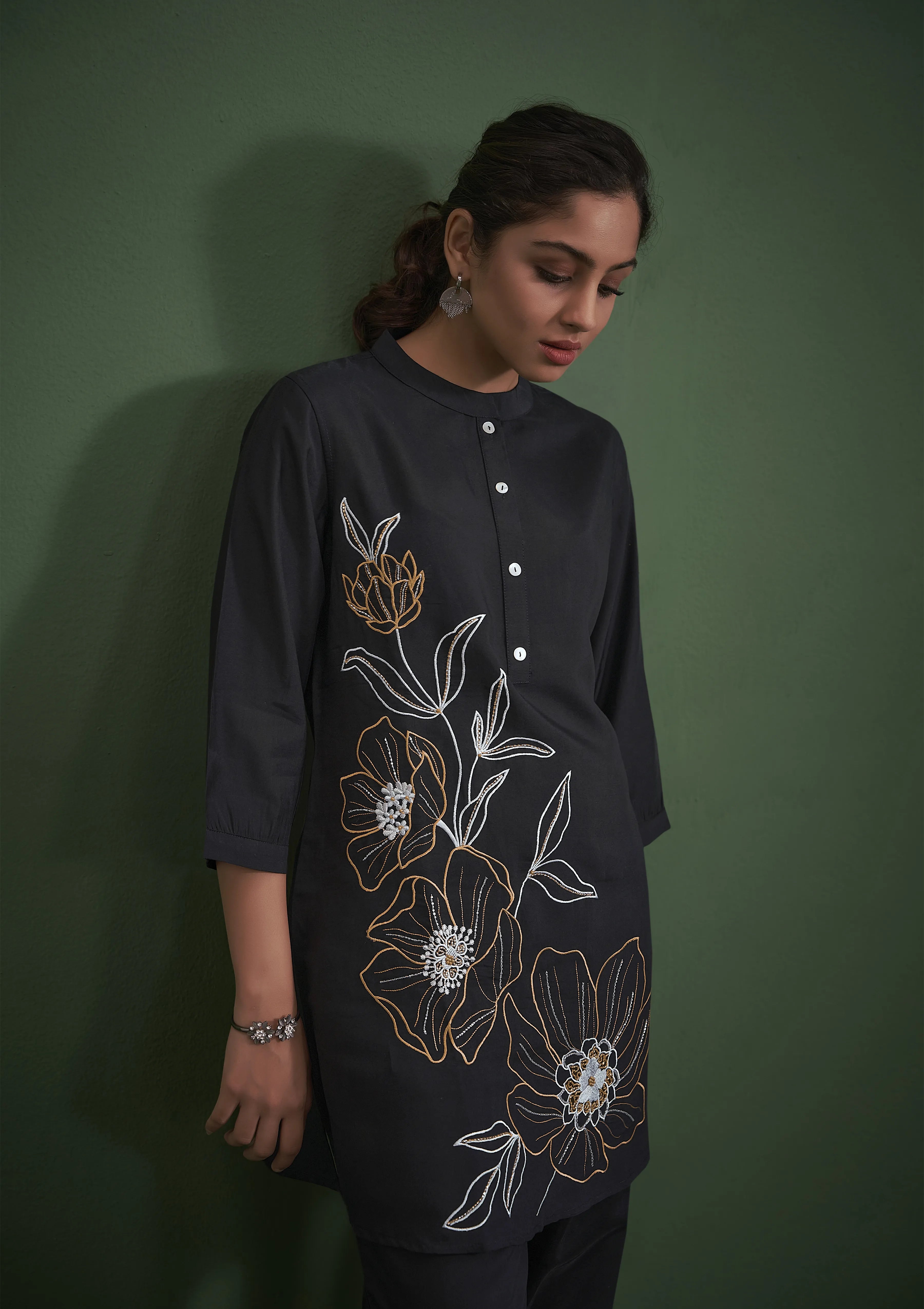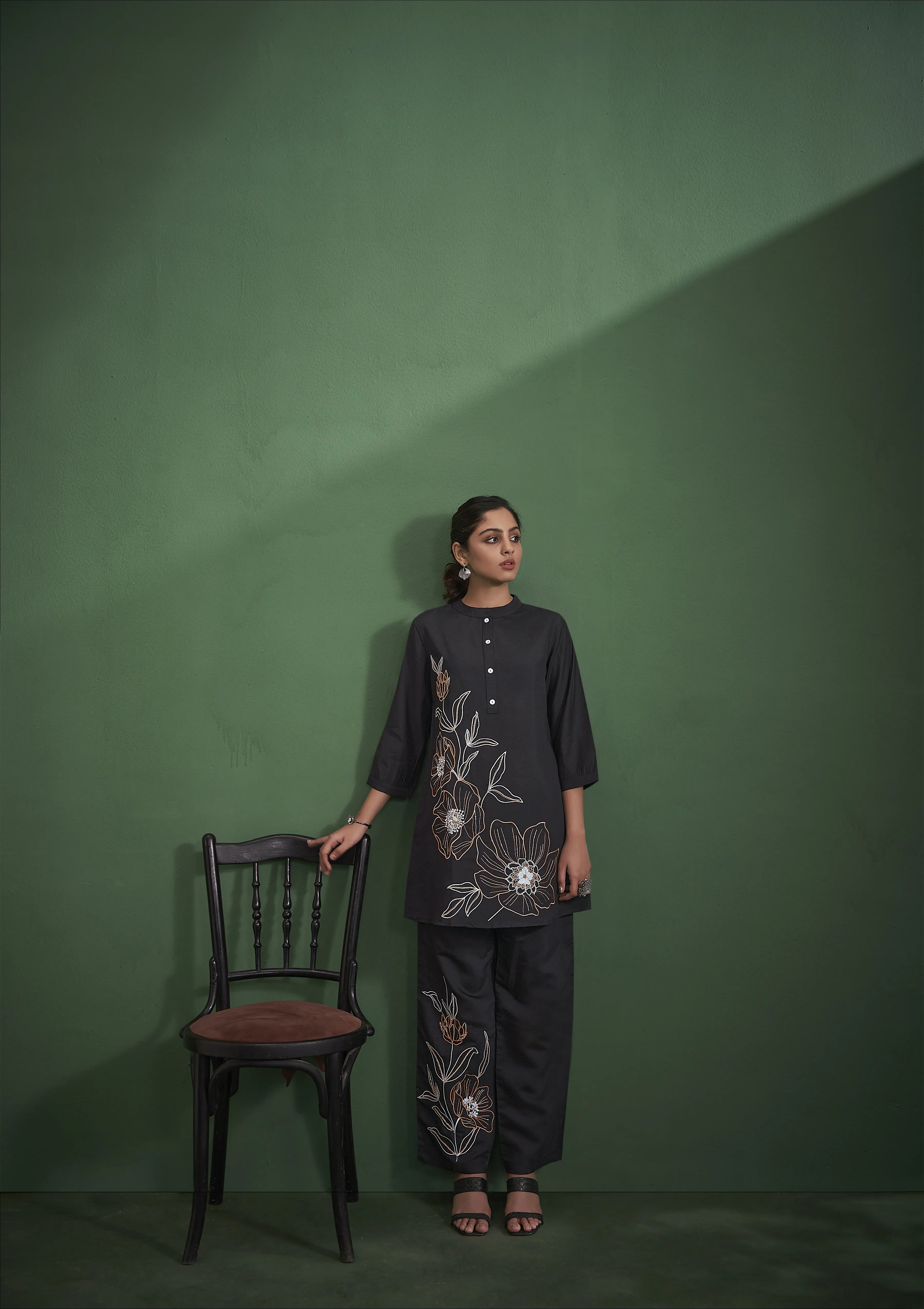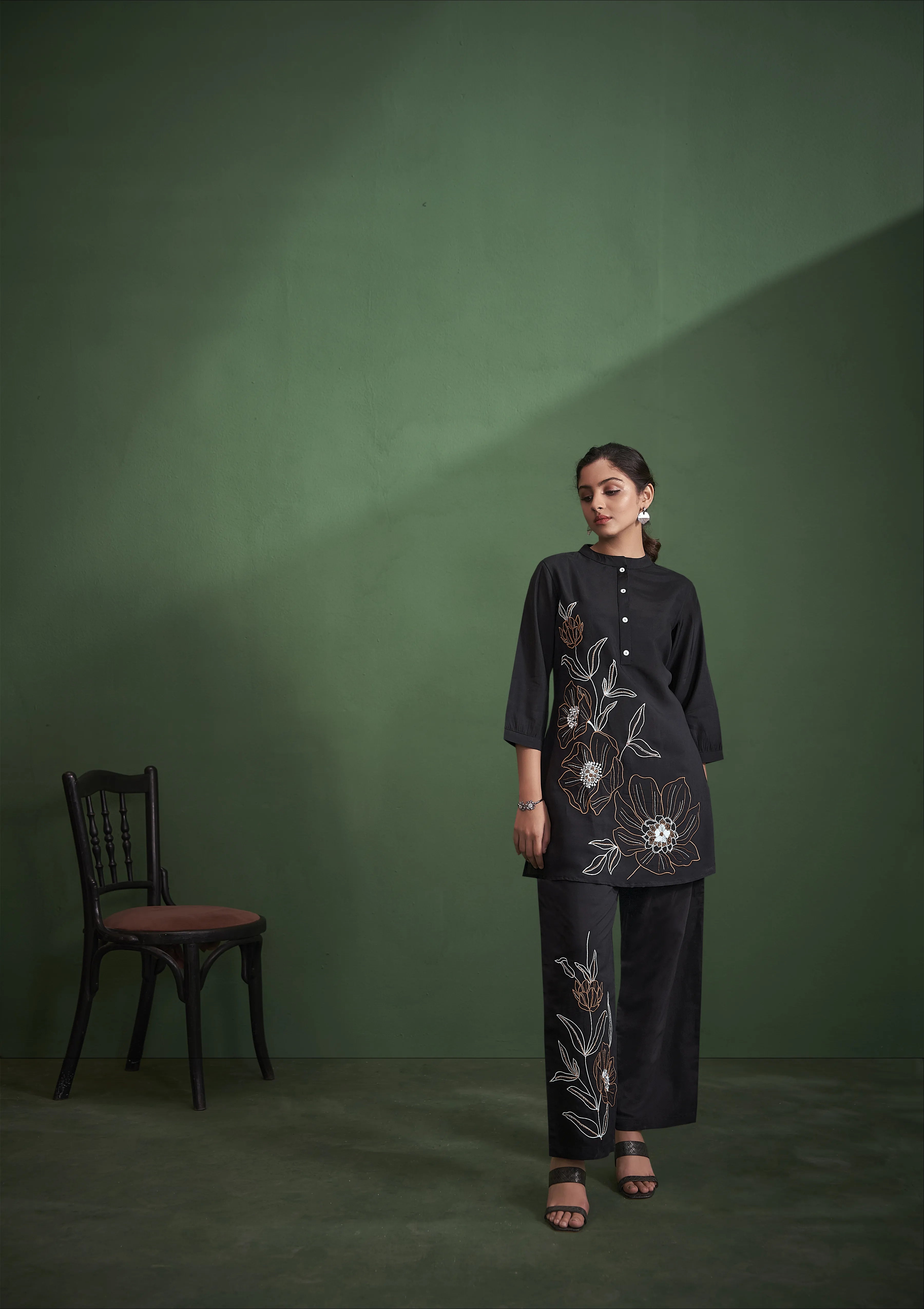Embrace timeless sophistication with this solid black kurta and trouser set, crafted from luxurious viscose fabric for a soft and flowy drape. The A-line kurta features a classic mandarin collar, intricate floral embroidery, a refined half-button closure, and three-quarter sleeves, making it a statement of effortless grace.