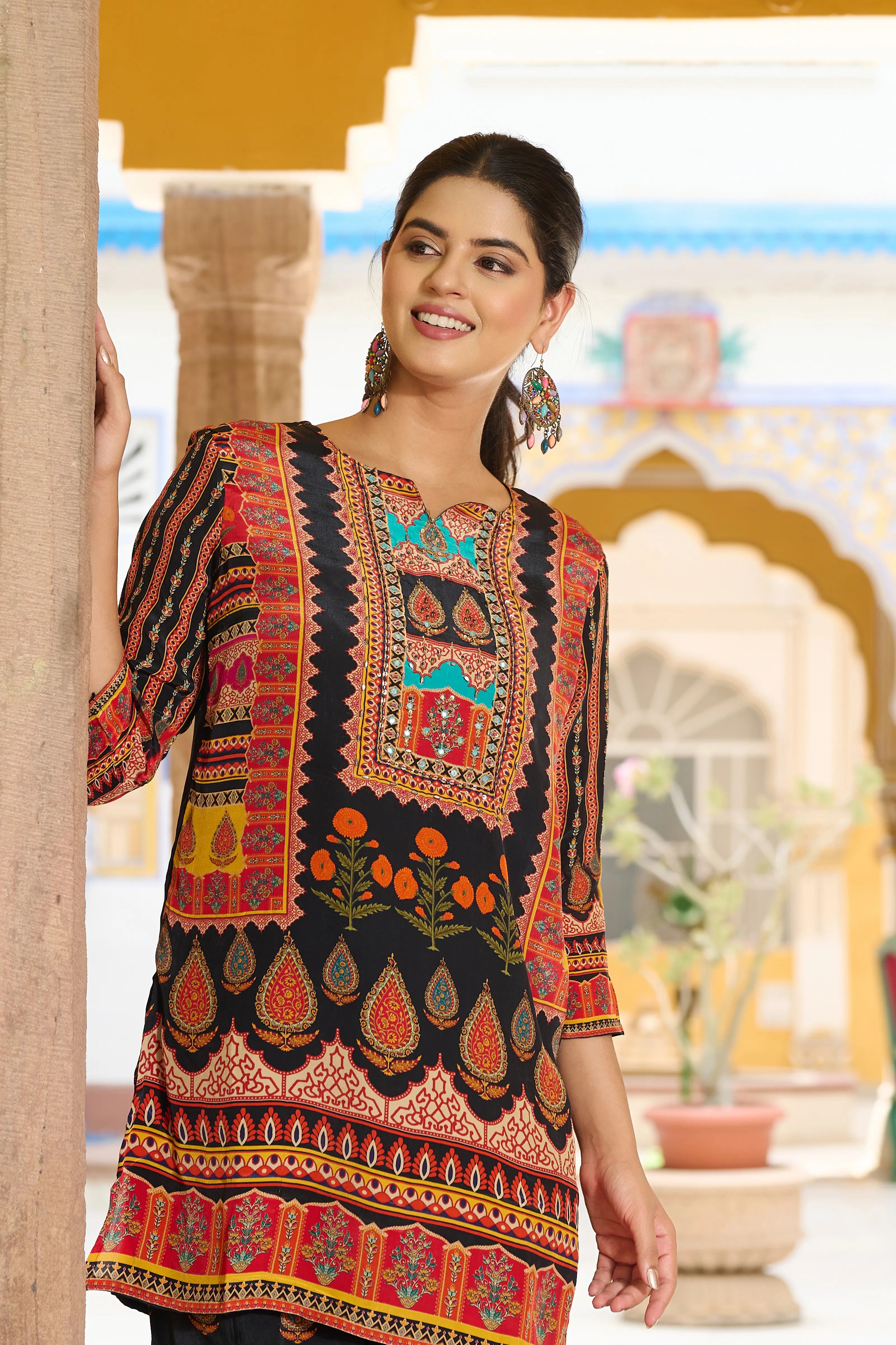 • Color: Black base with multicolor traditional motifs