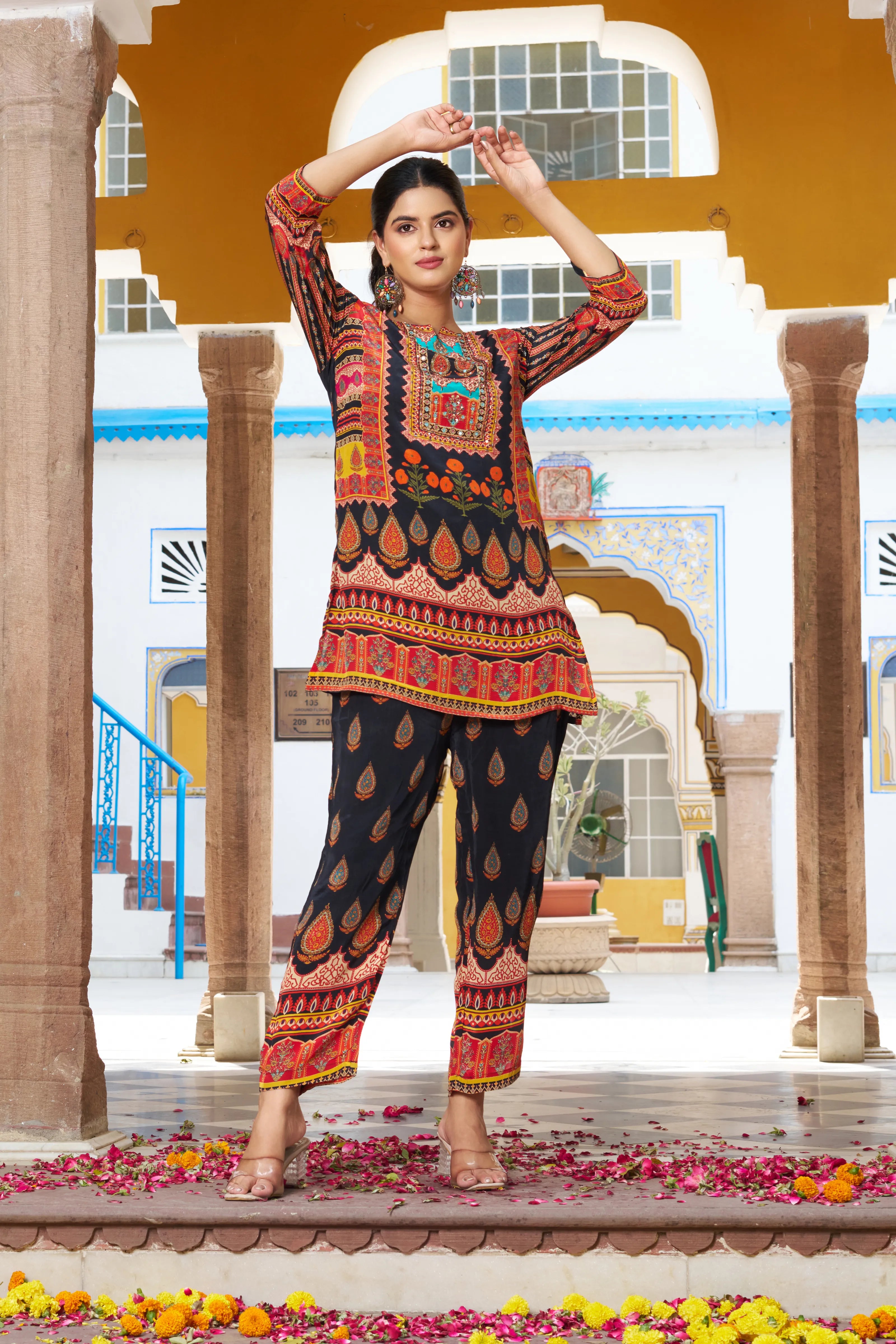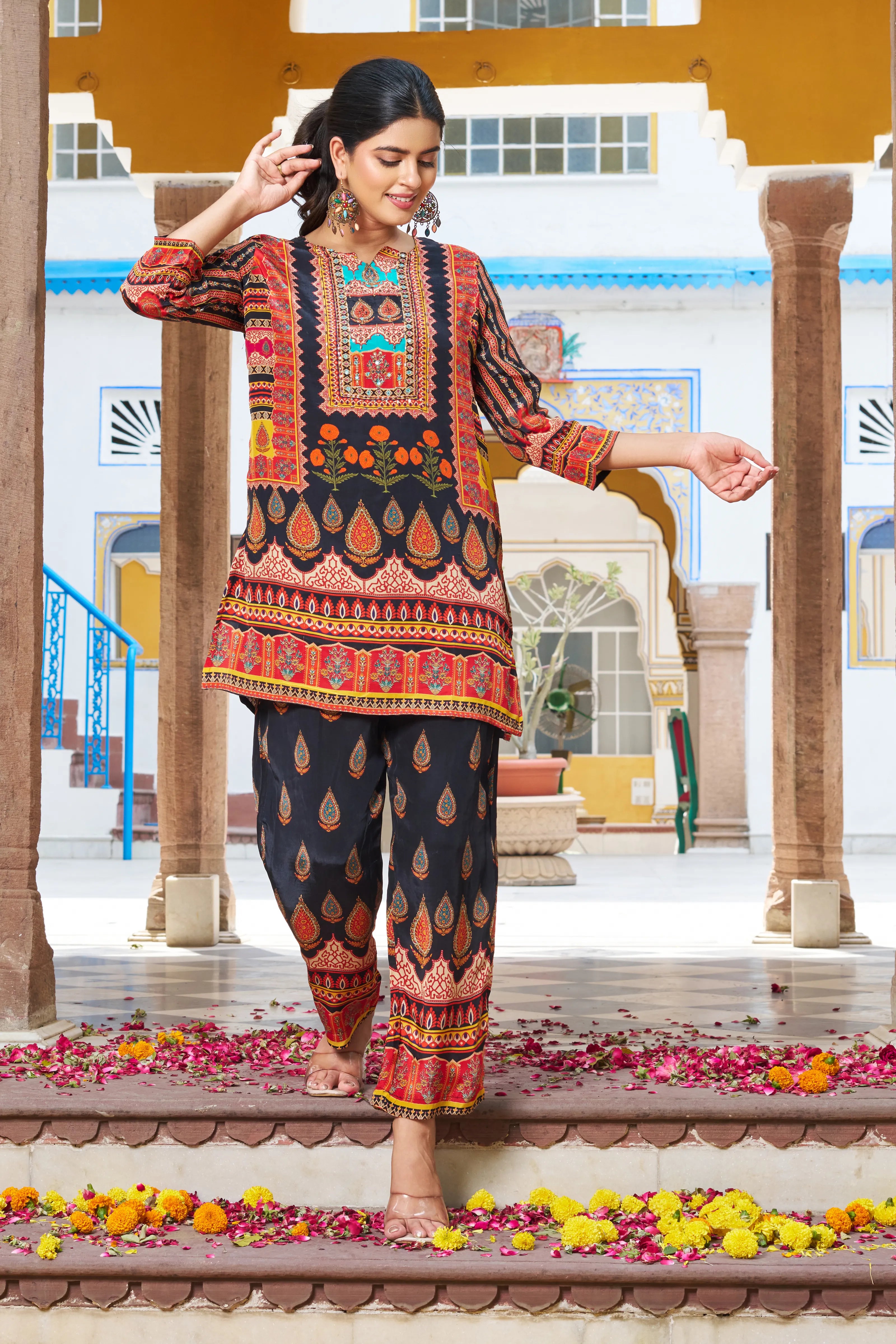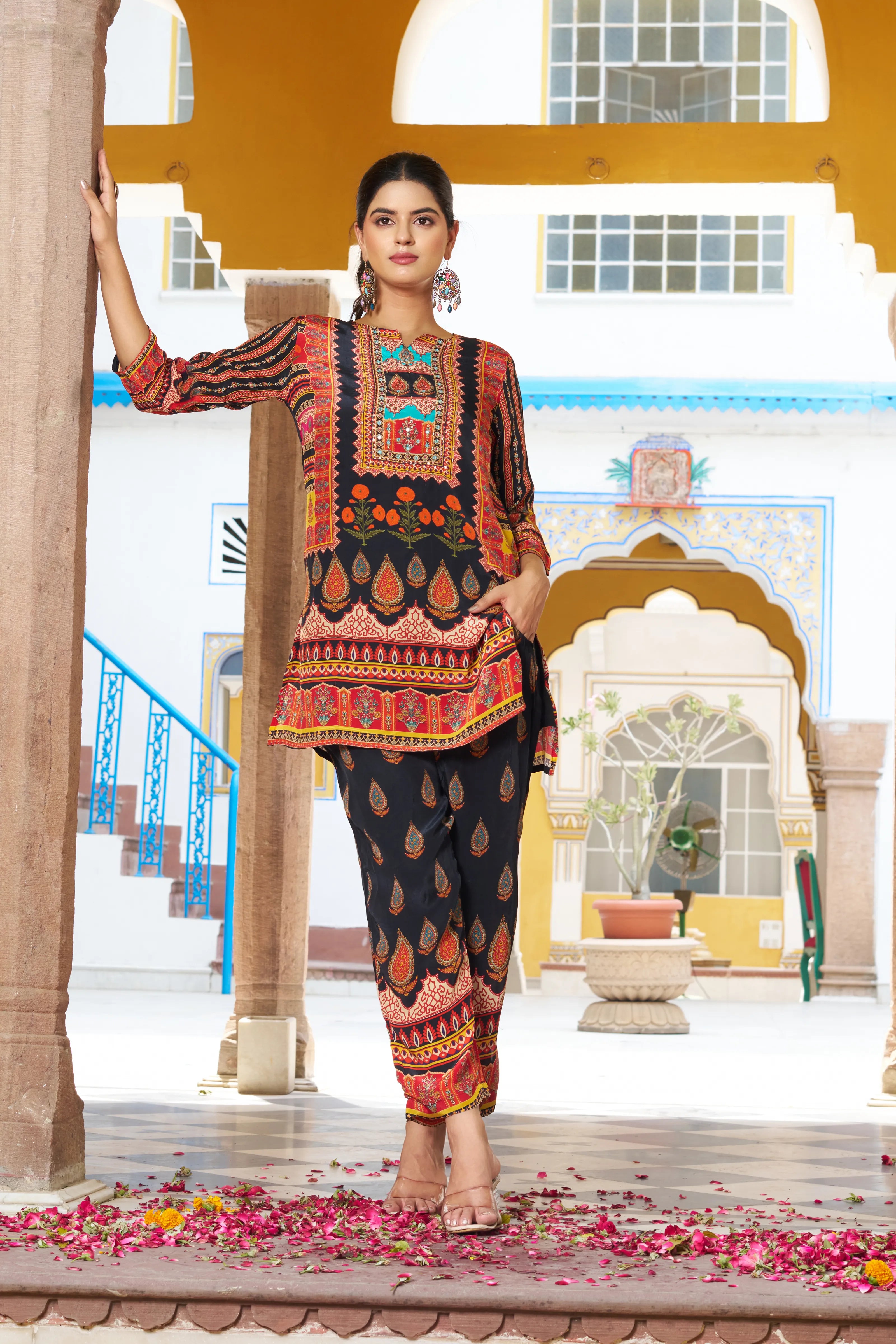 Drape yourself in festive finesse with the Noor Nights co-ord set—an ensemble where traditional vibrance meets modern comfort. Anchored on a rich black base, this look dazzles with multicolored ethnic motifs adorned with fine beads and delicate mirror work that captures light and attention alike.
