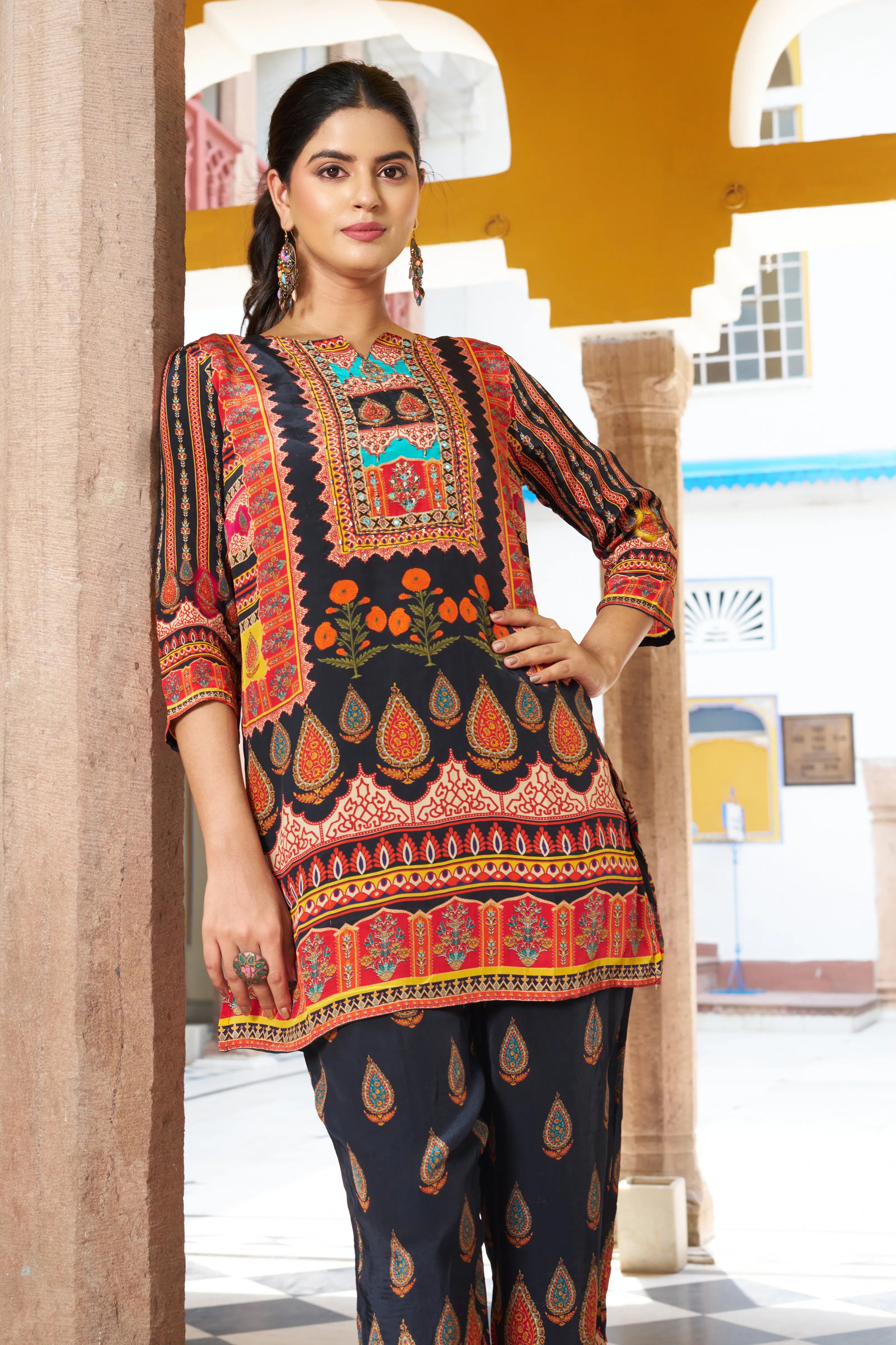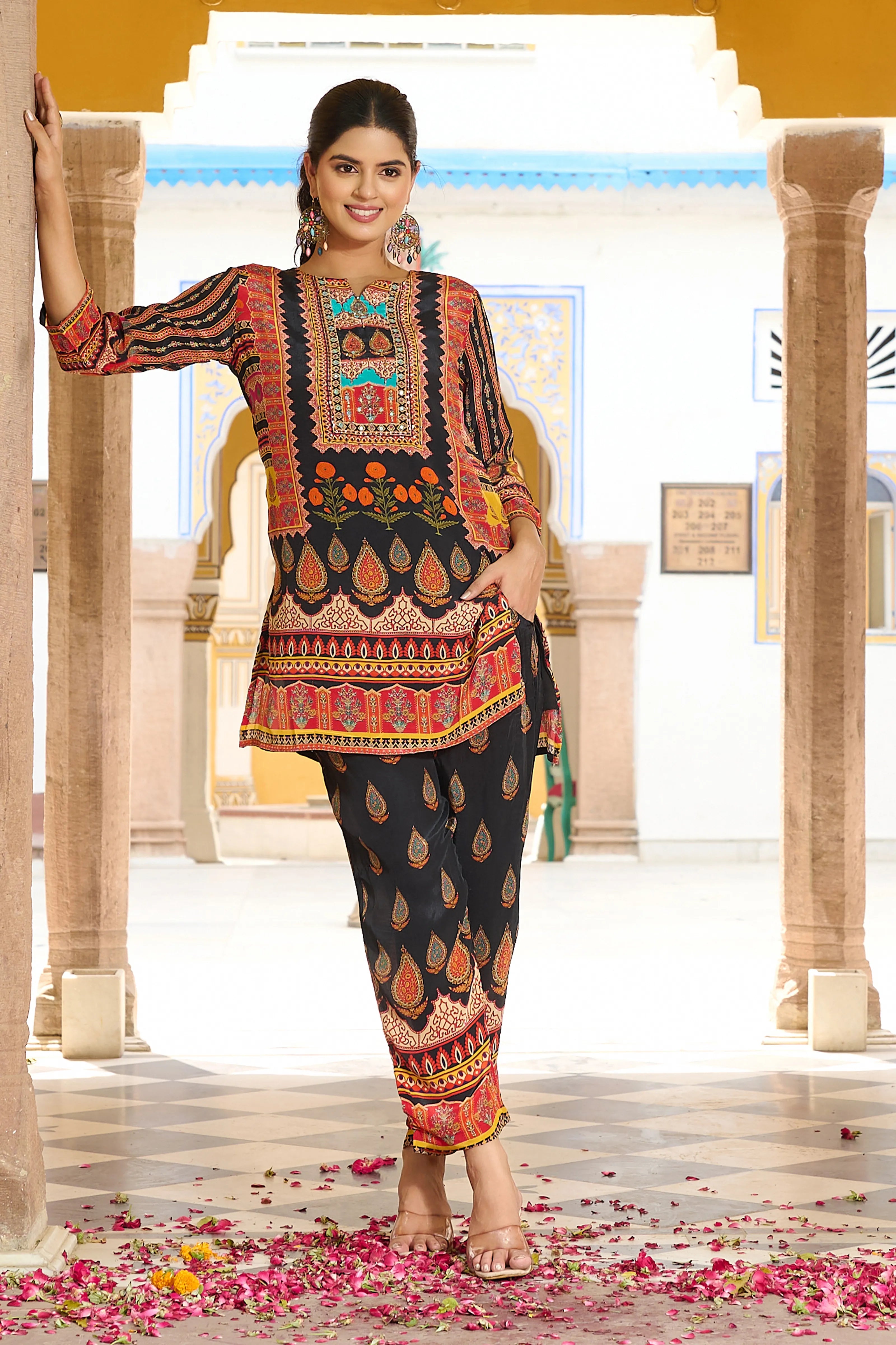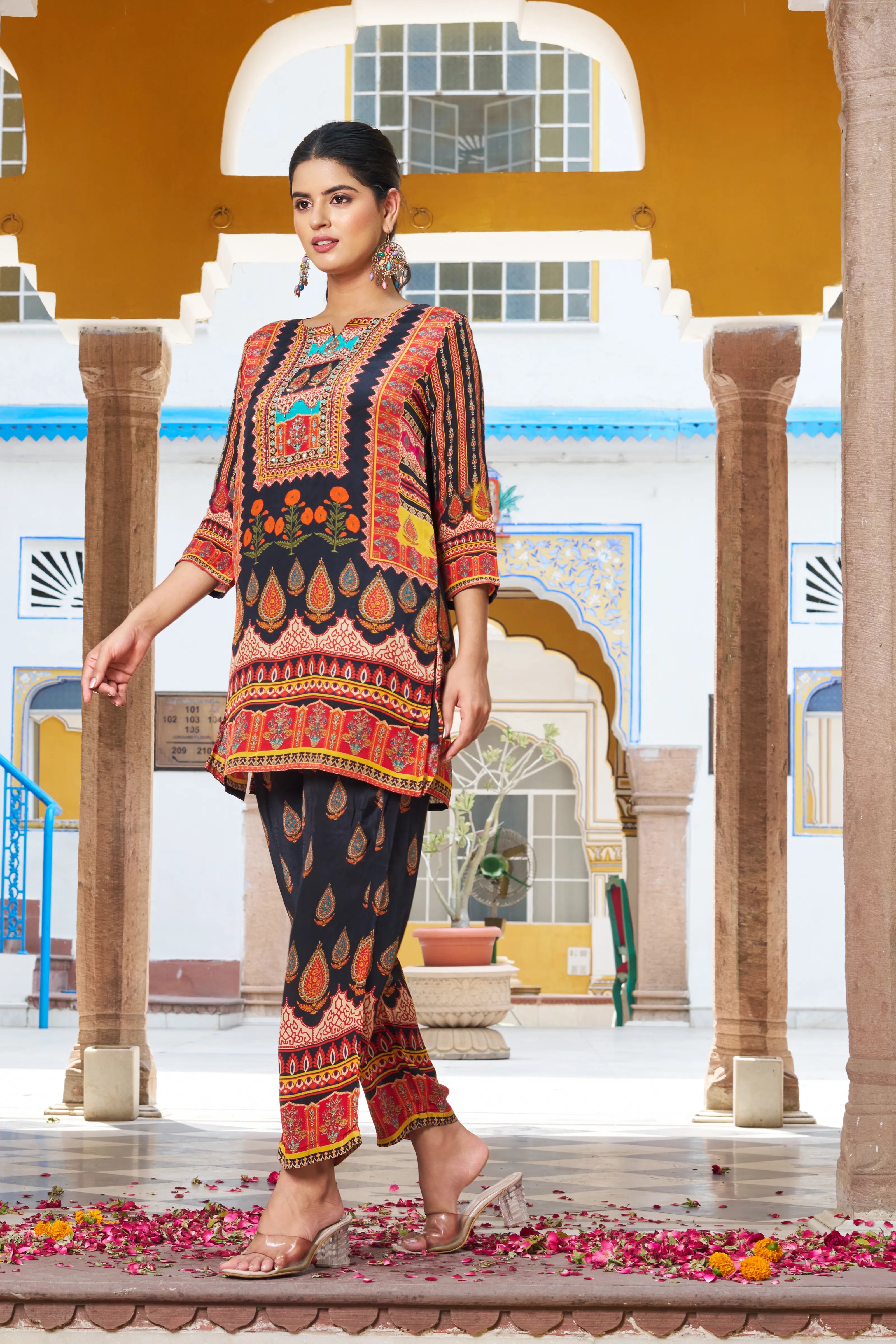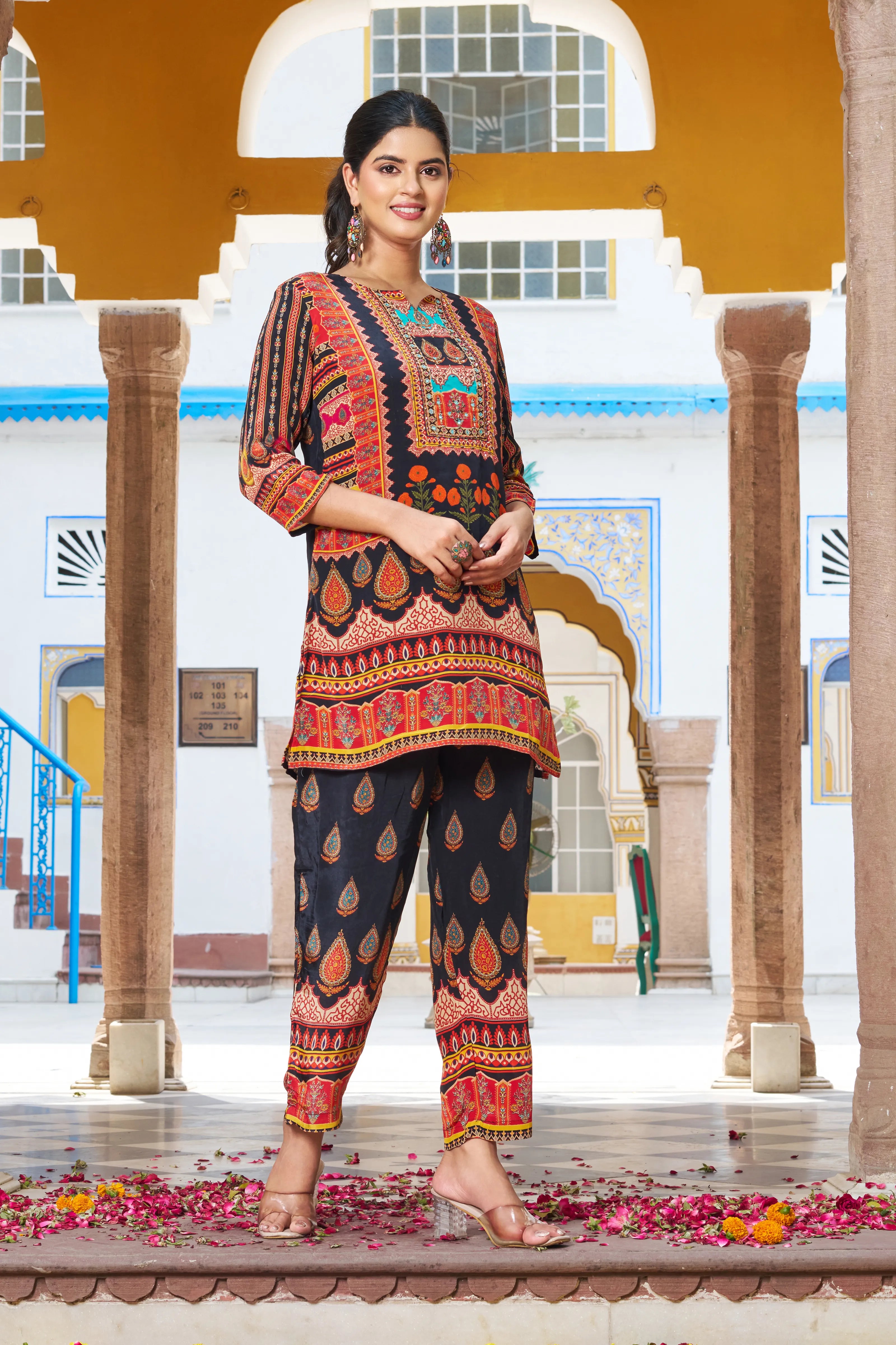 Drape yourself in festive finesse with the Noor Nights co-ord set—an ensemble where traditional vibrance meets modern comfort. Anchored on a rich black base, this look dazzles with multicolored ethnic motifs adorned with fine beads and delicate mirror work that captures light and attention alike.