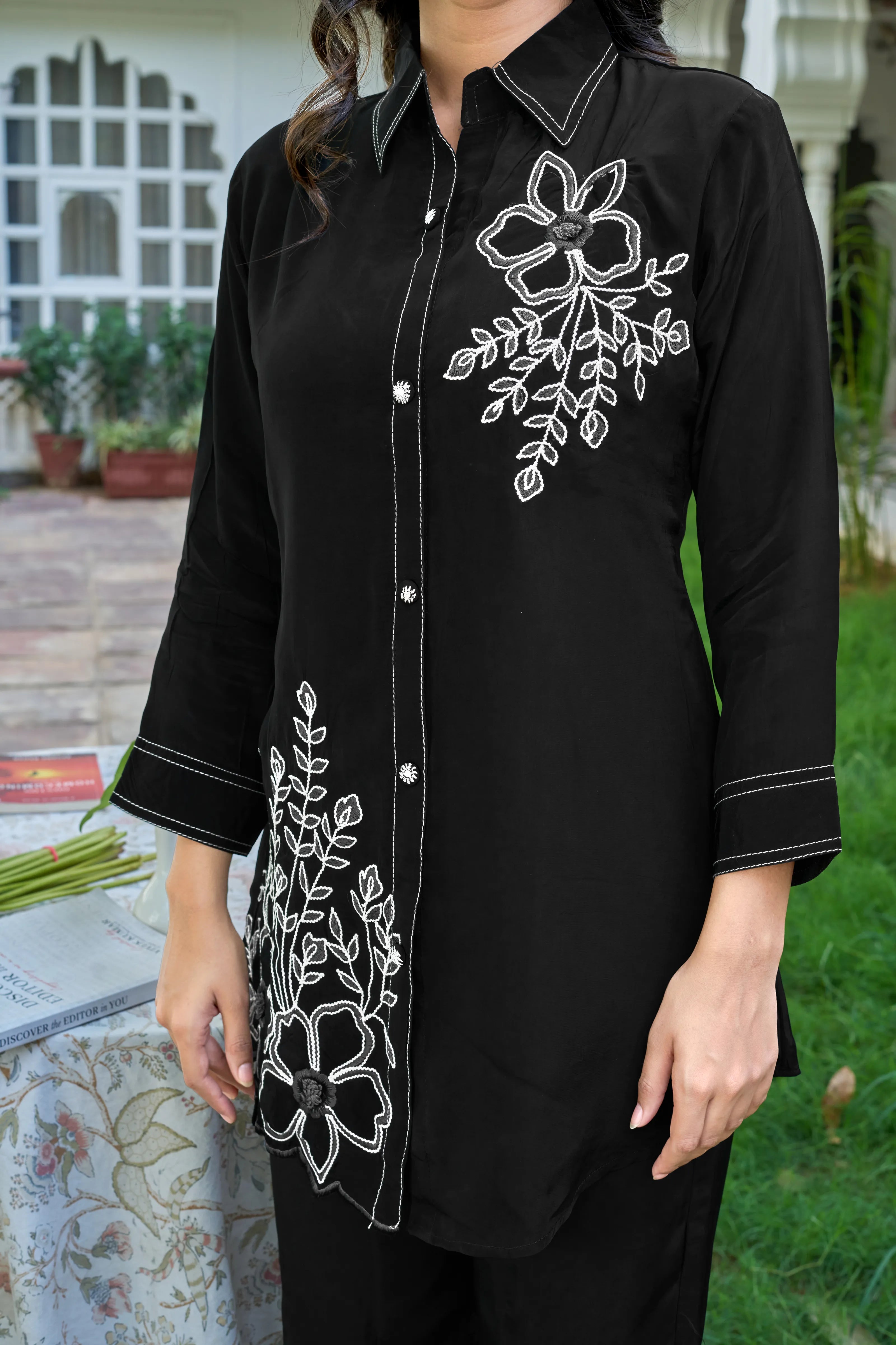 Midnight Bloom: Black Floral Contrast Stitch Co-ord Set in Natural Crepe