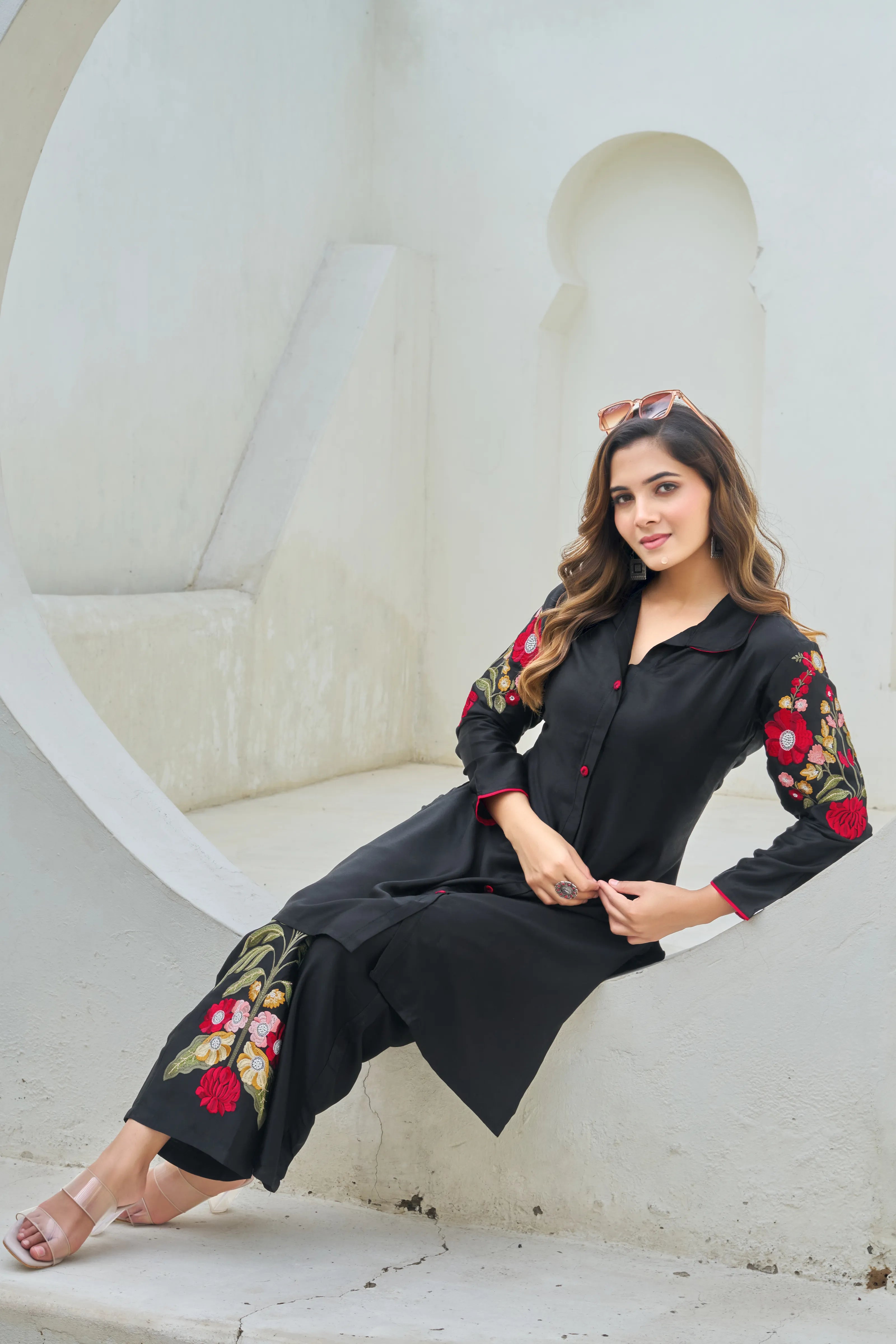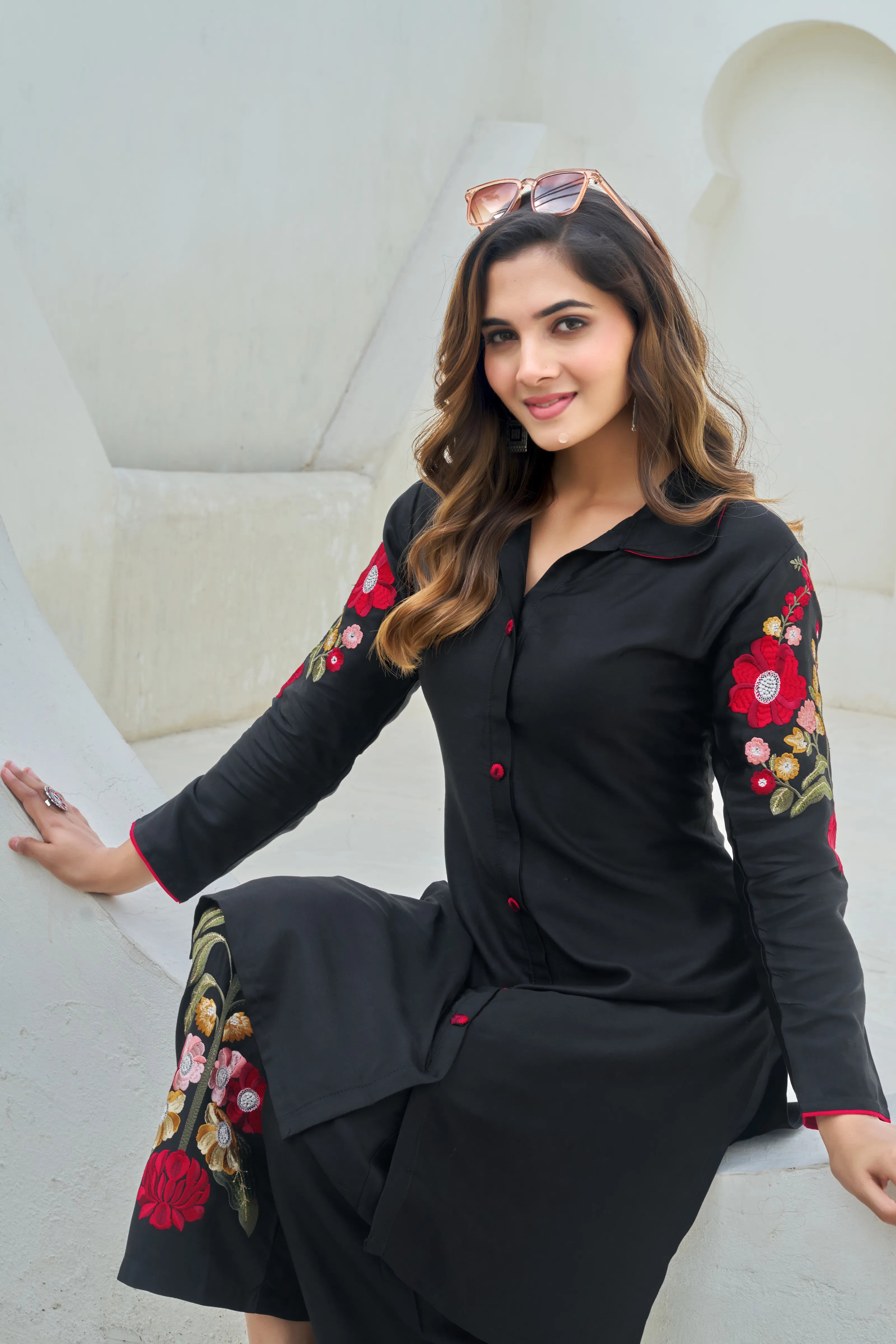 – Side slits with back floral motif embroidery