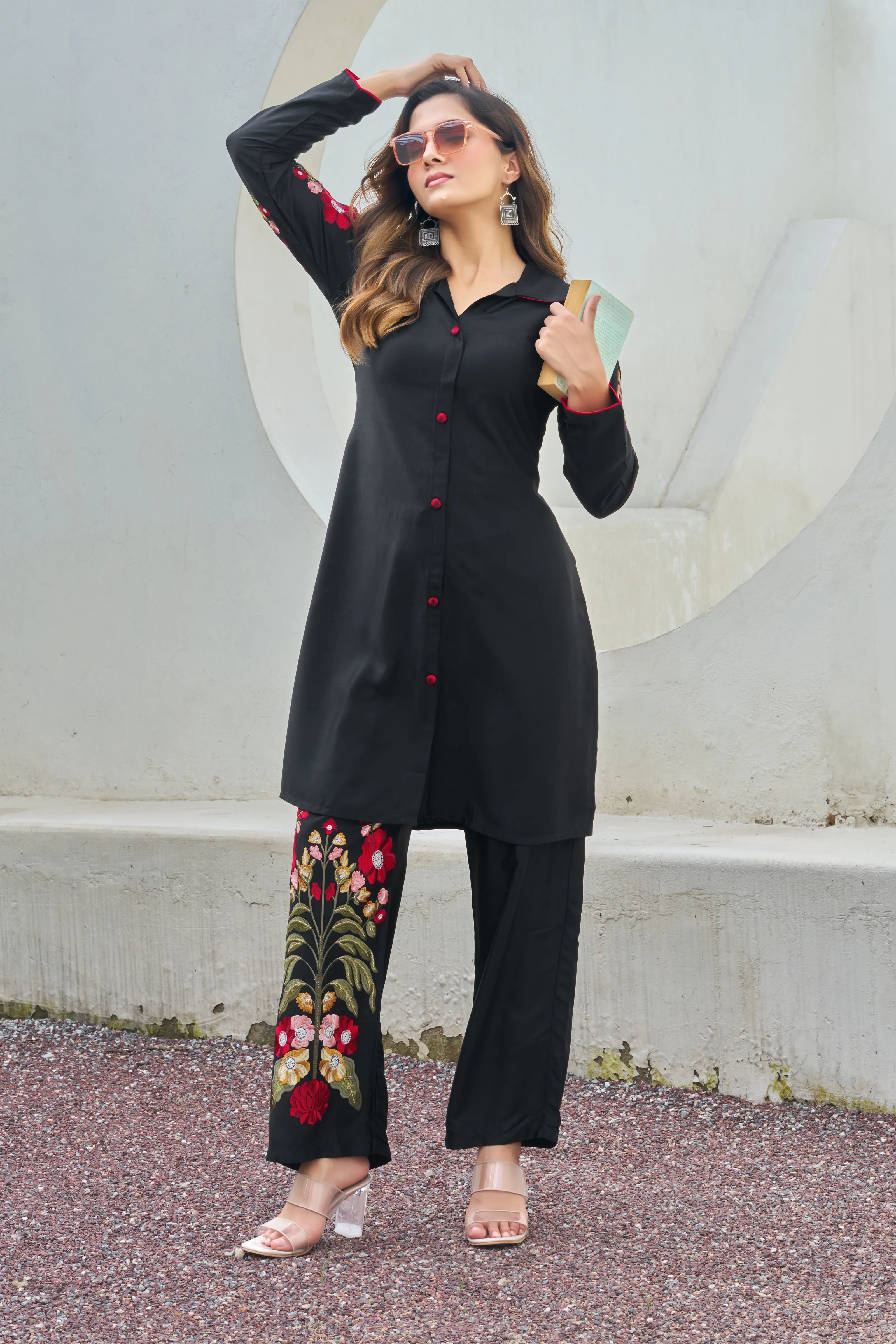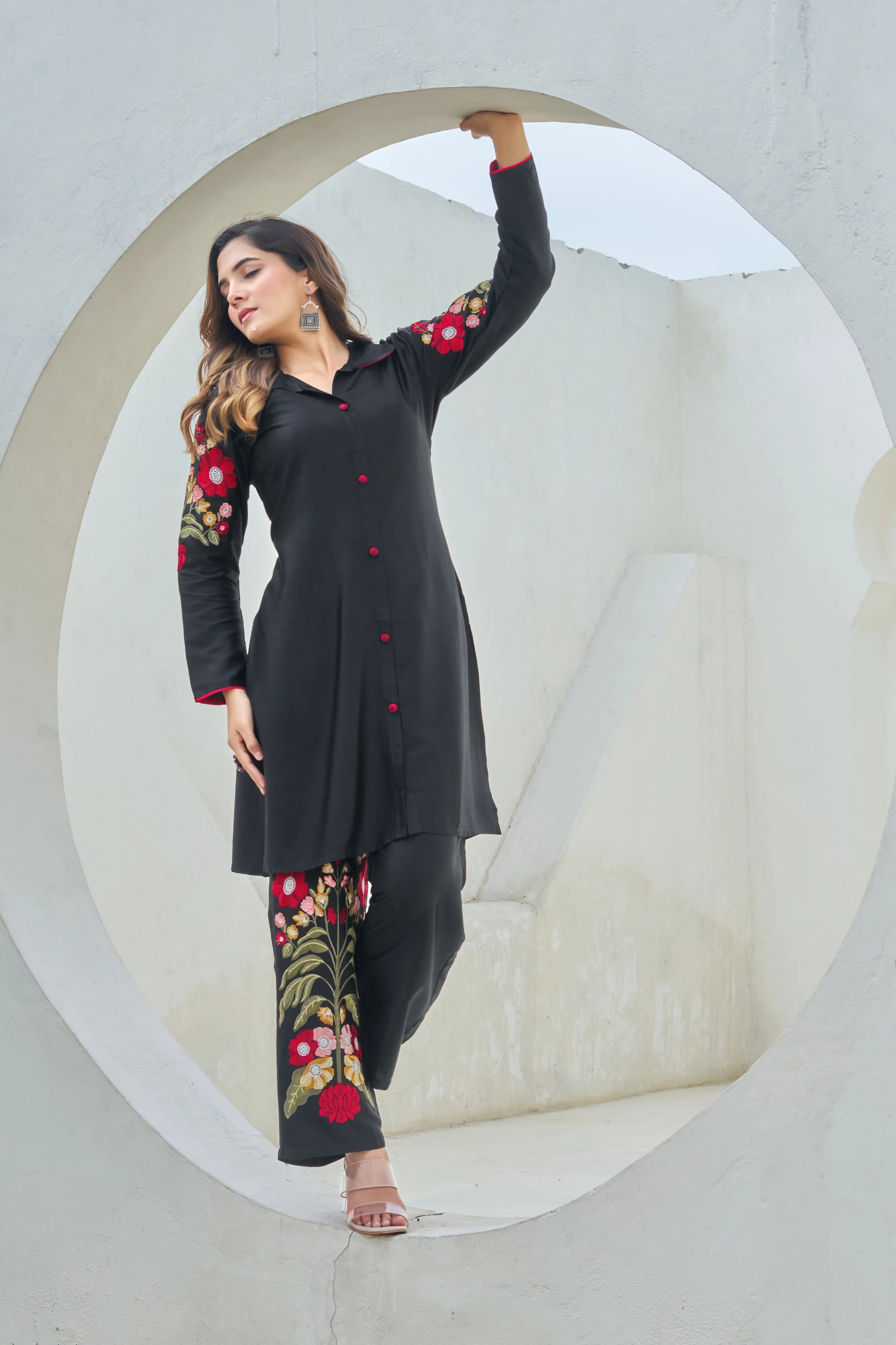 Noor-E-Kala brings bold sophistication to life with its striking black silhouette elevated by vibrant floral embroidery. This shirt-collar co-ord set in viscose silk twill features multicolor thread and lurex embroidery across the sleeves, back, and pant hem for a contemporary yet culturally rich statement. The fabric-covered button-down front and side slits add finesse to the longline kurta, while the elasticated straight pants ensure all-day comfort.