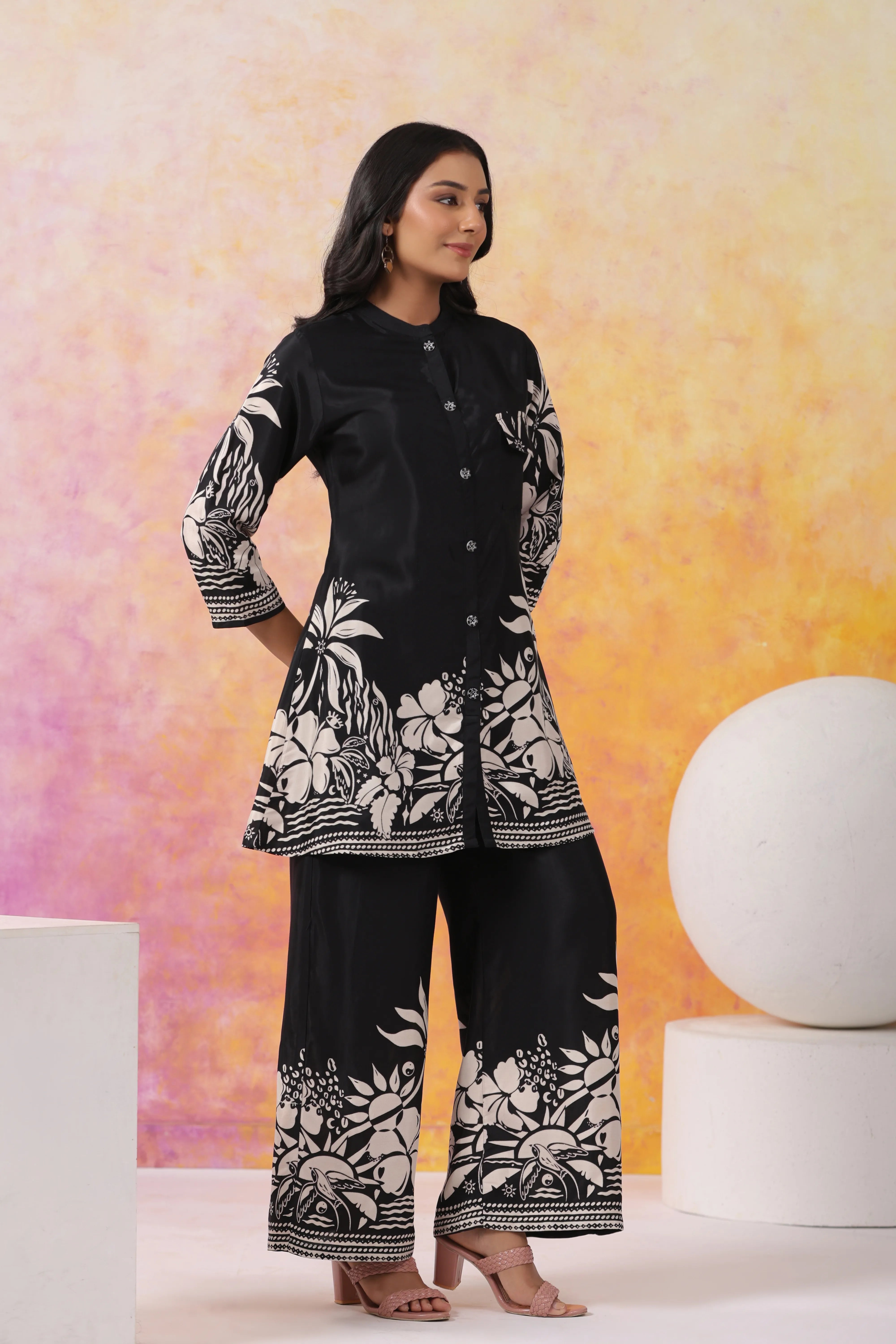 Redefine elegance with this Black Floral Printed Co-Ord Set, crafted from luxurious Russian silk. The striking crystal black top features a bold cream floral print, round neck, and 3/4th sleeves, accentuated by shell buttons for a sophisticated touch. Paired with matching bottoms, this two-piece set offers a cohesive and stylish look for casual or semi-formal occasions.