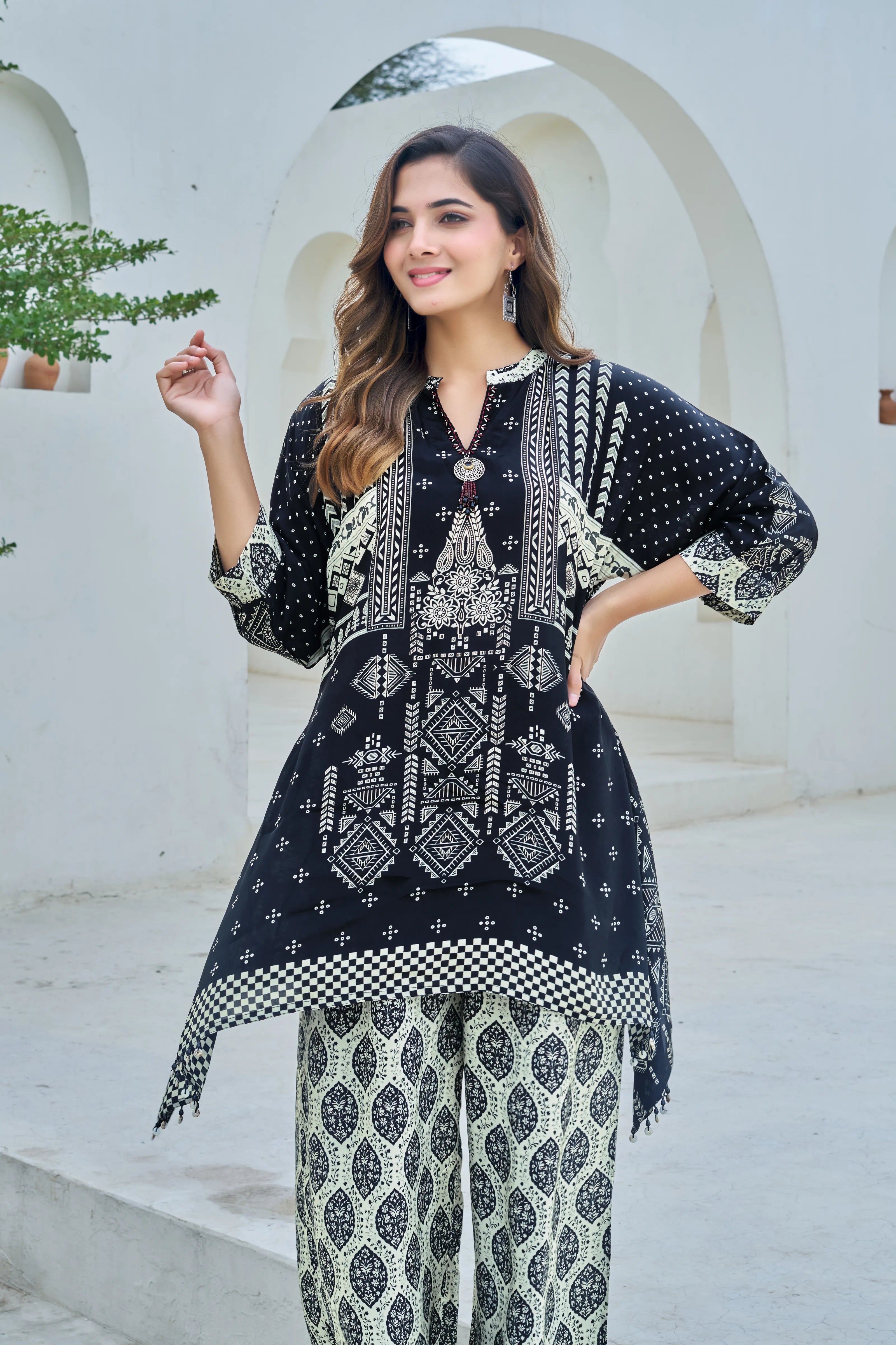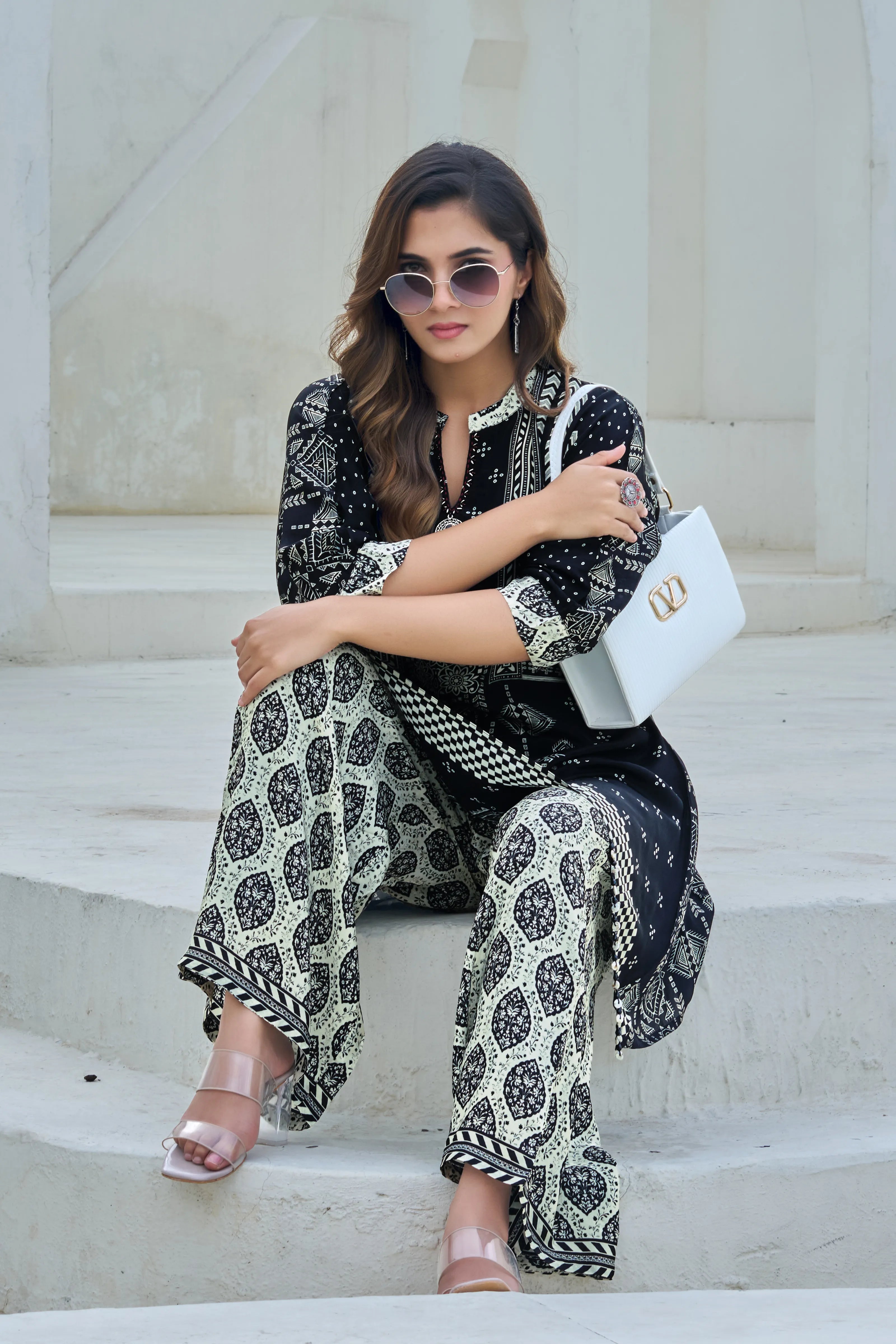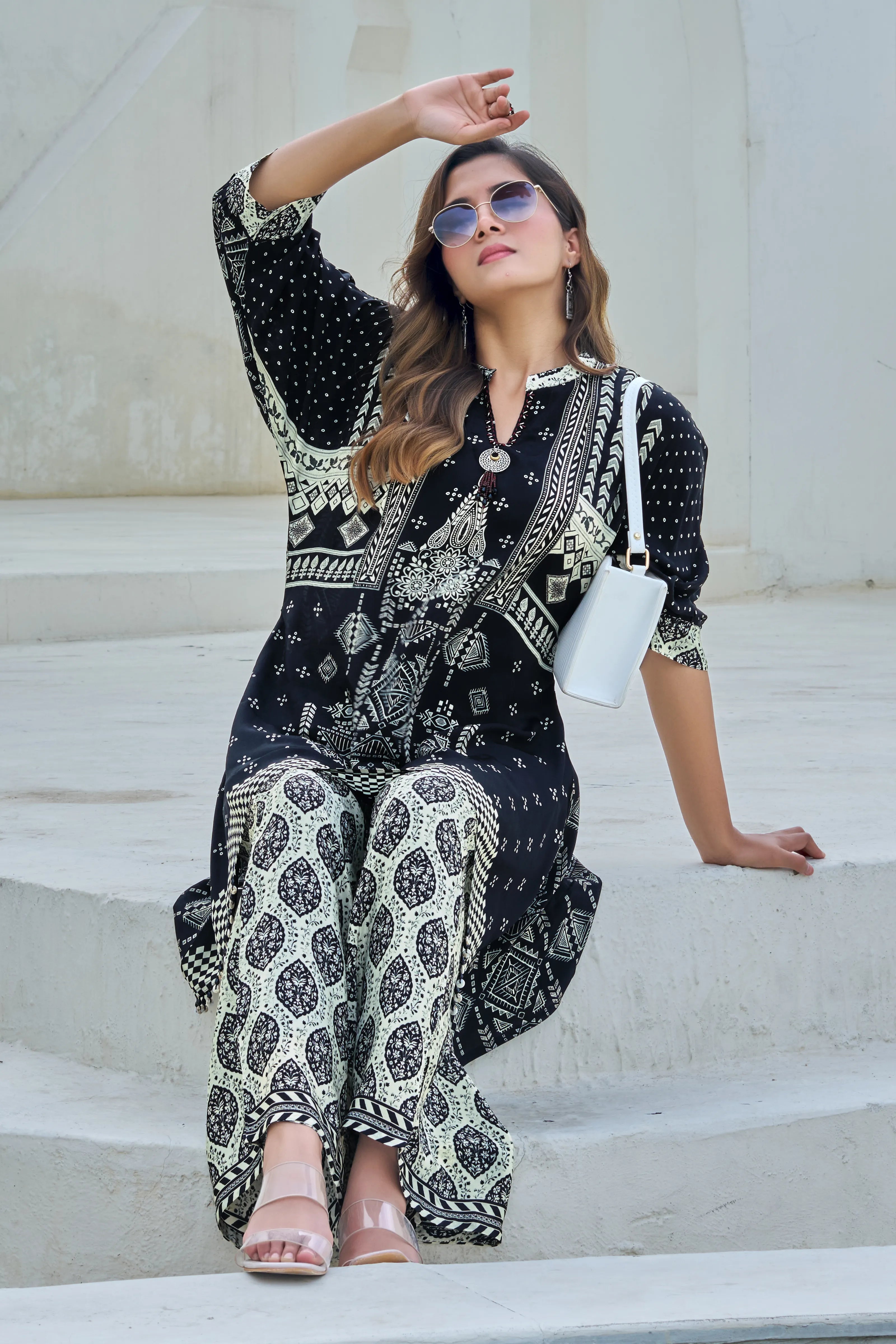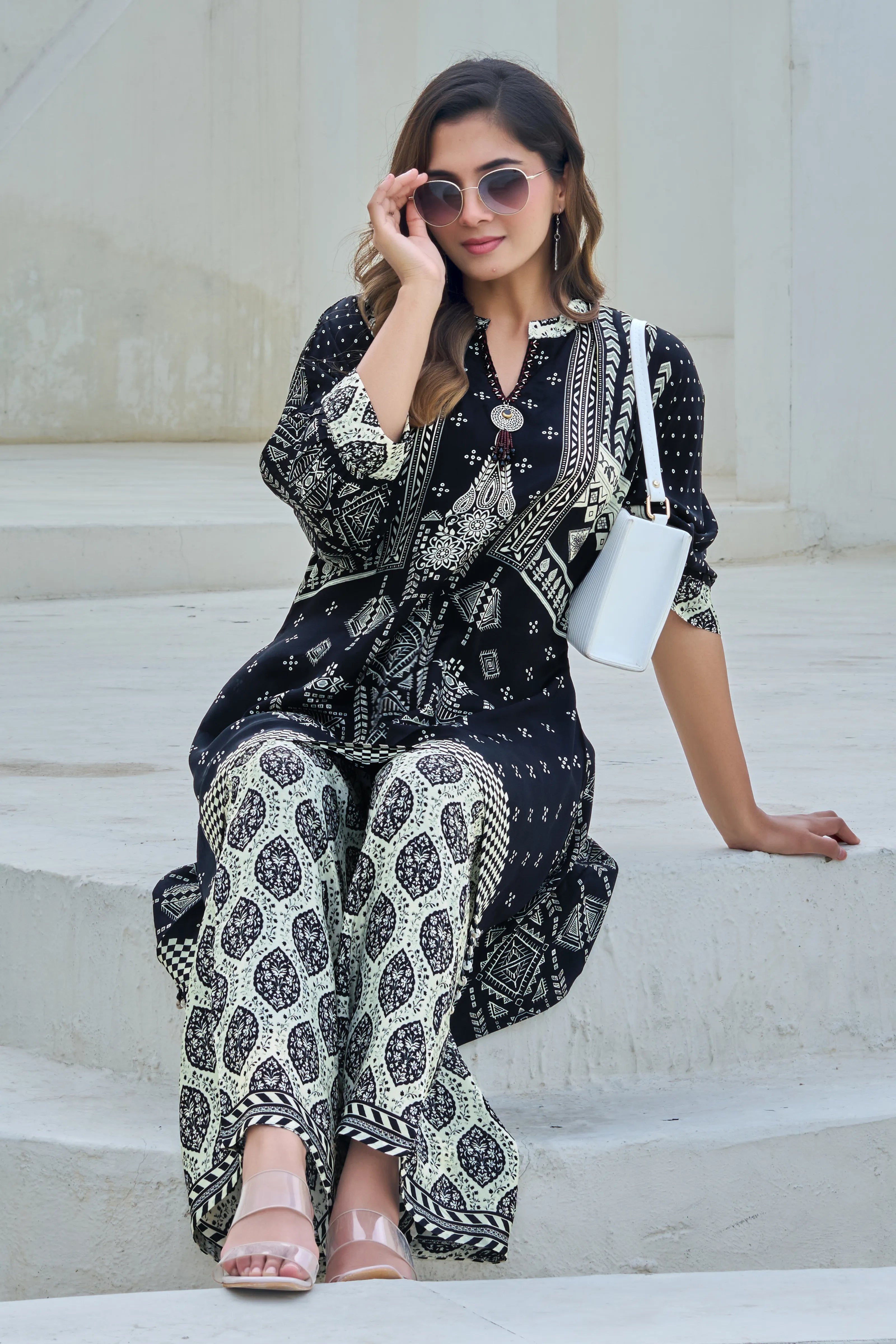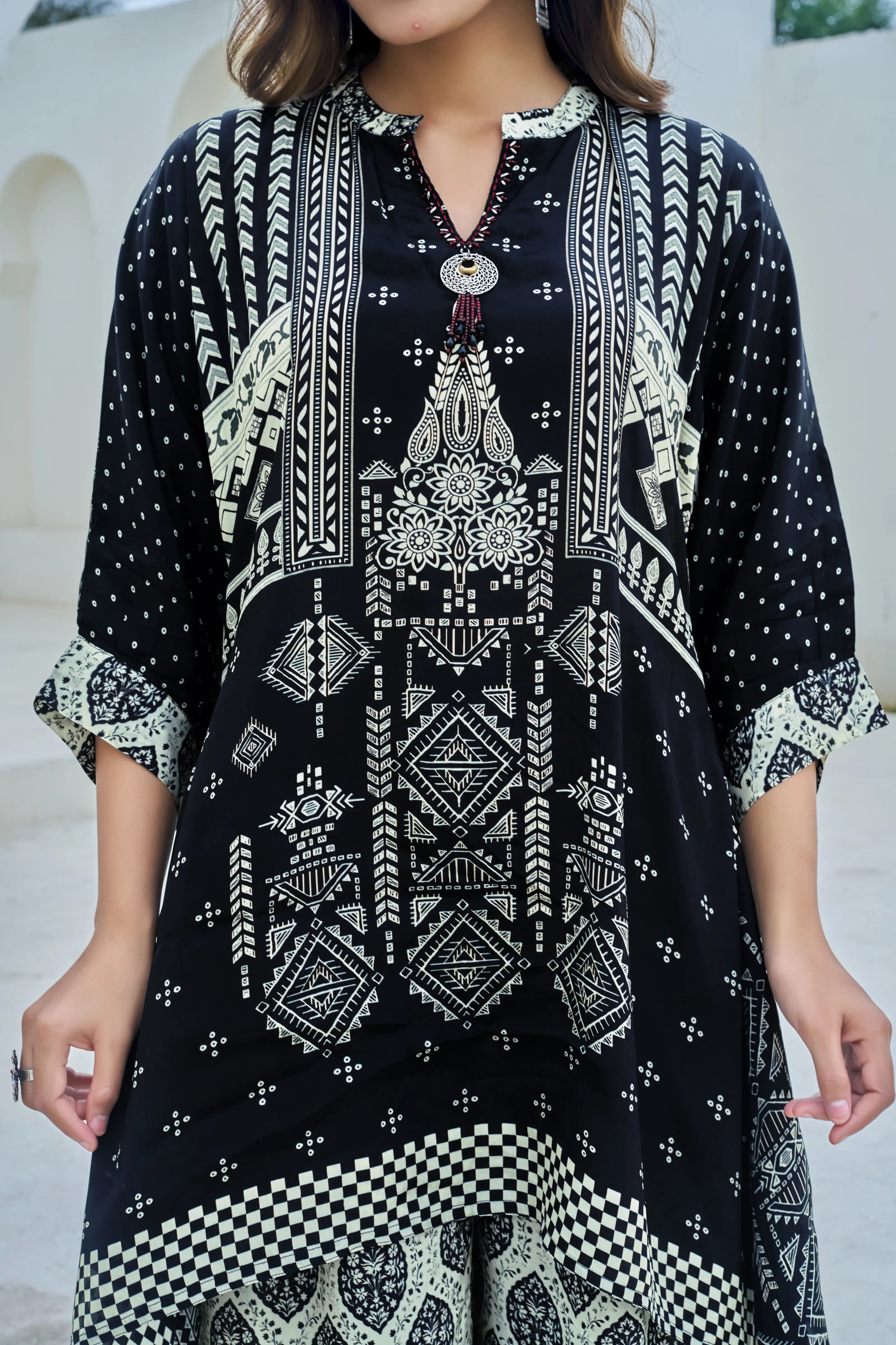 Ivory Whisper: Black & Ivory Ethnic Motif Viscose Silk Co-ord Set