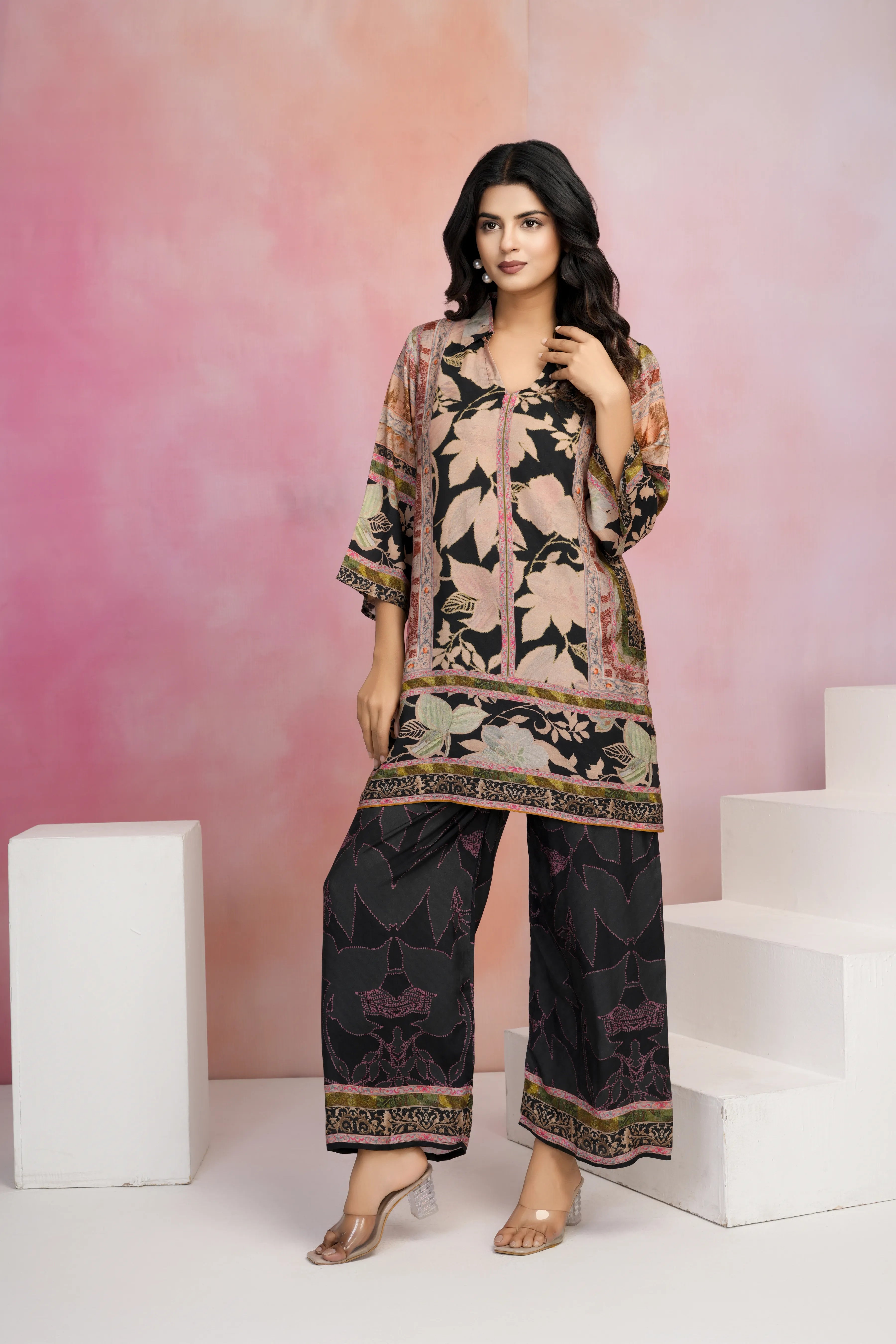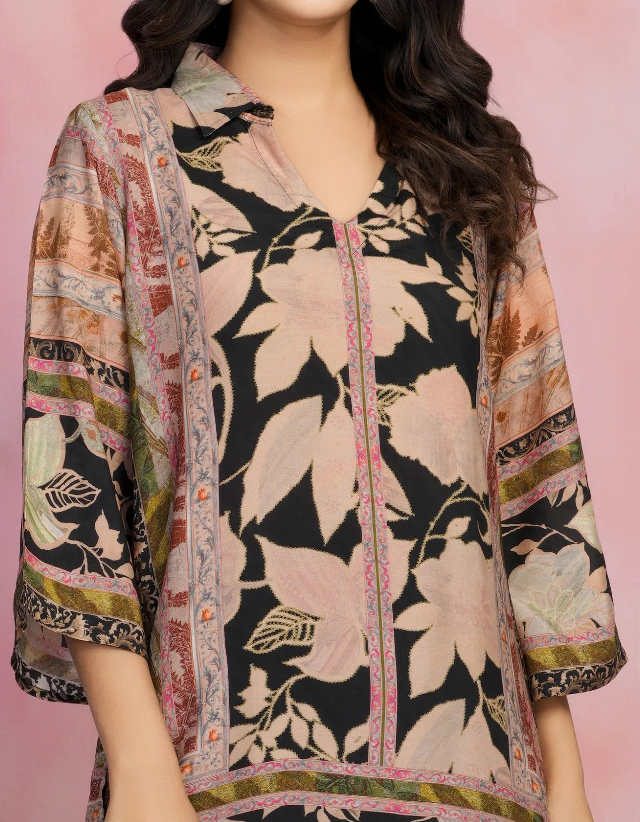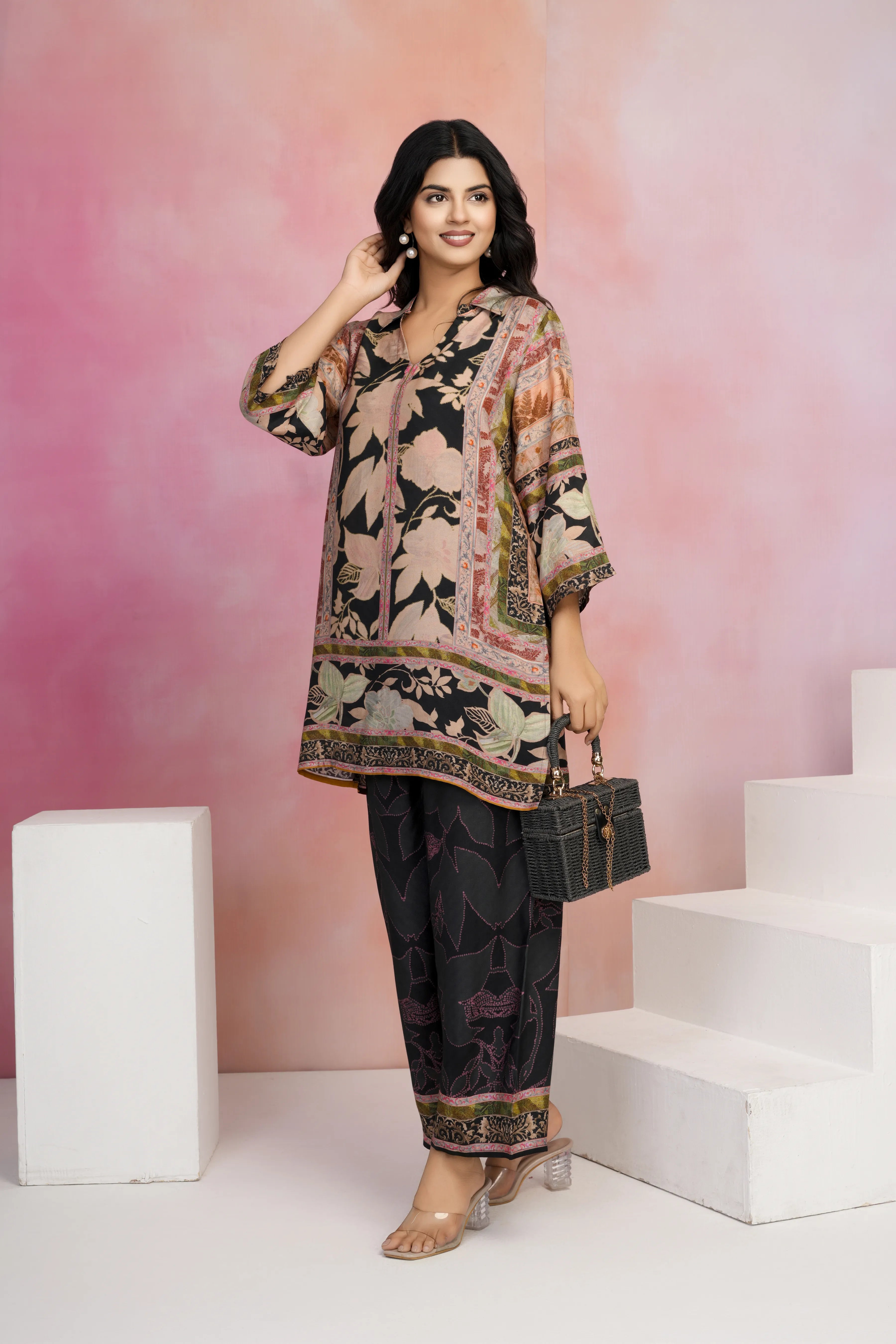 - Kurta: Black Base with Multicolor Print, V-Neck, Shirt Collar, 3/4th Sleeves