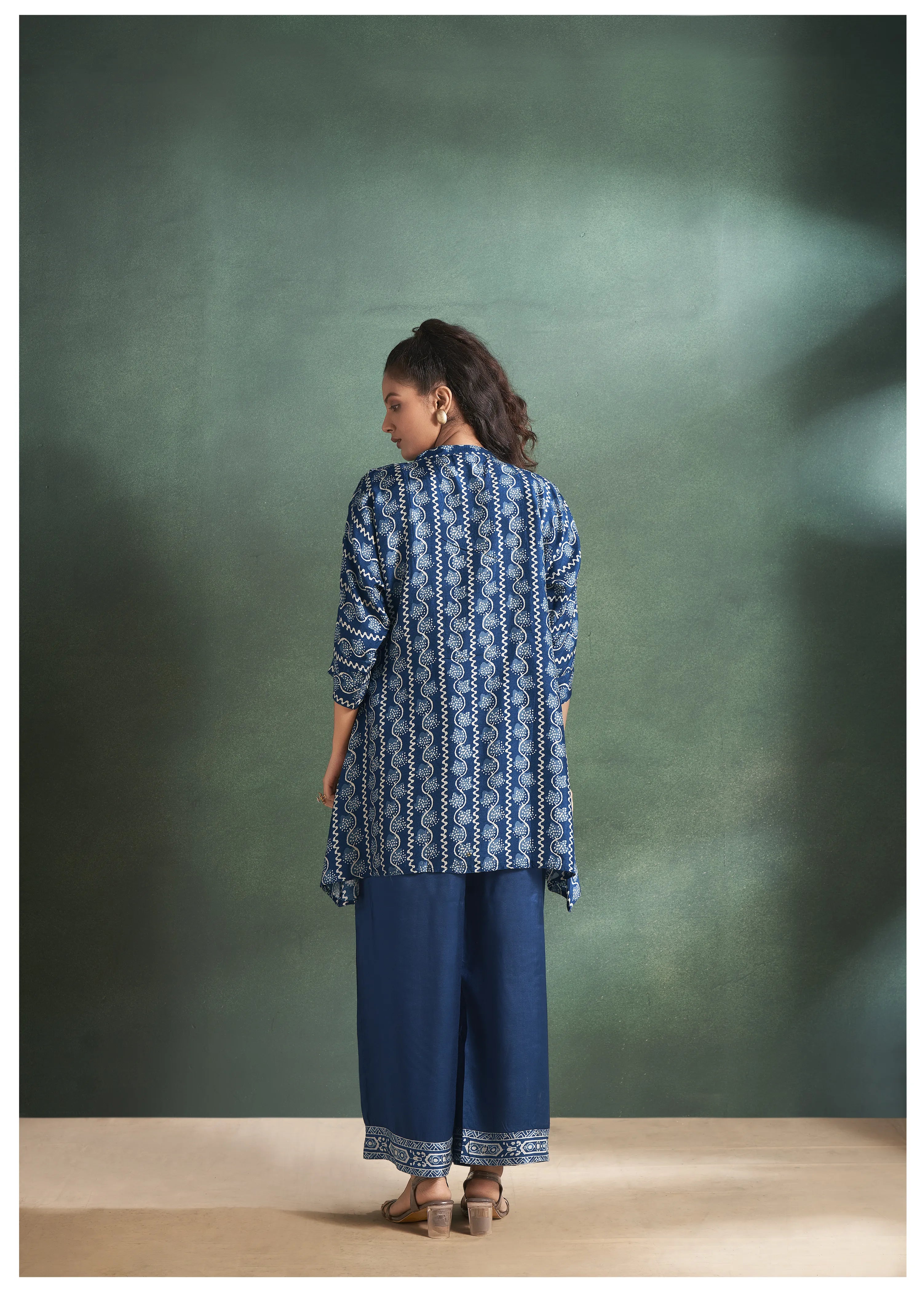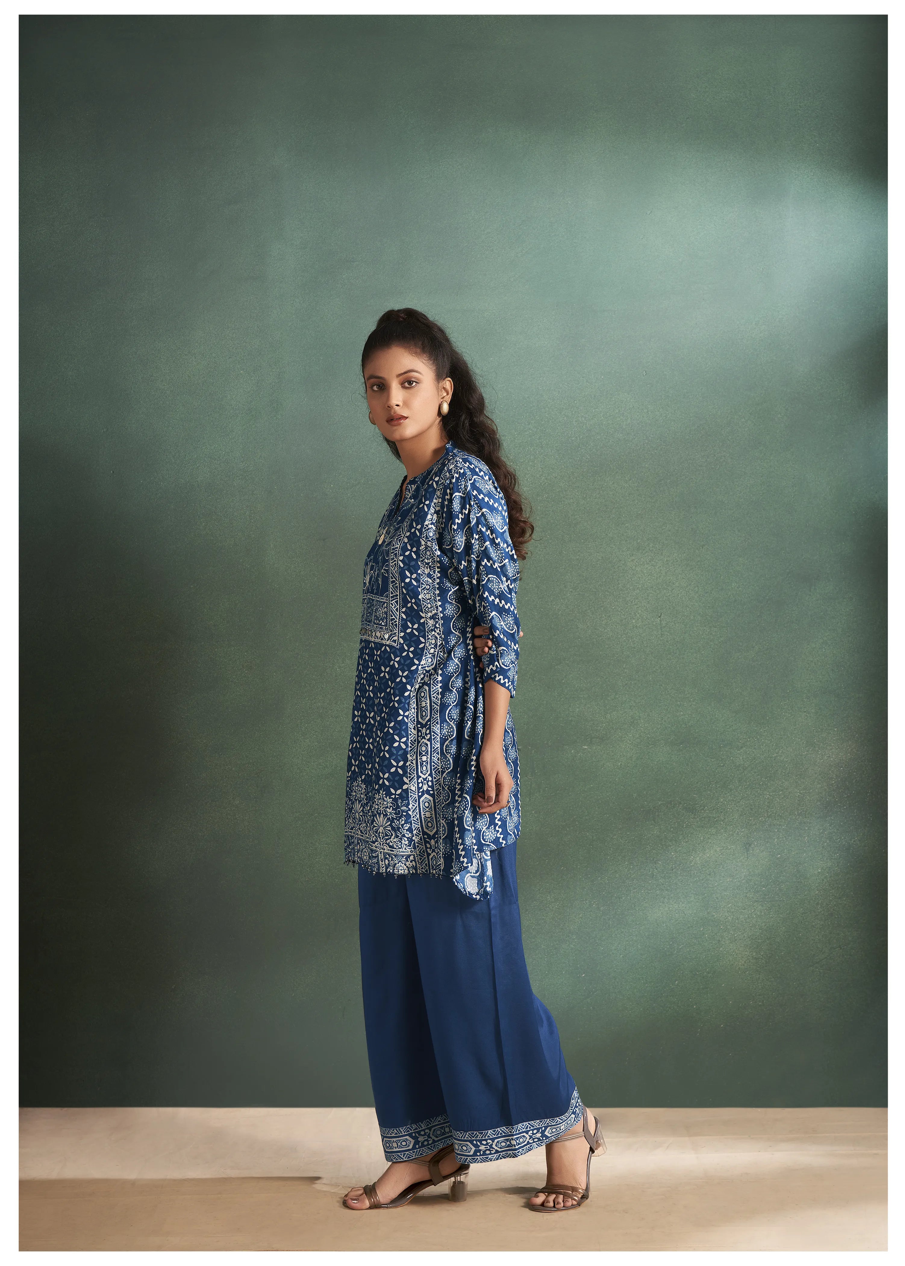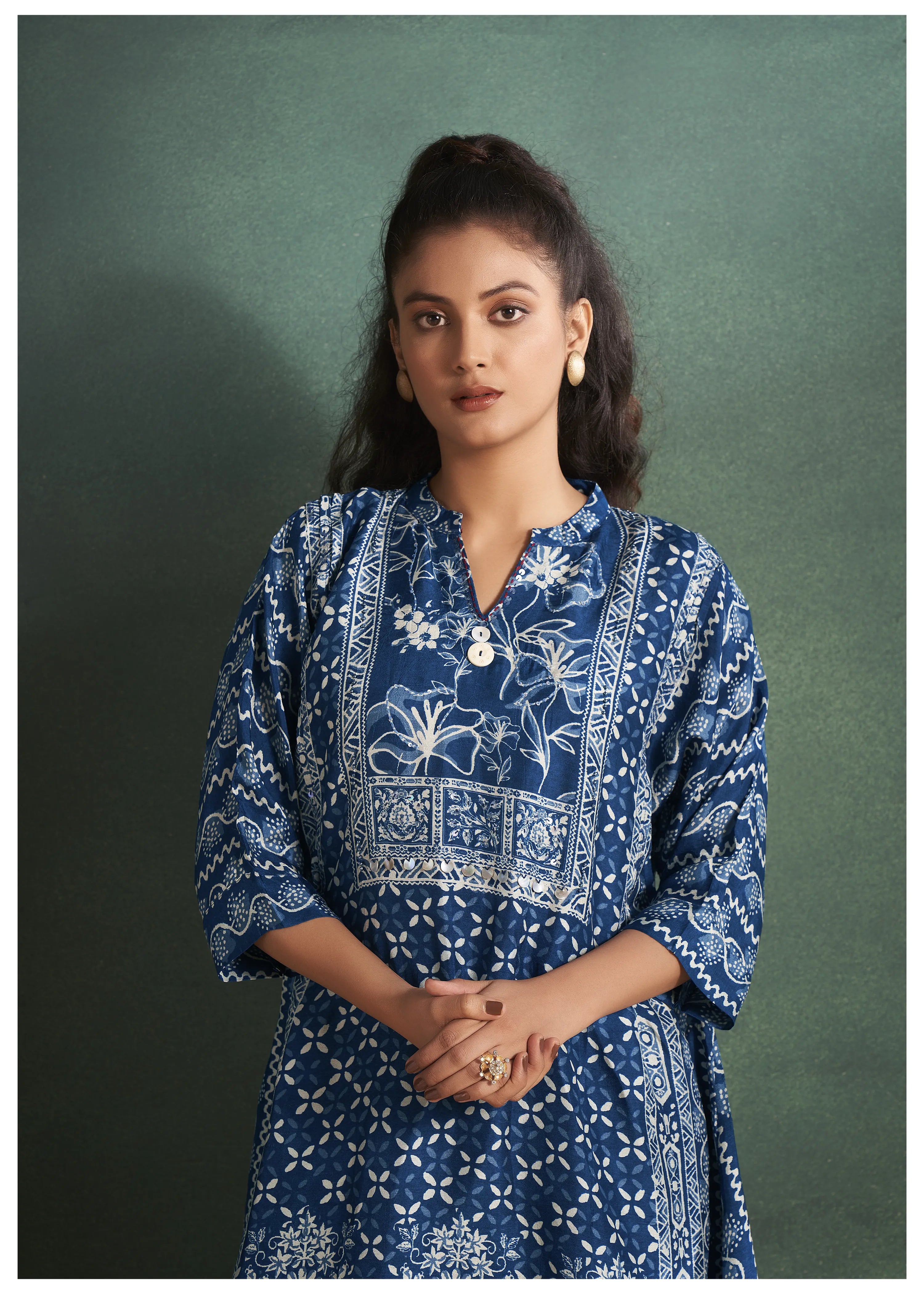 This Blue Floral Abstract Dola Silk Printed Kurta Set offers an effortless combination of elegance and comfort, making it a standout piece for any occasion.