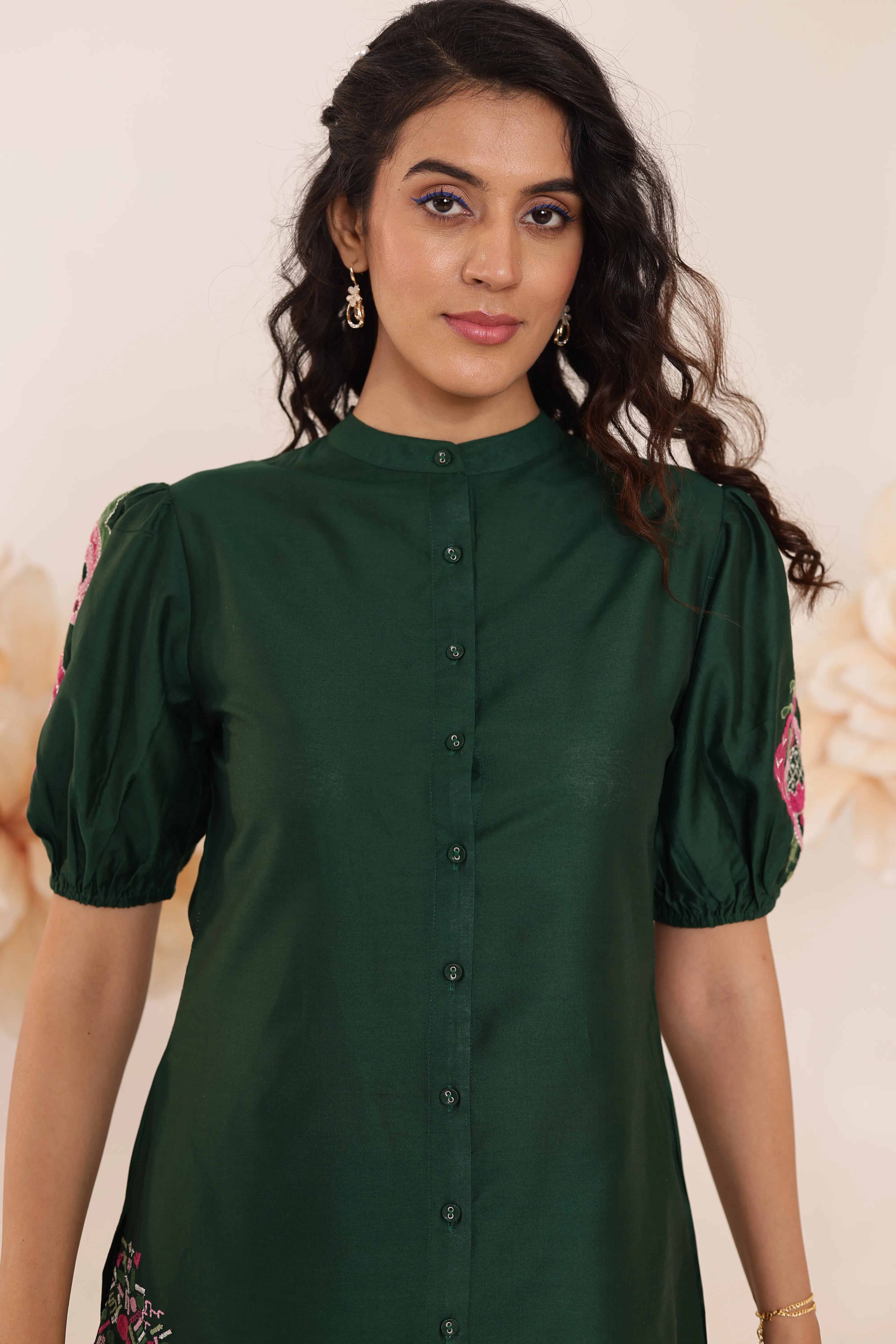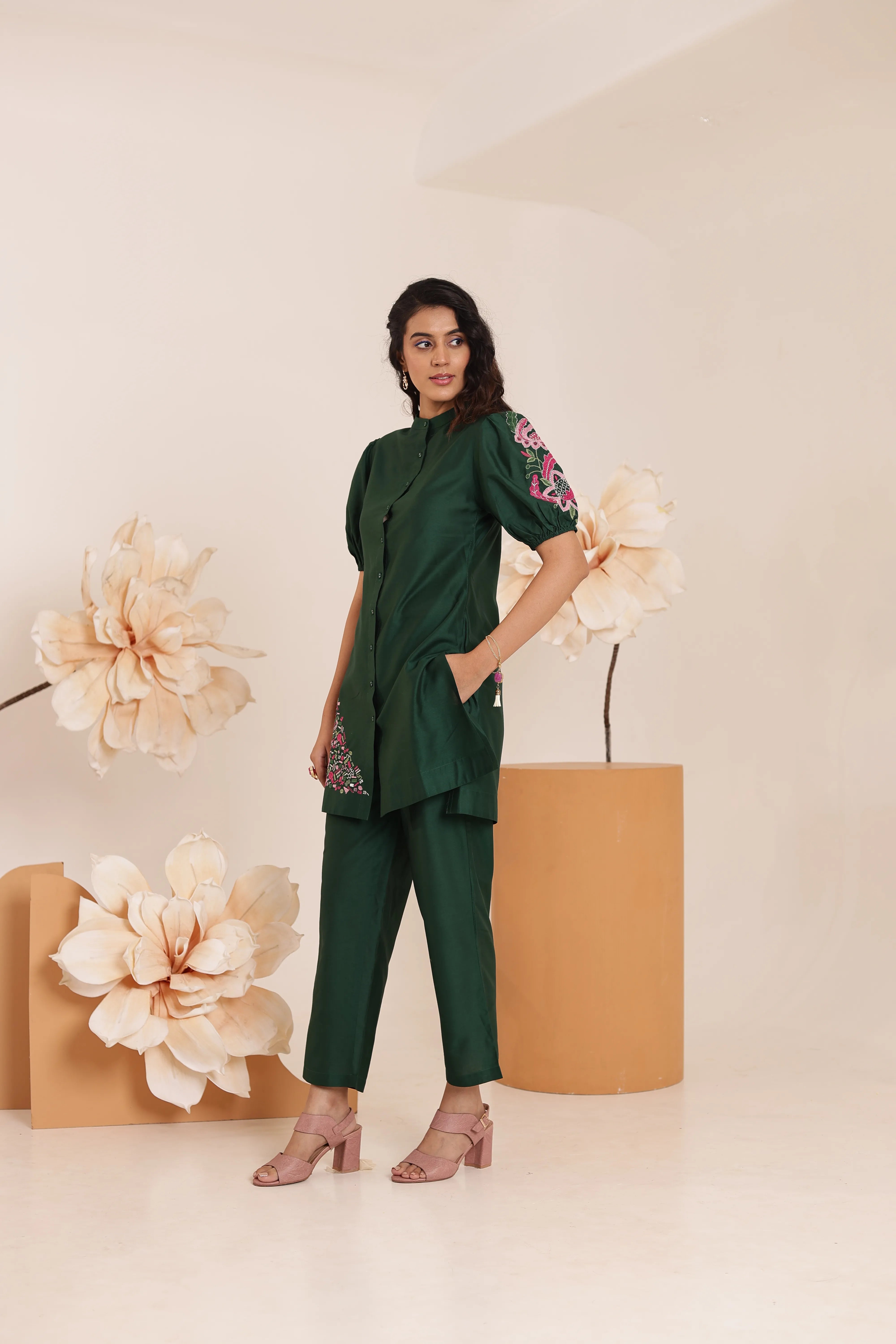 Bottle Green Cotton Modal Placement Embroidered Patch Co-Ord Set