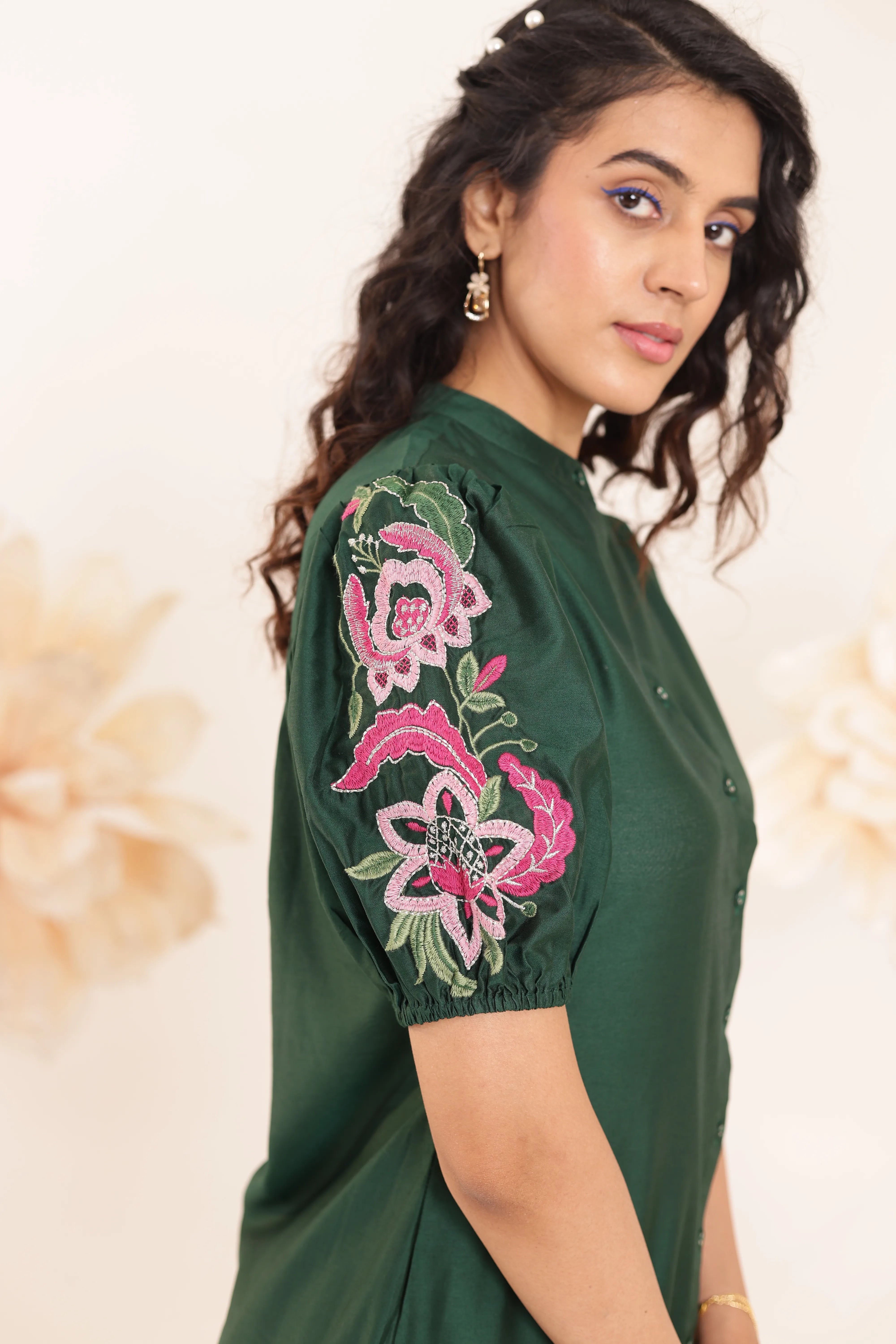 Enhance your wardrobe with this Bottle Green Cotton Modal Co-Ord Set, blending modern style with unmatched comfort. Featuring a chic shirt collar design, the top showcases intricate placement multi-thread embroidery. Elasticated short sleeves and hem ensure a relaxed fit, while unique pignose buttons add a contemporary touch.