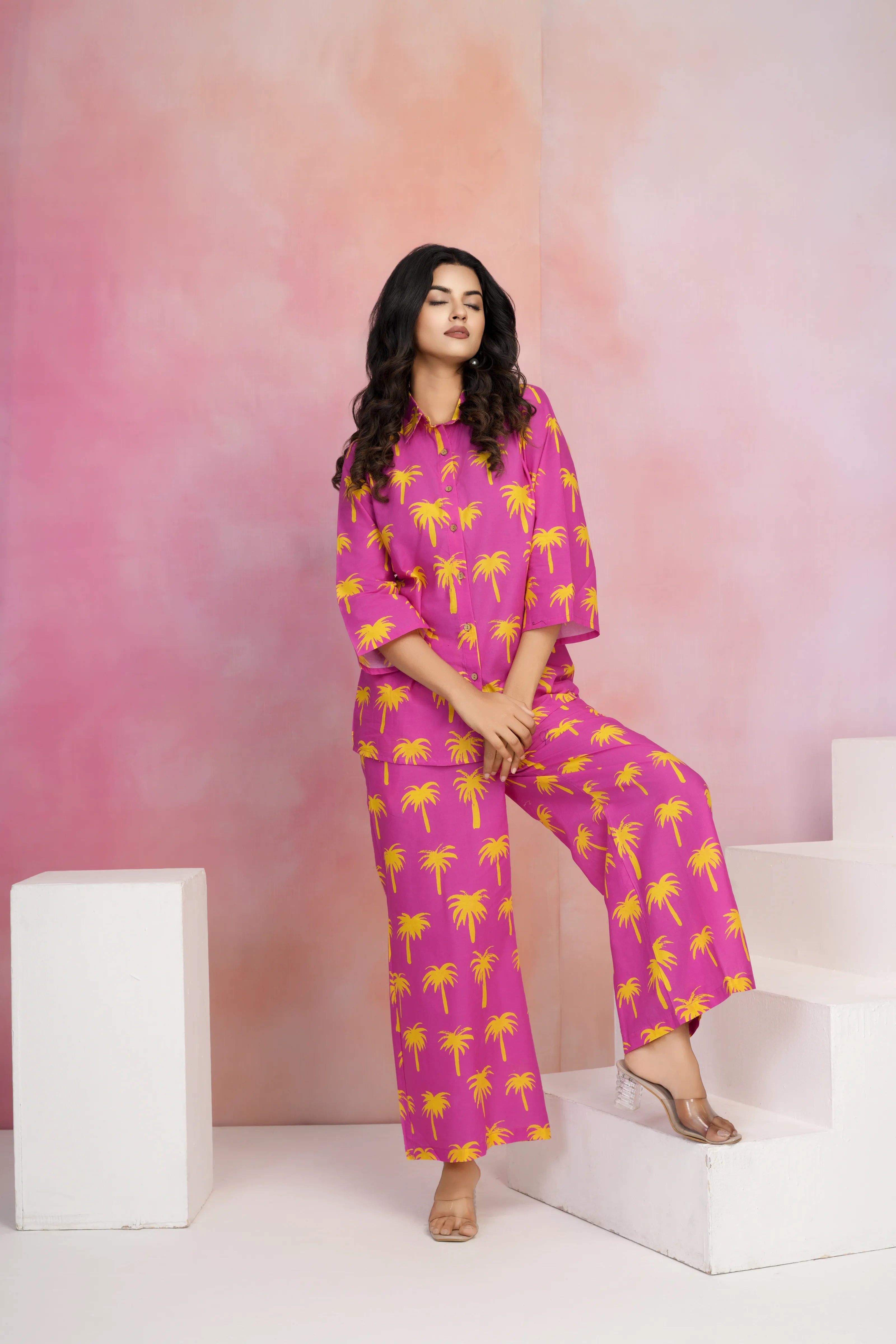 Palm Pop: Bright Pink Printed Shirt Collar Co-ord Set in Cotton Cambric