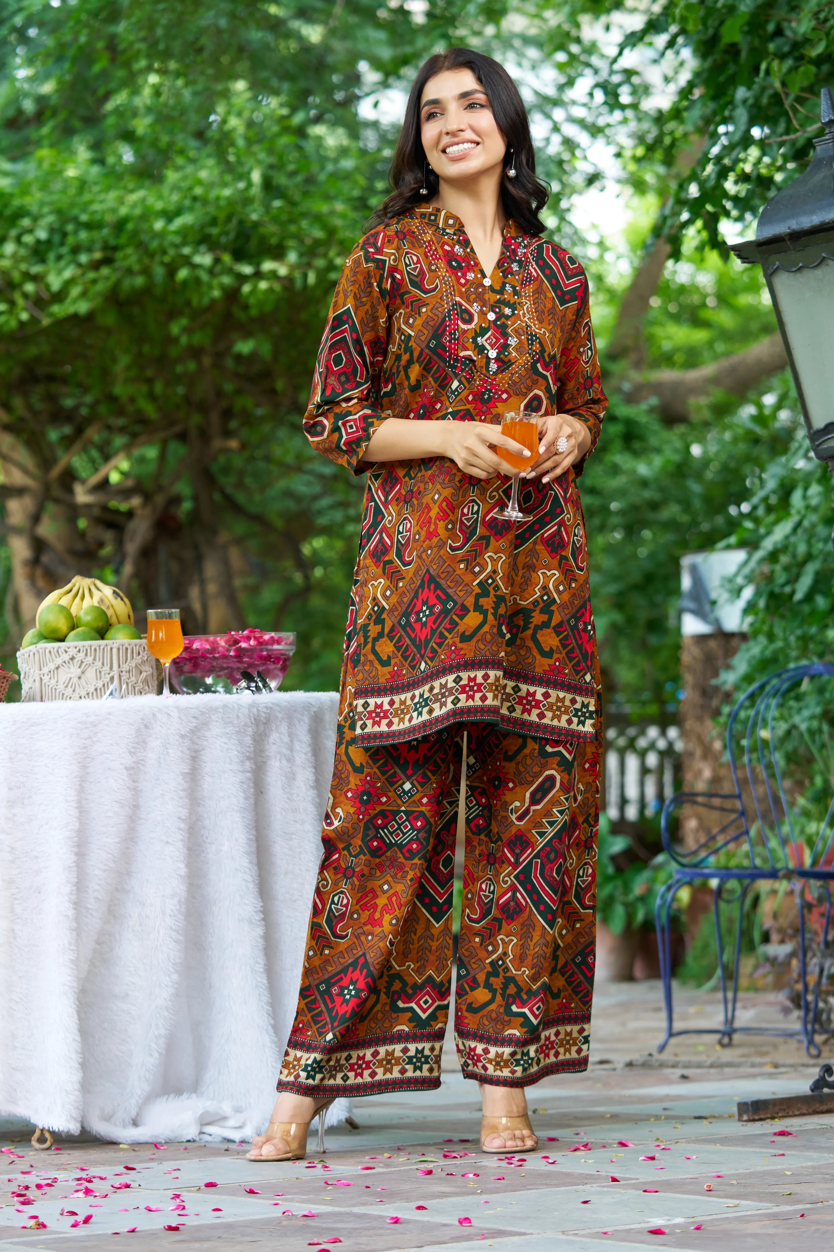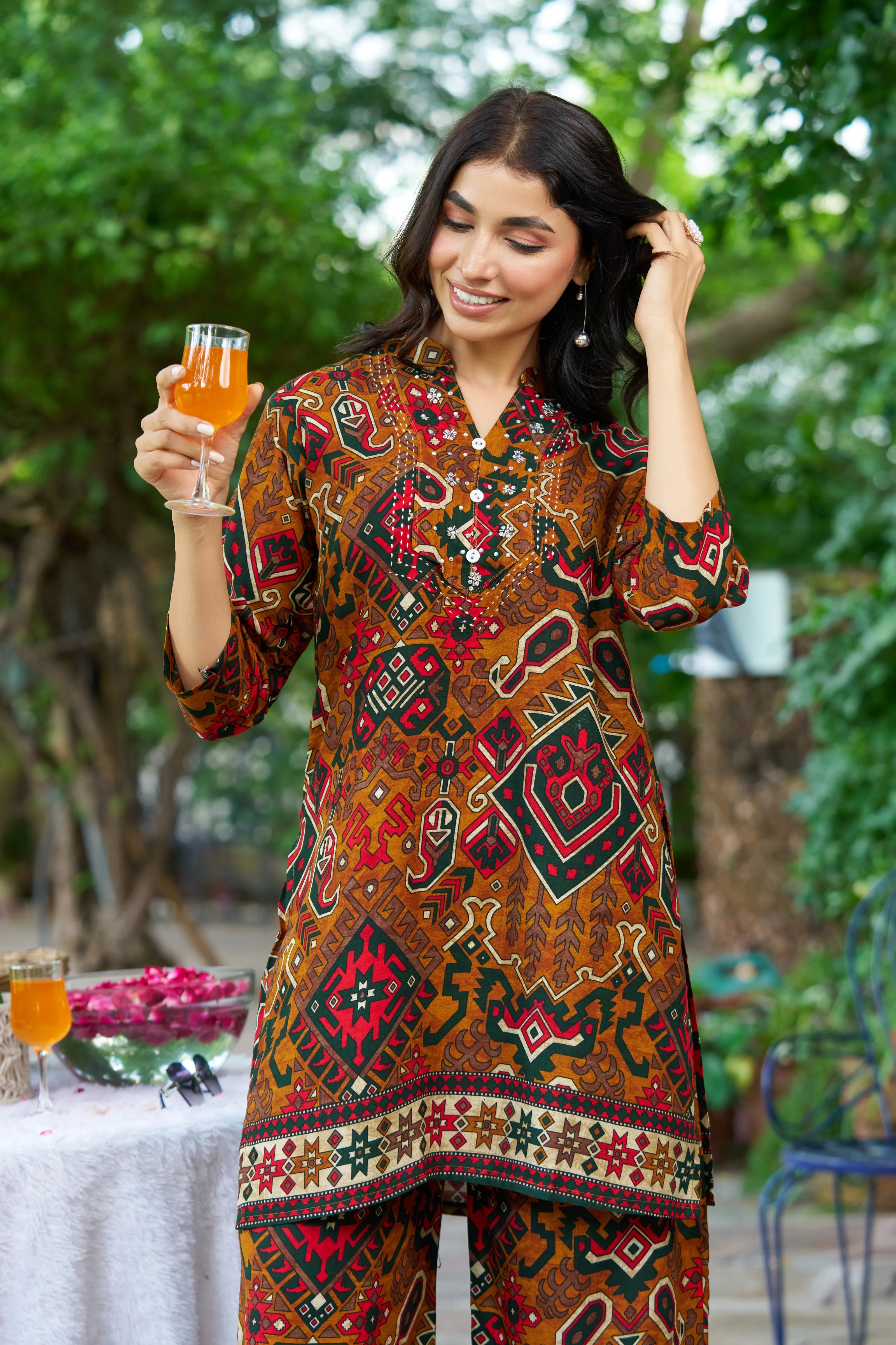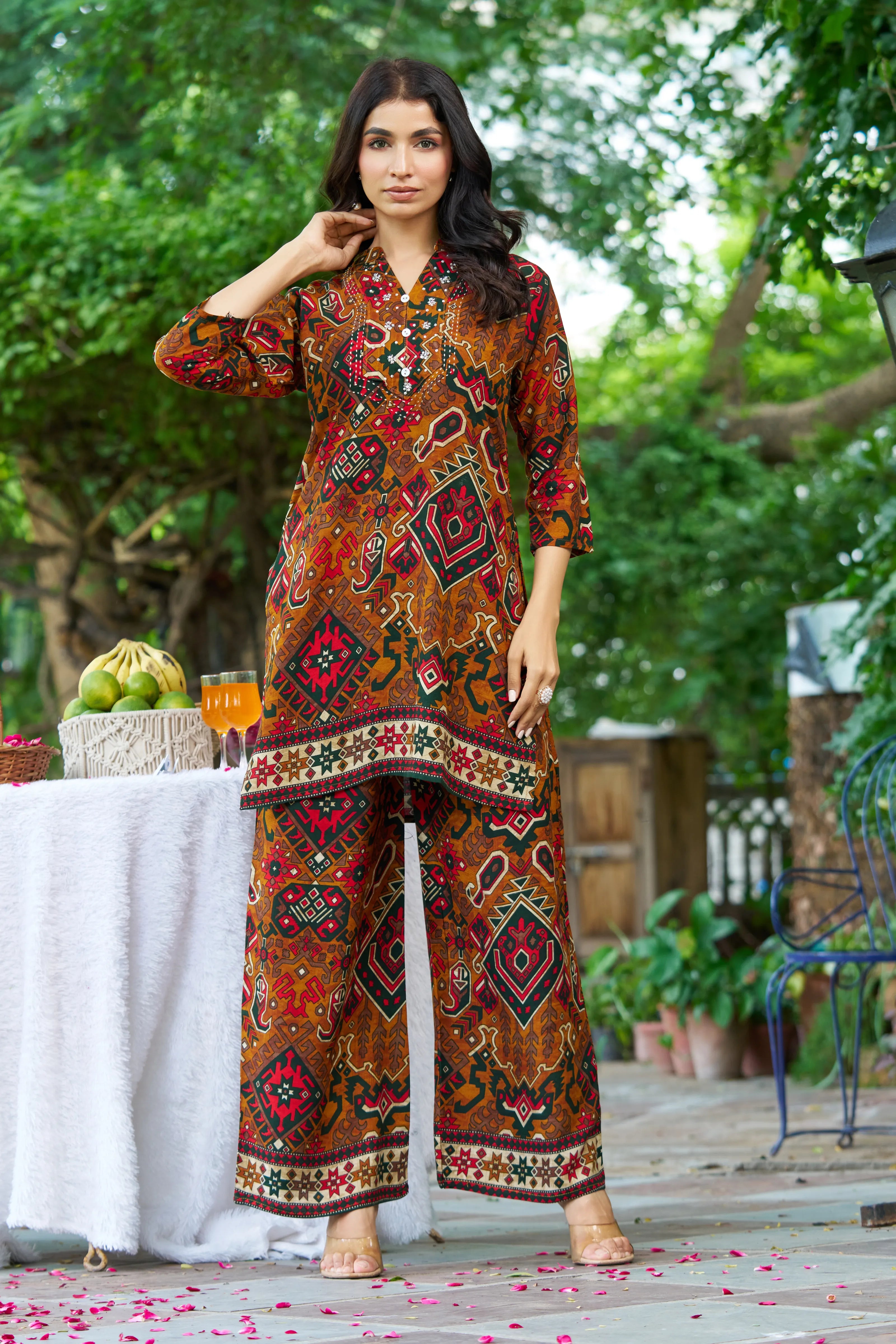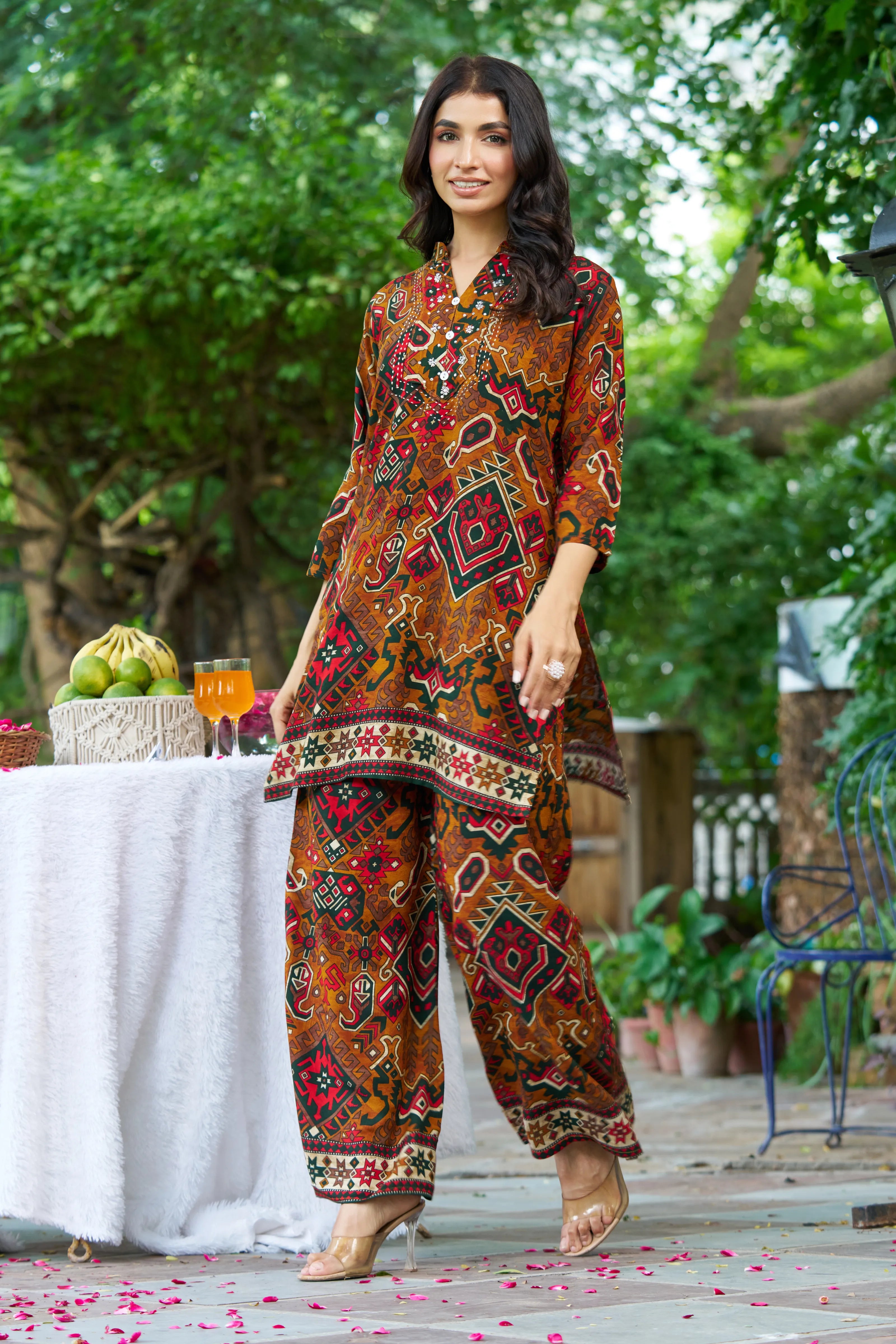 Step into timeless charm with Heritage Echo, a reddish-brown rayon set featuring intricate multi-color Ajrak-inspired motifs. Designed with a mandarin collar, front buttons, and detailed blanket stitch work, this ensemble is further enhanced with delicate moti and salli embroidery at the yoke. The flowy wide-leg pants mirror the artistry, making it a standout festive essential.