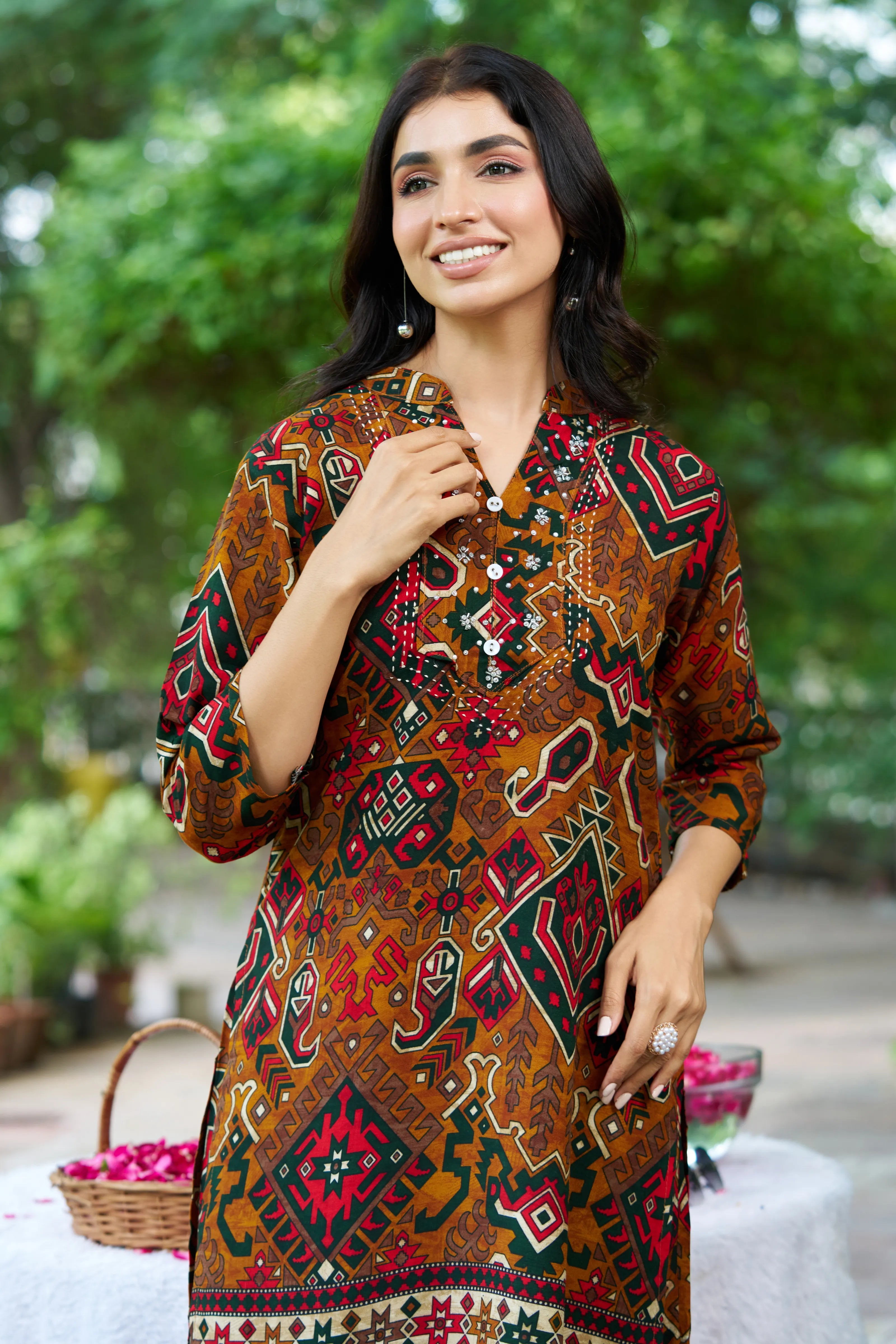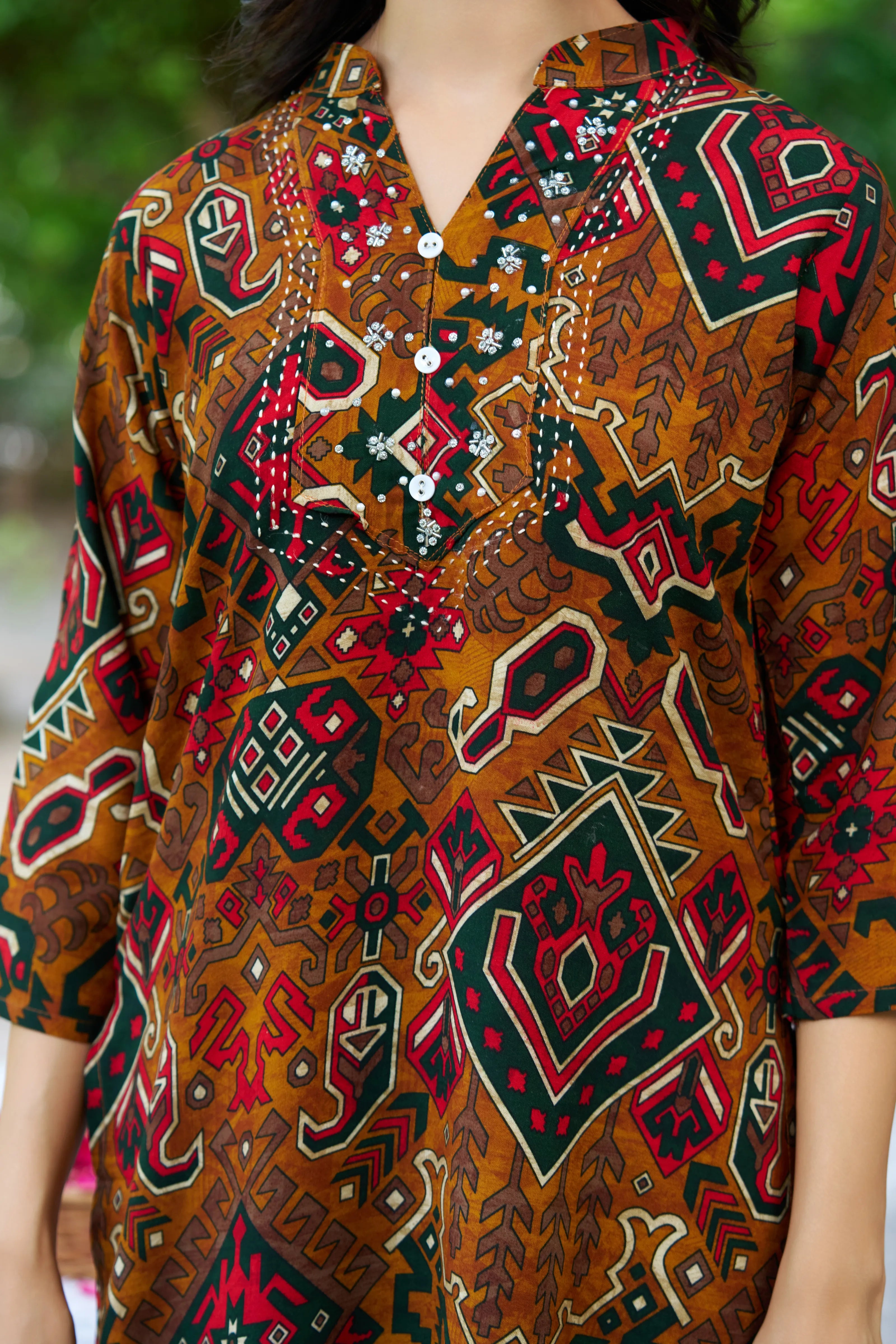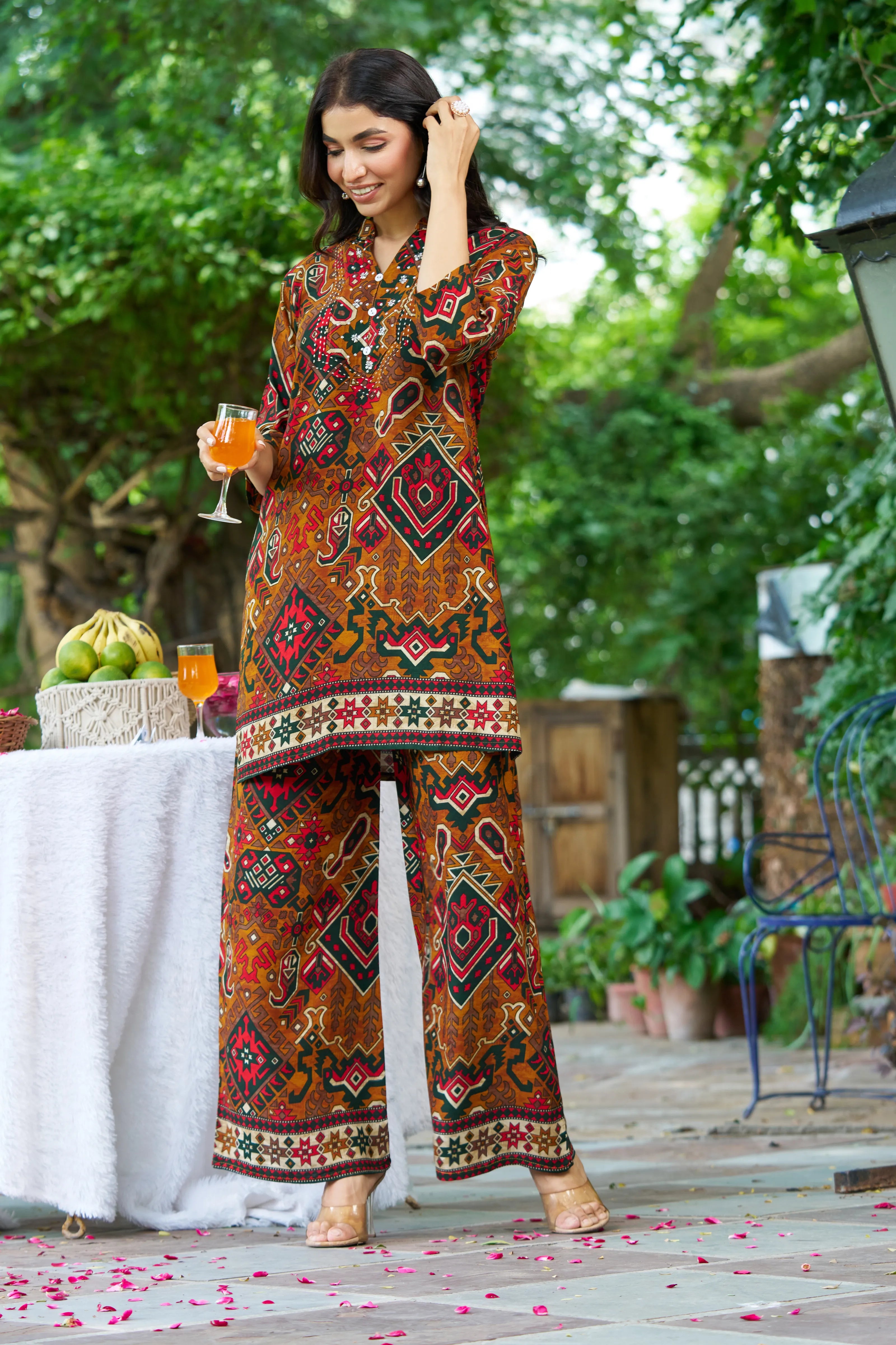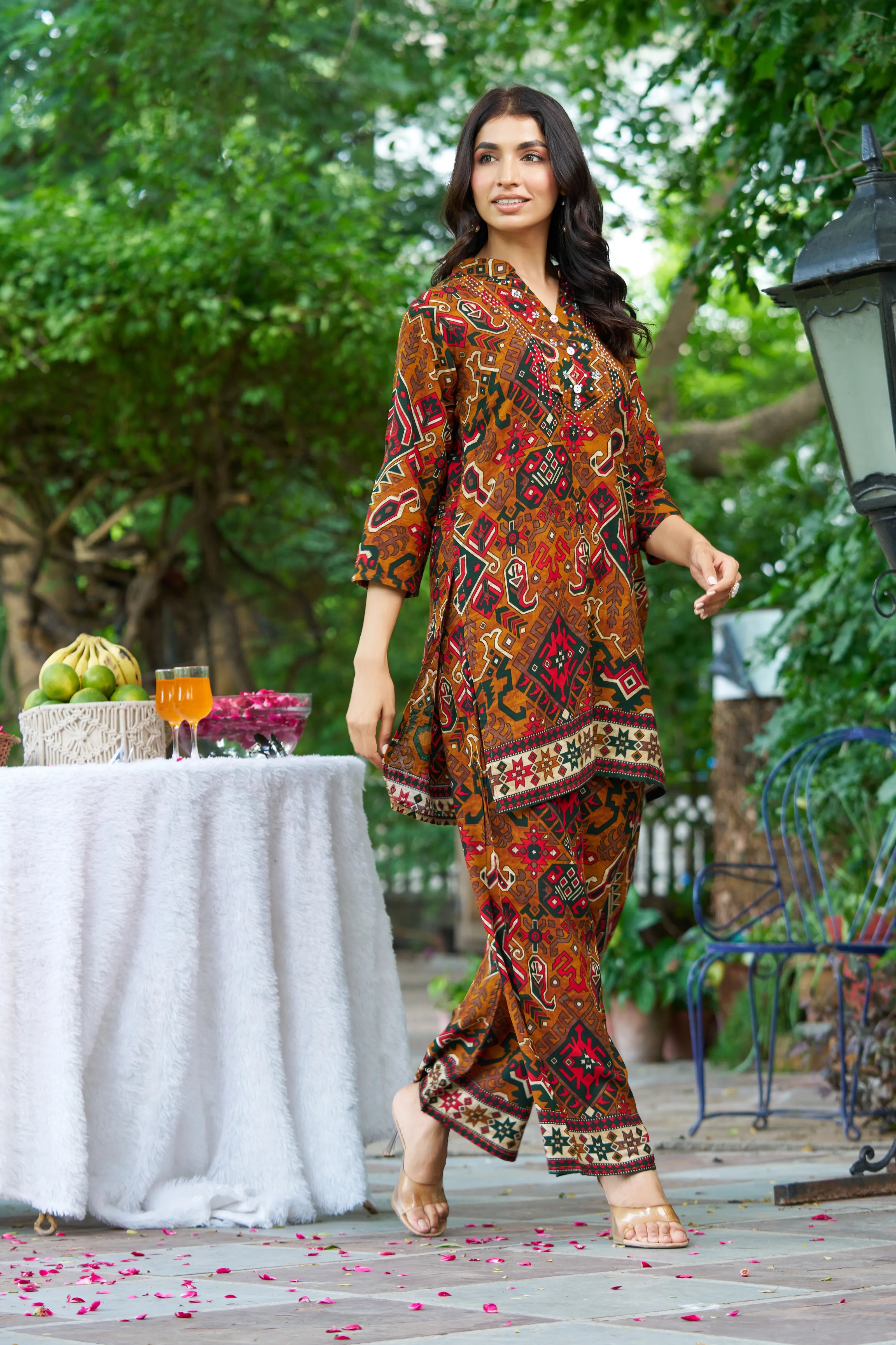 Step into timeless charm with Heritage Echo, a reddish-brown rayon set featuring intricate multi-color Ajrak-inspired motifs. Designed with a mandarin collar, front buttons, and detailed blanket stitch work, this ensemble is further enhanced with delicate moti and salli embroidery at the yoke. The flowy wide-leg pants mirror the artistry, making it a standout festive essential.