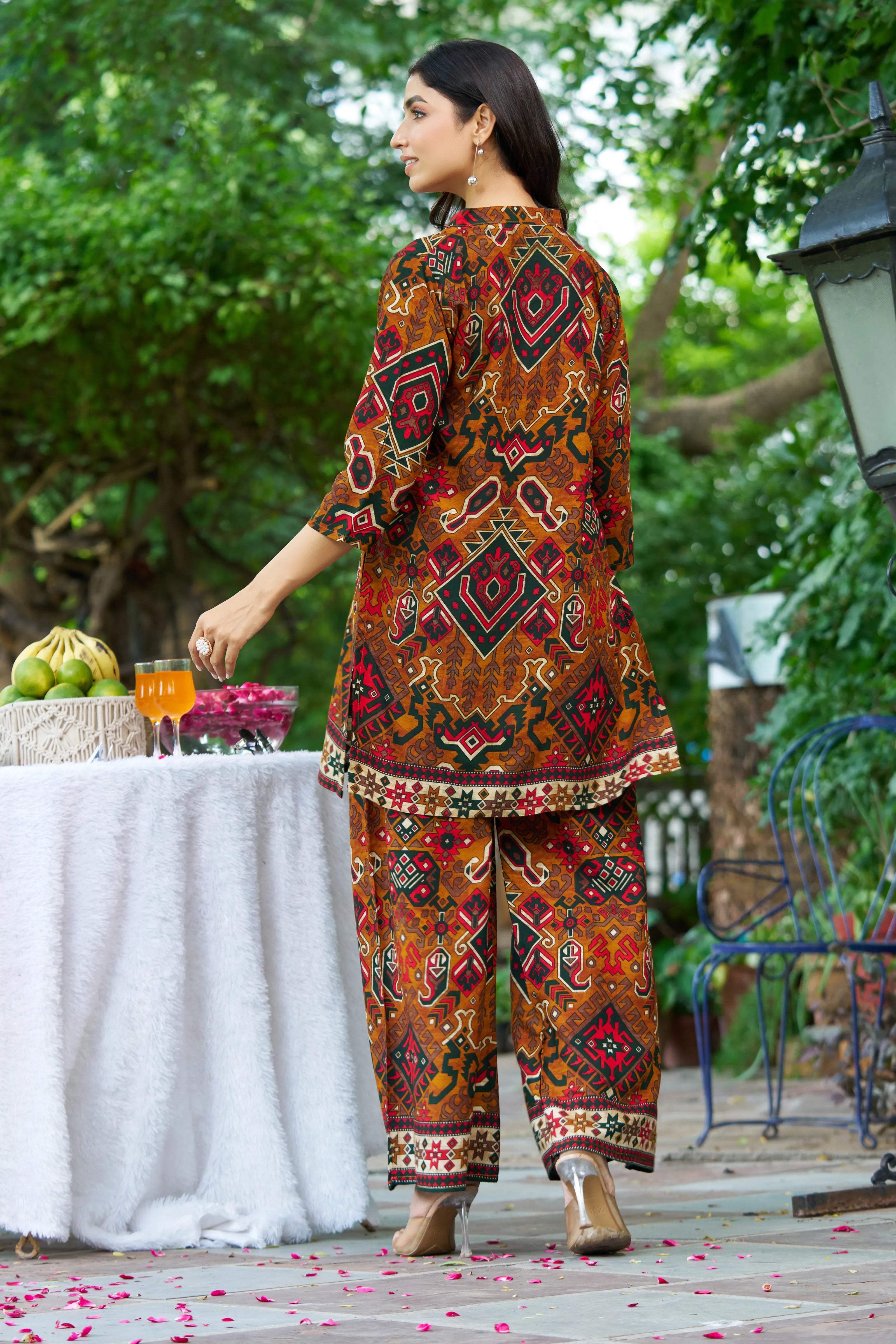 Heritage Echo: Brown Base Ajrak Print Kurti & Pant Set