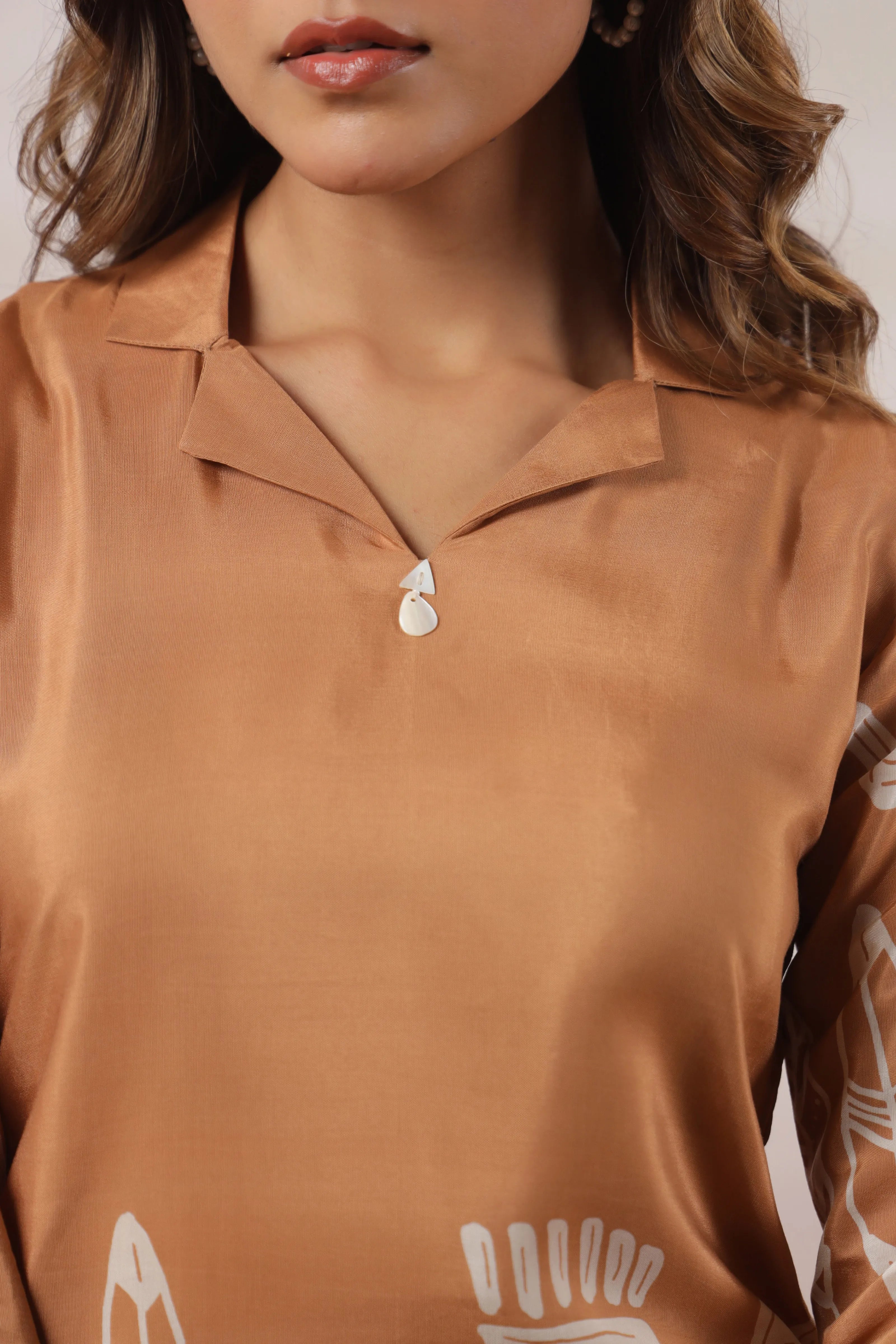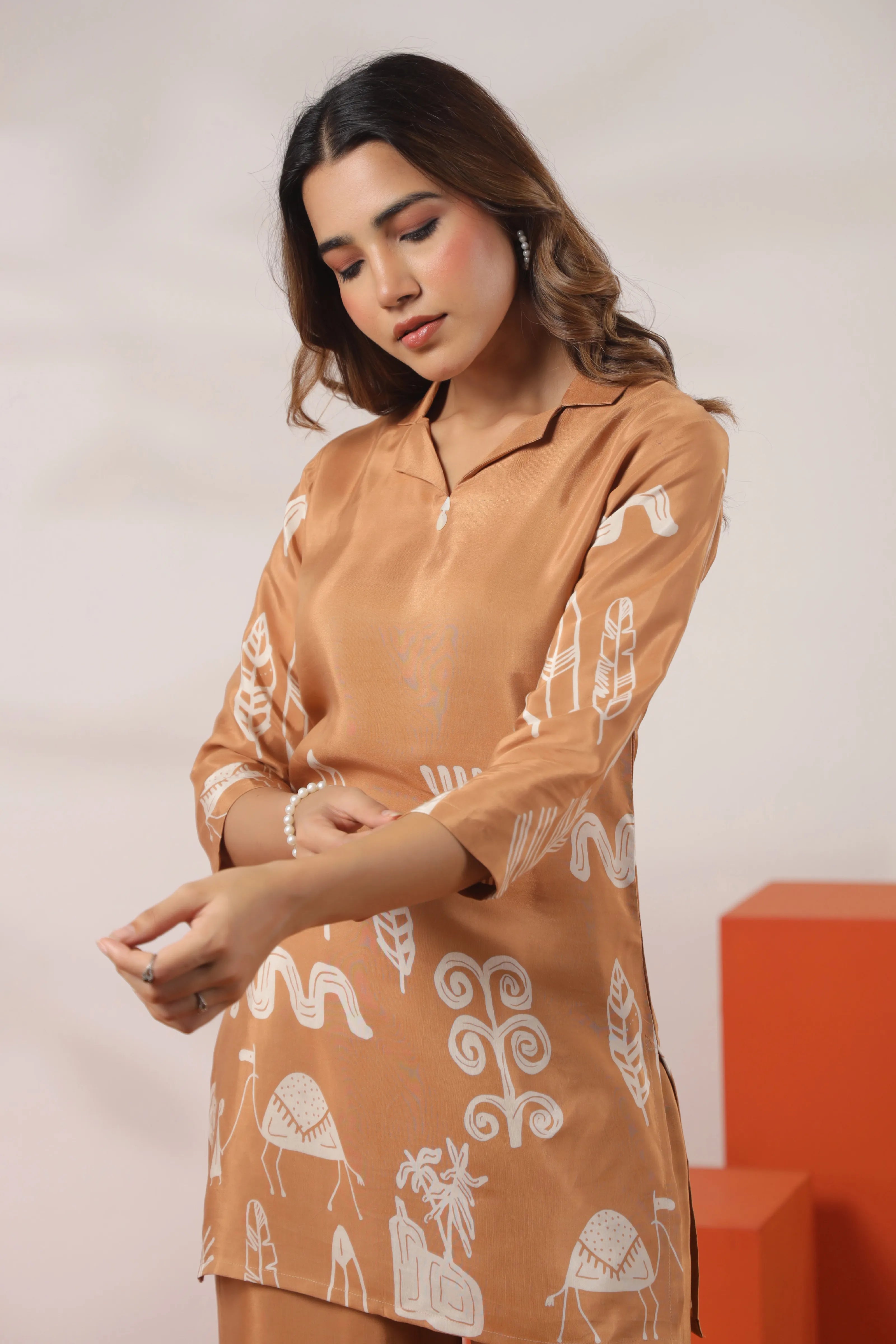Let your style speak ancient stories in Desert Echo — a warm brown co-ord set in luxe Russian silk, brought to life with cream tribal-inspired motifs. Inspired by age-old cave art and native symbolism, this set adds earthy elegance to your modern wardrobe.