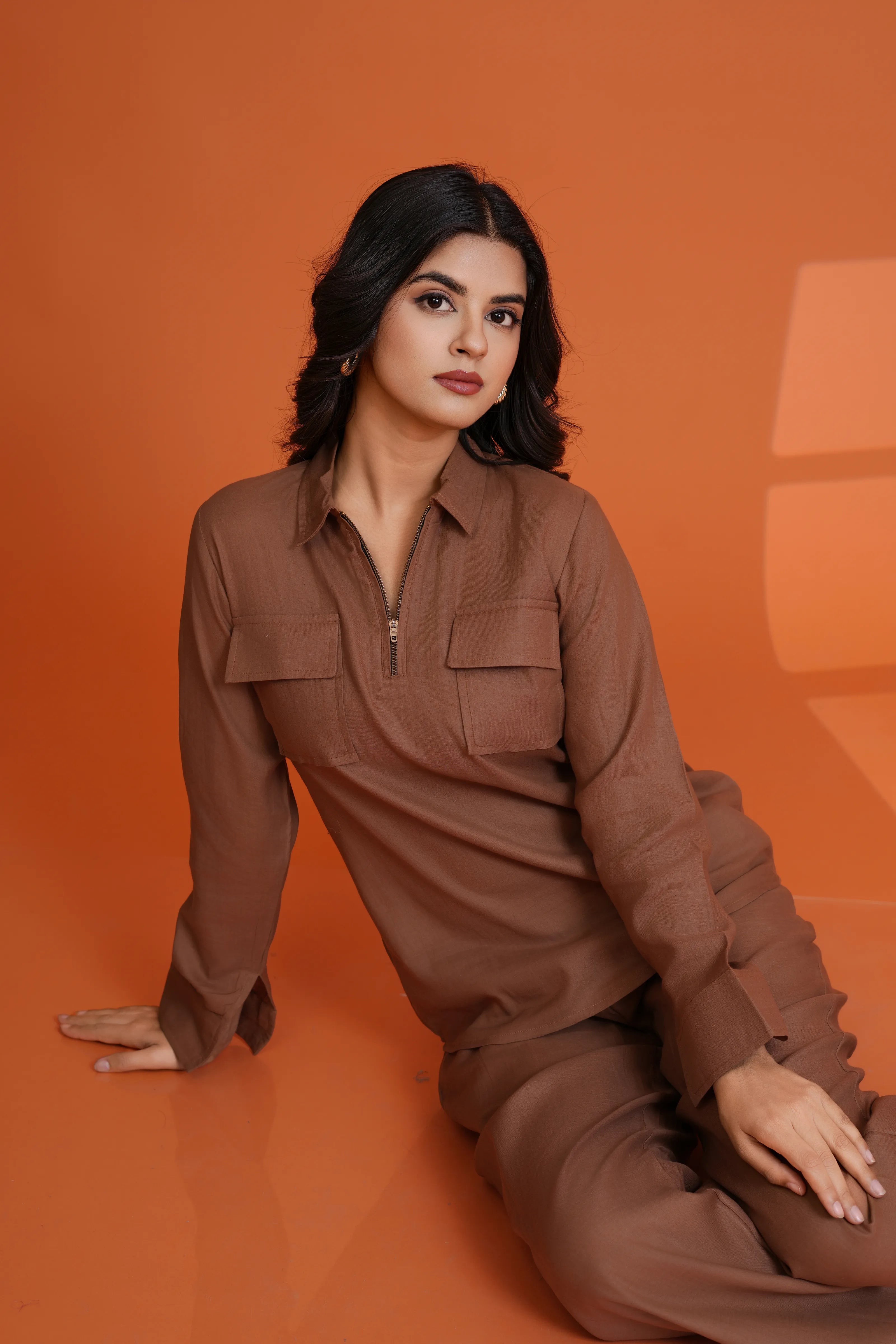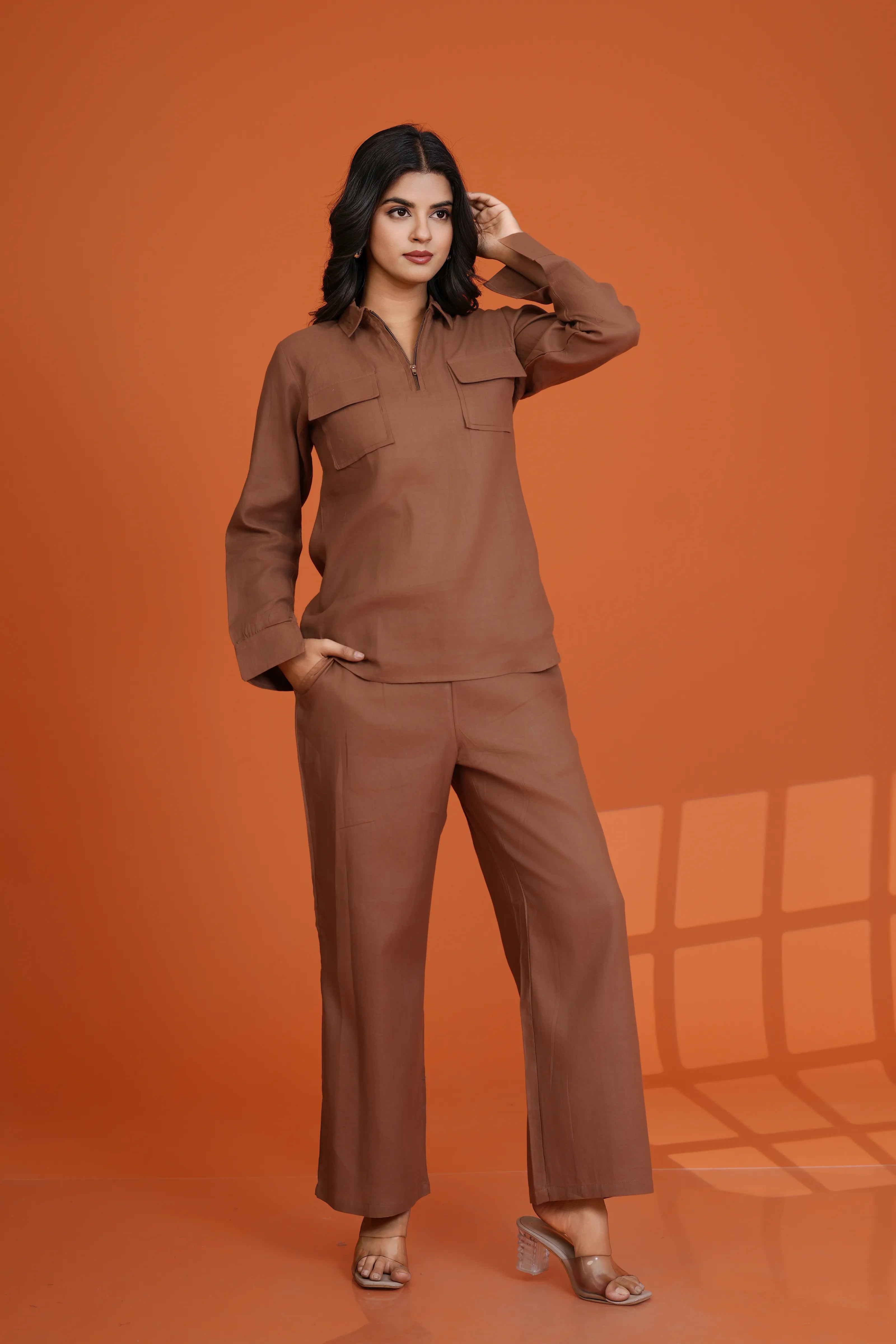 Earthbound Ease: Brown Zip-Front Utility Co-Ord Set in Pure Cotton