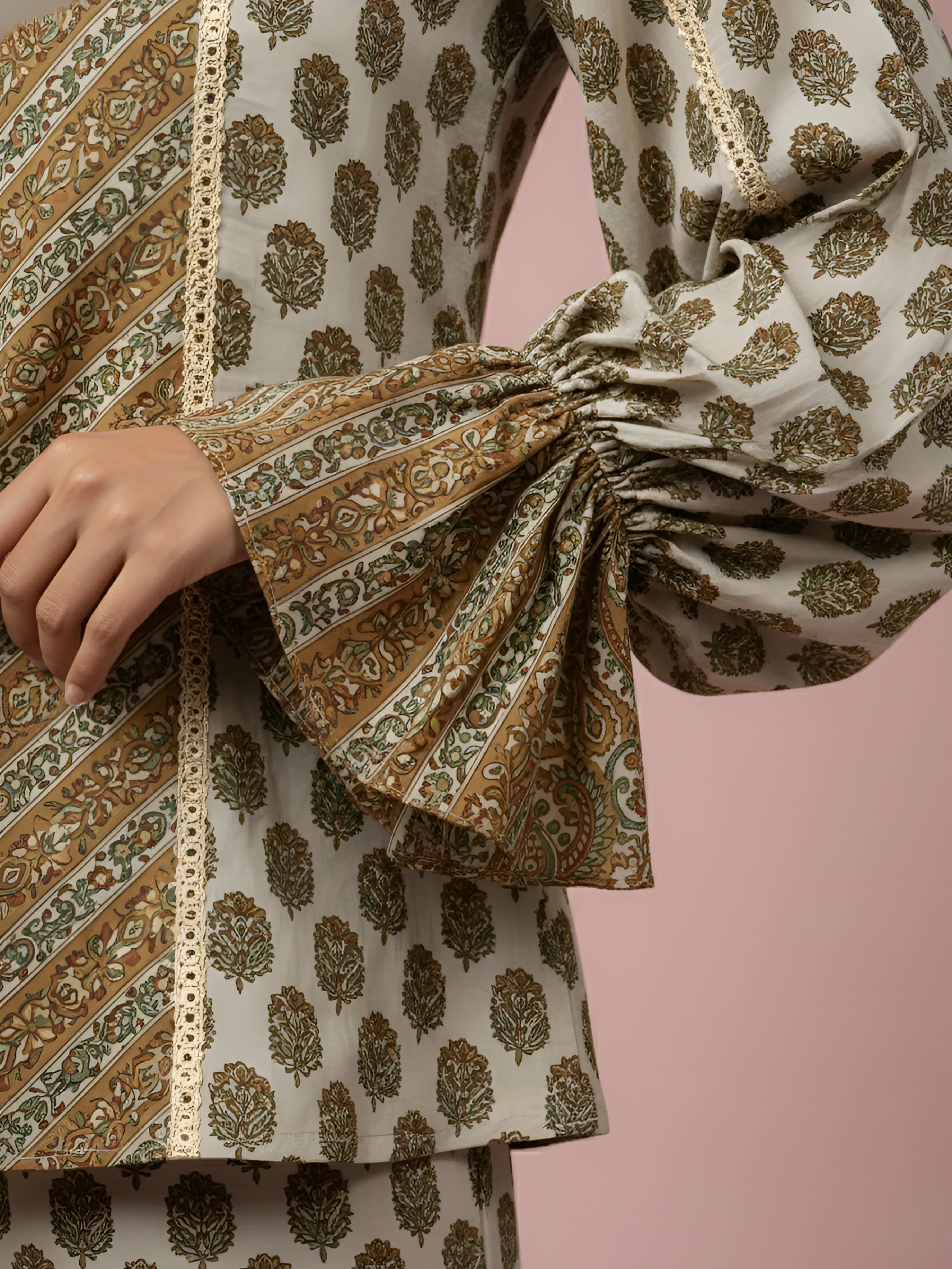 Complementing the top is a pair of straight-fit palazzo pants designed with an elasticated waistband for all-day comfort. The palazzos feature coordinated printed and bordered detailing at the hem, tying the entire look together with a balanced, polished finish.
