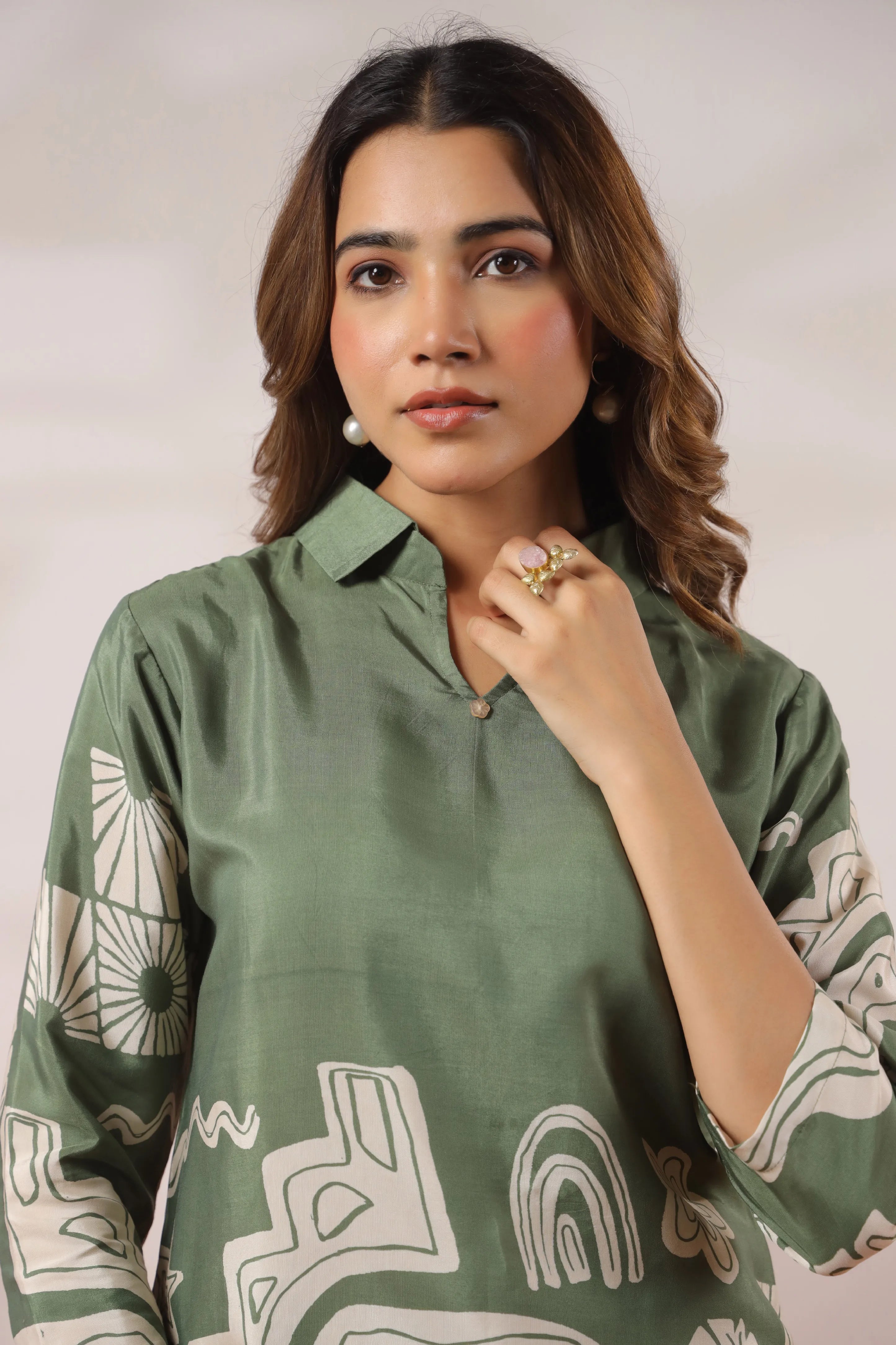 Step into effortless sophistication with the Chateau Green Tribal Elephant Elegance Co-ord Set, a statement ensemble crafted from luxurious Russian silk. The shirt-style kurti in a serene chateau green base showcases bold cream abstract placement prints—featuring tribal elephant motifs, leafy silhouettes, rainbow arcs, and geometric accents—making it a modern ode to heritage artistry. Designed with a shirt collar V-neckline, graceful 3/4th sleeves, and paired with wide-leg pants featuring elasticated waist and both-side pockets, this set blends comfort with unmistakable style.