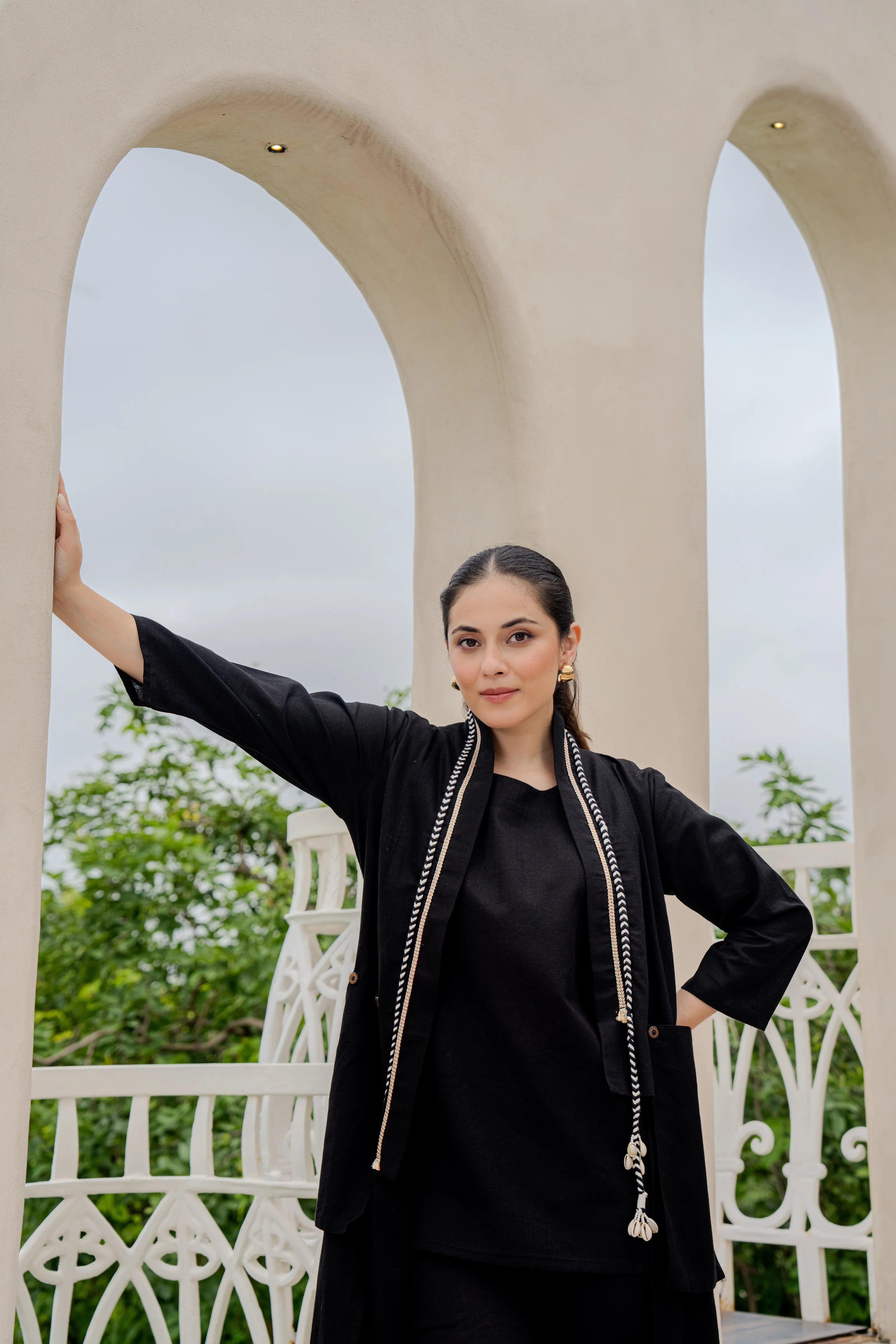 The sleeveless top features a round neckline that layers beautifully under the longline jacket, which comes with side slits, twin pockets, button patch details, and asymmetrical lace highlights. The standout feature lies in the braided lace with cowrie shell drops, adding a subtle ethnic touch to this modern silhouette. Paired with elasticated waist pants featuring a drawstring, side pocket, and button detailing at the hem, this set is comfort wrapped in sophistication.