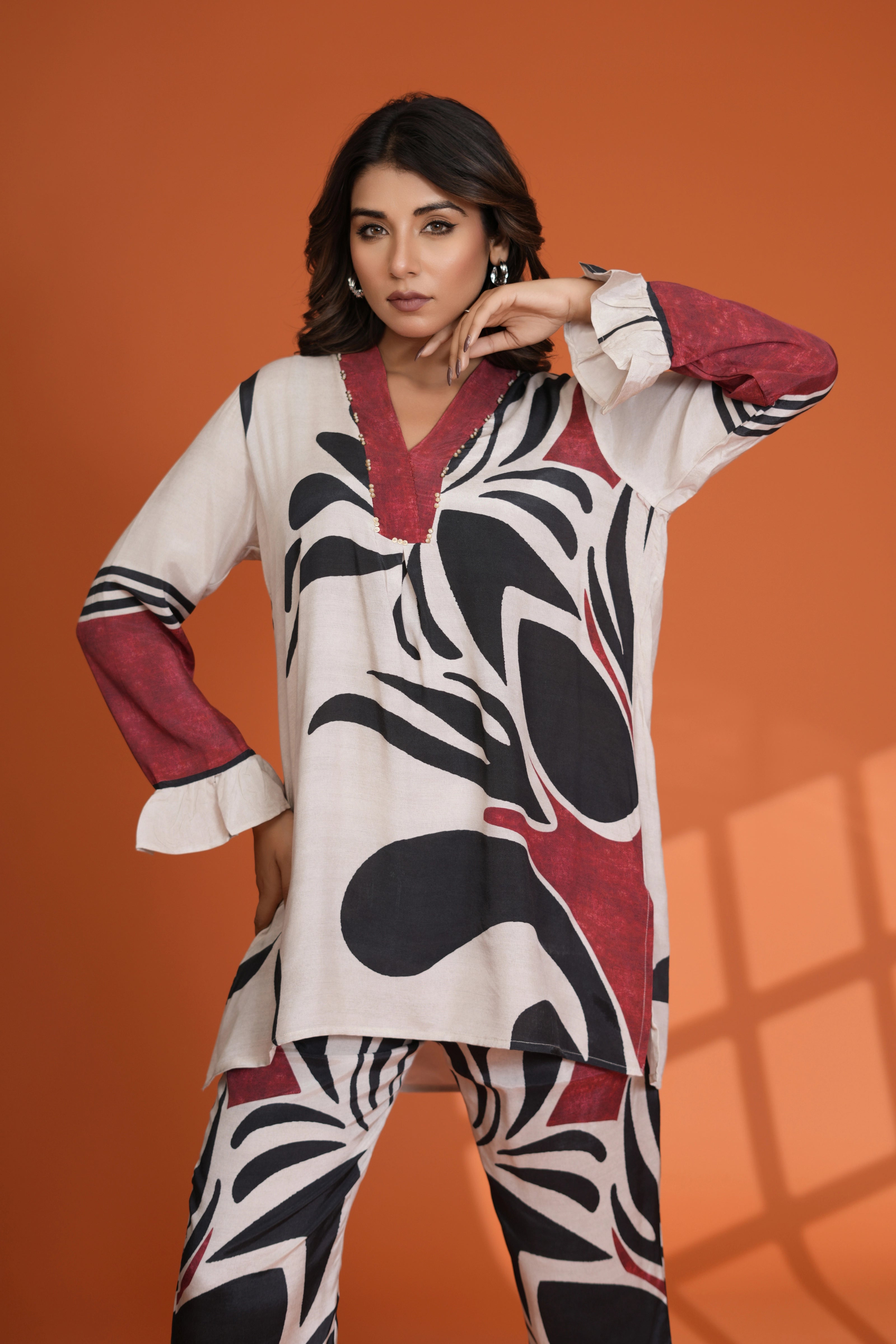 Cream Base Bold Placement Printed V-Neck Co-Ord Set in Muslin