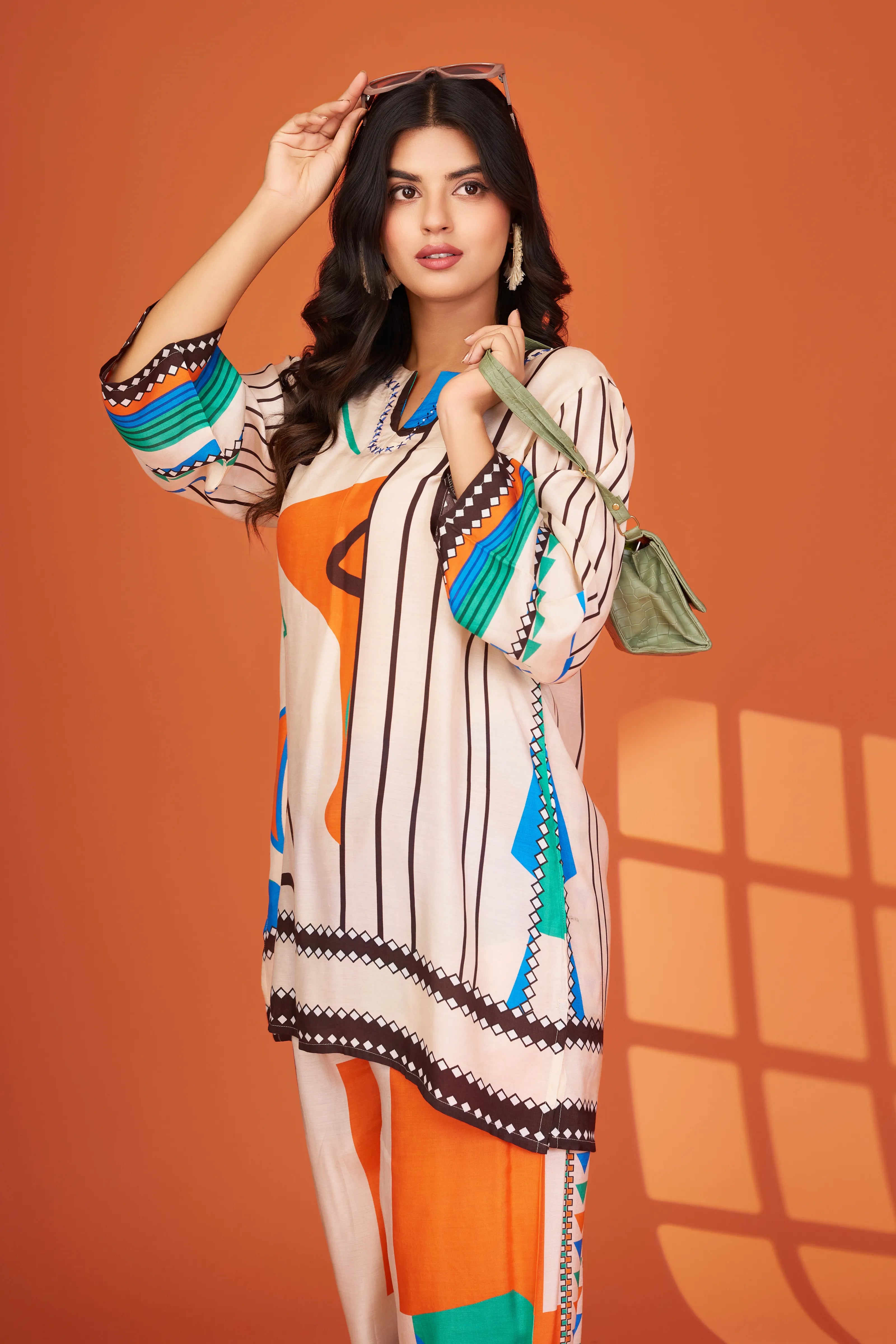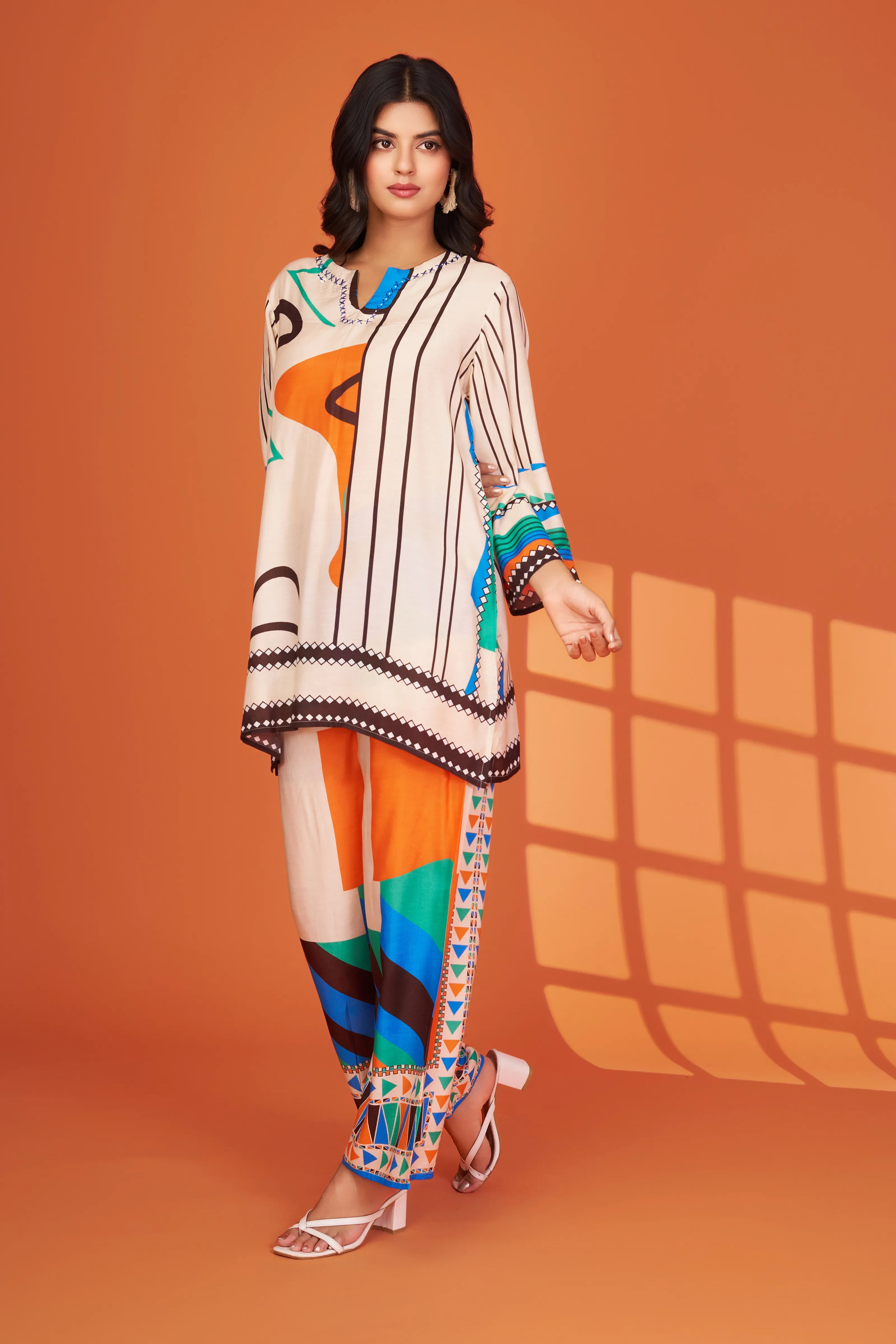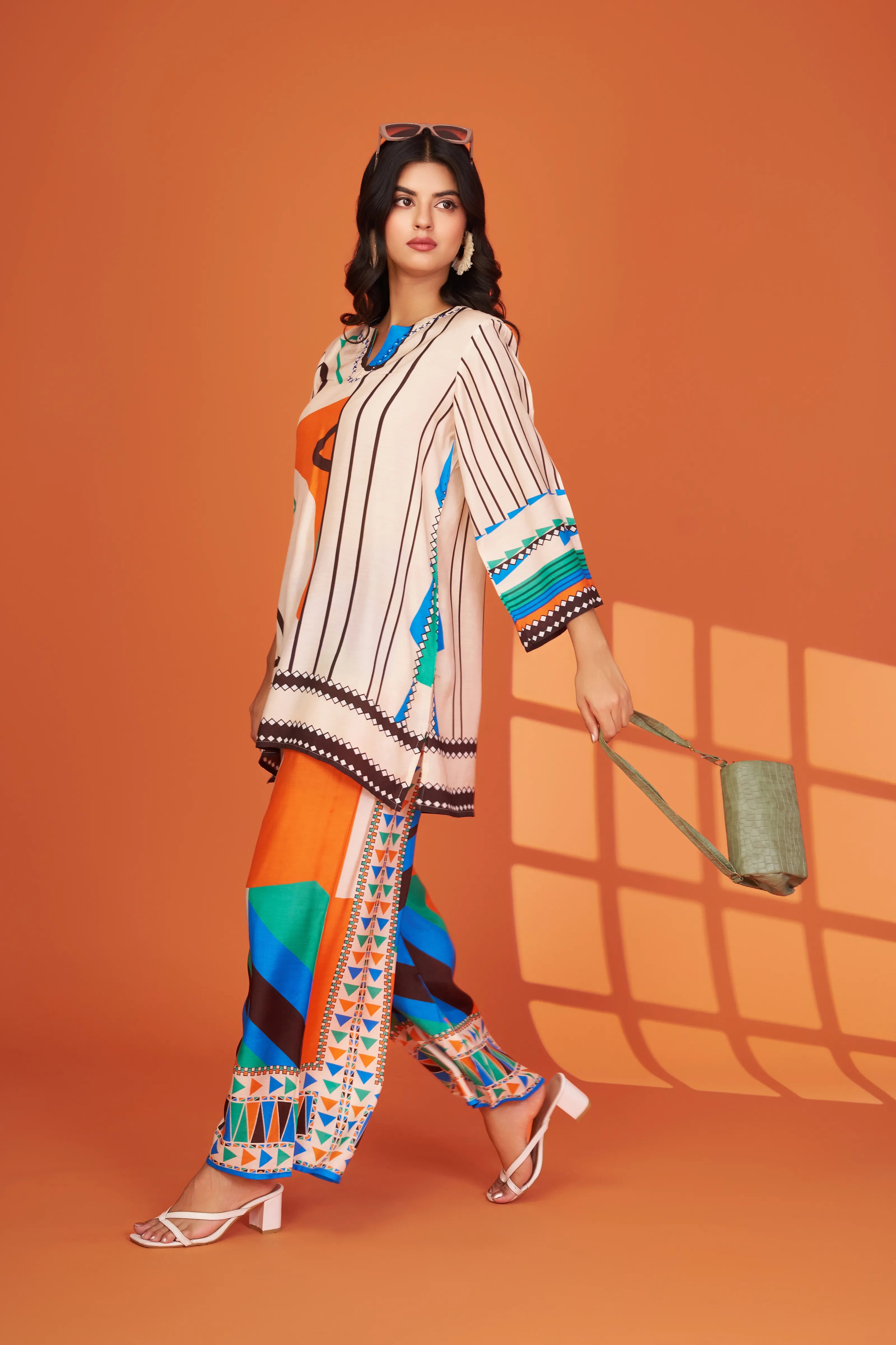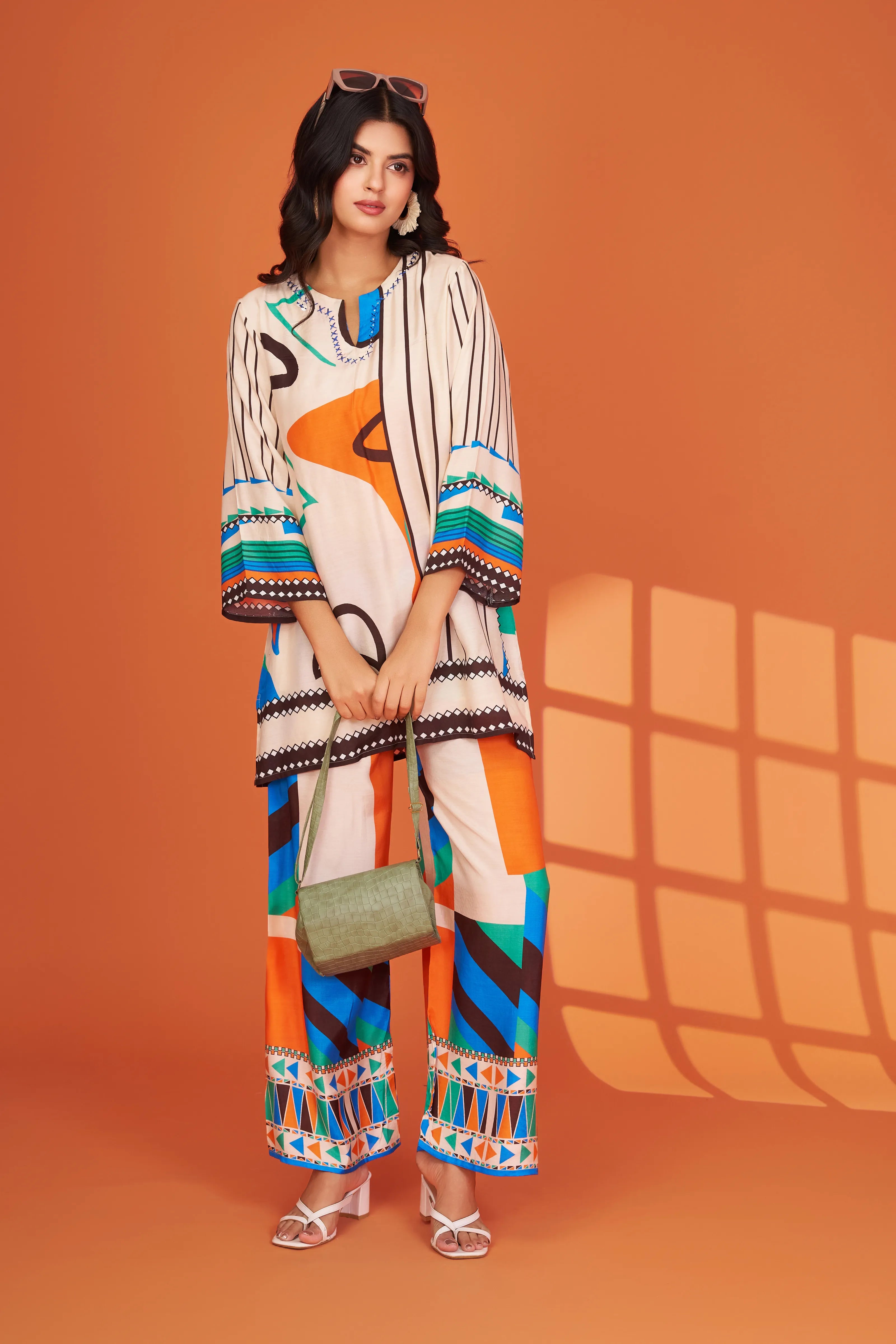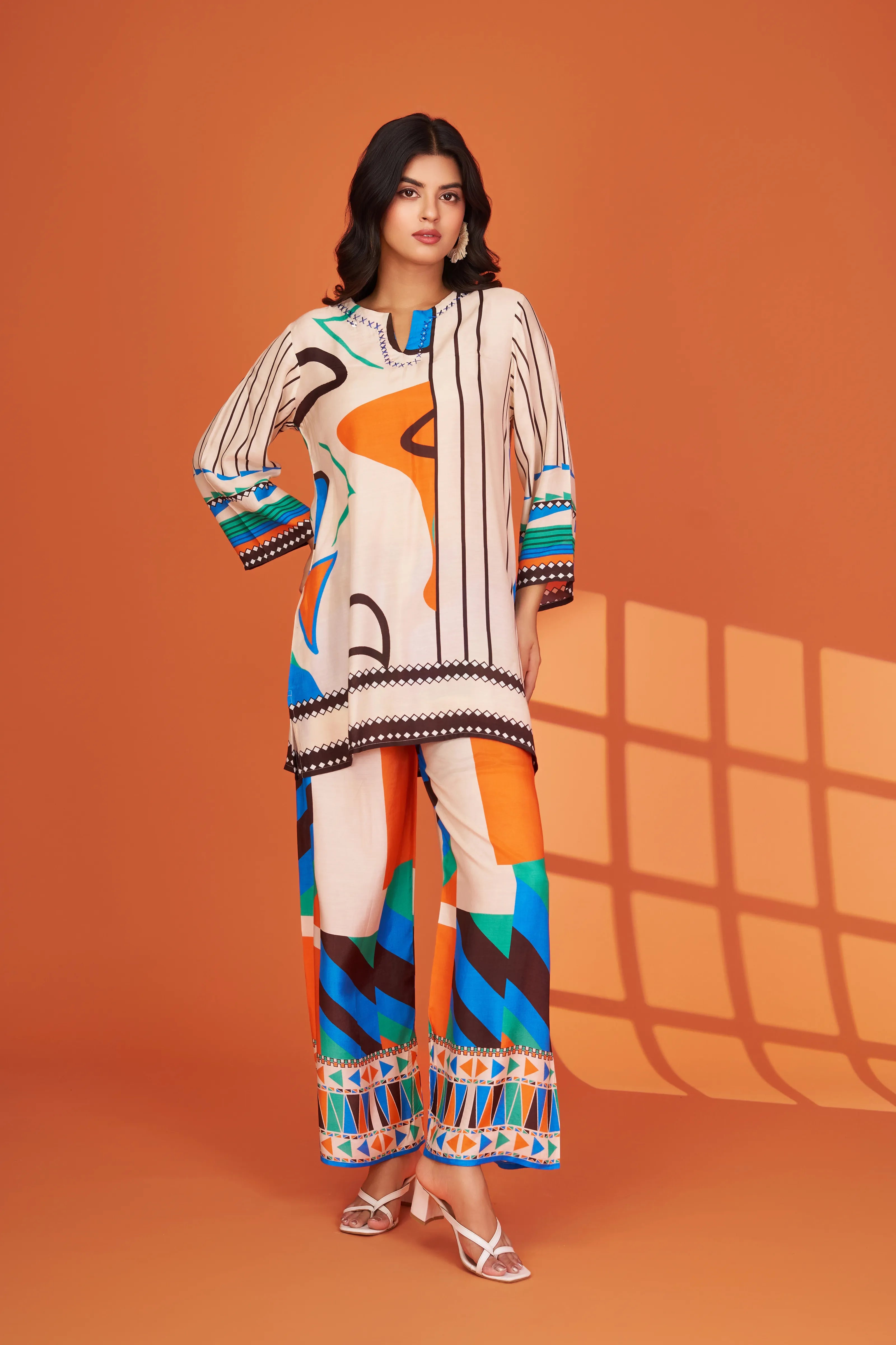 Make a bold entrance in our Graphic Muse co-ord set – a perfect canvas of art-inspired design and minimalistic glam. This cream-colored ensemble is brought to life with vibrant multi-color geometric patterns, elevated with delicate bead embellishments and signature blanket stitch detailing.