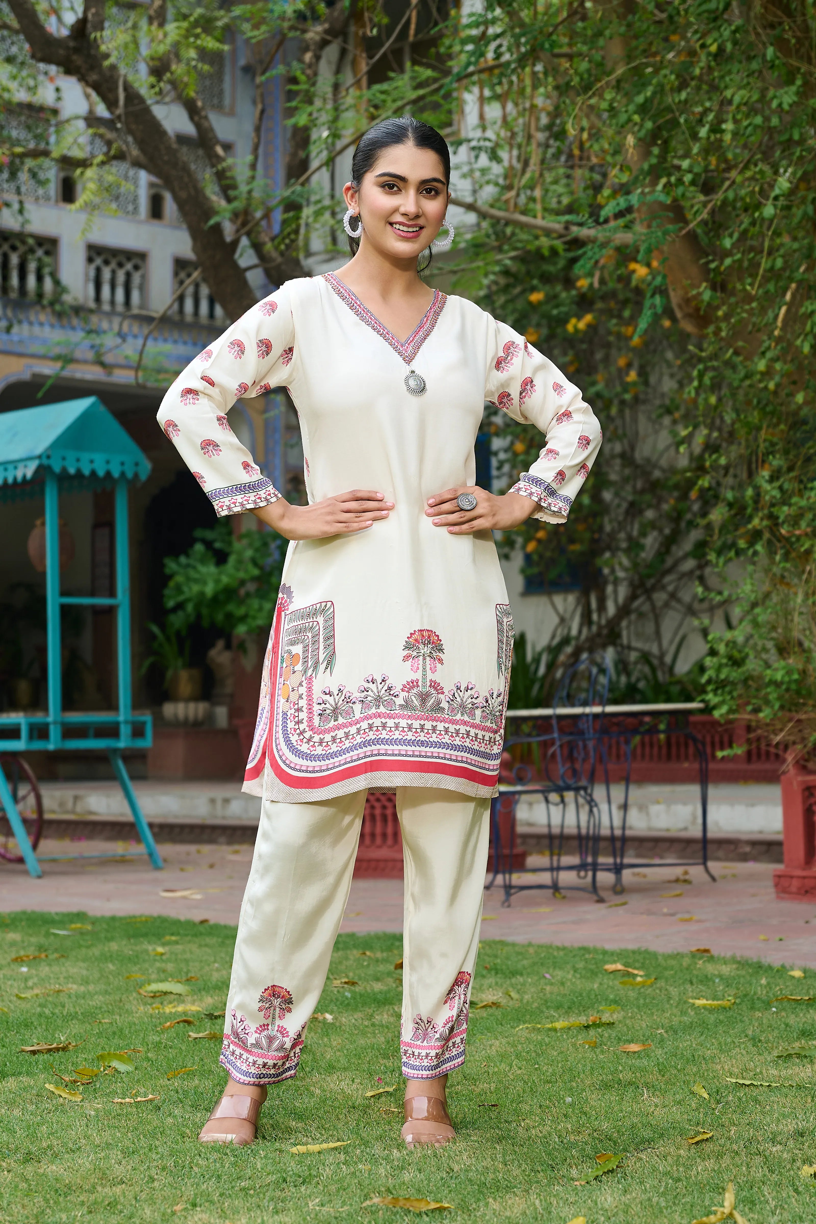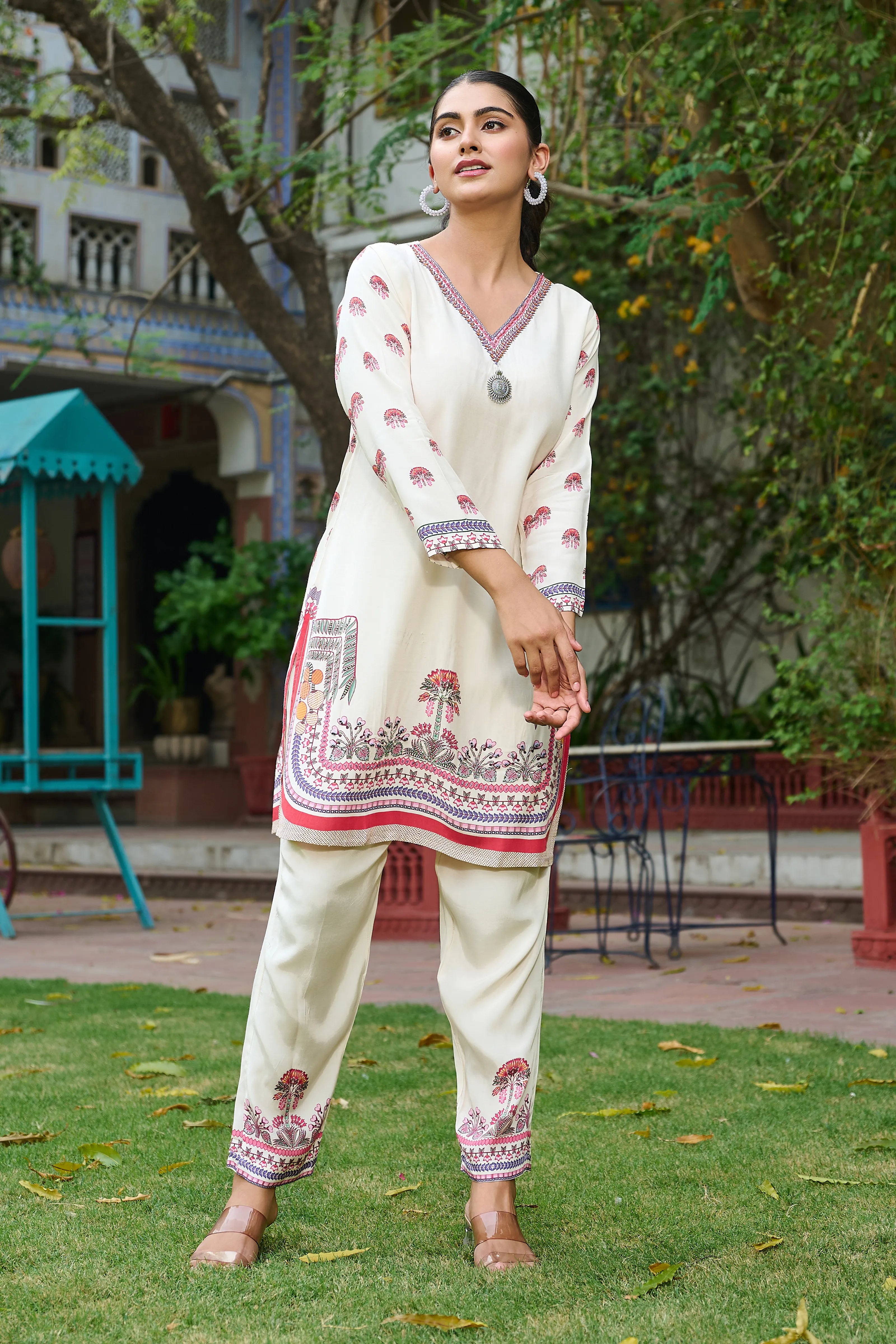 Pair with silver jhumkis, kolhapuri wedges, and a soft bun to let the intricate prints shine.