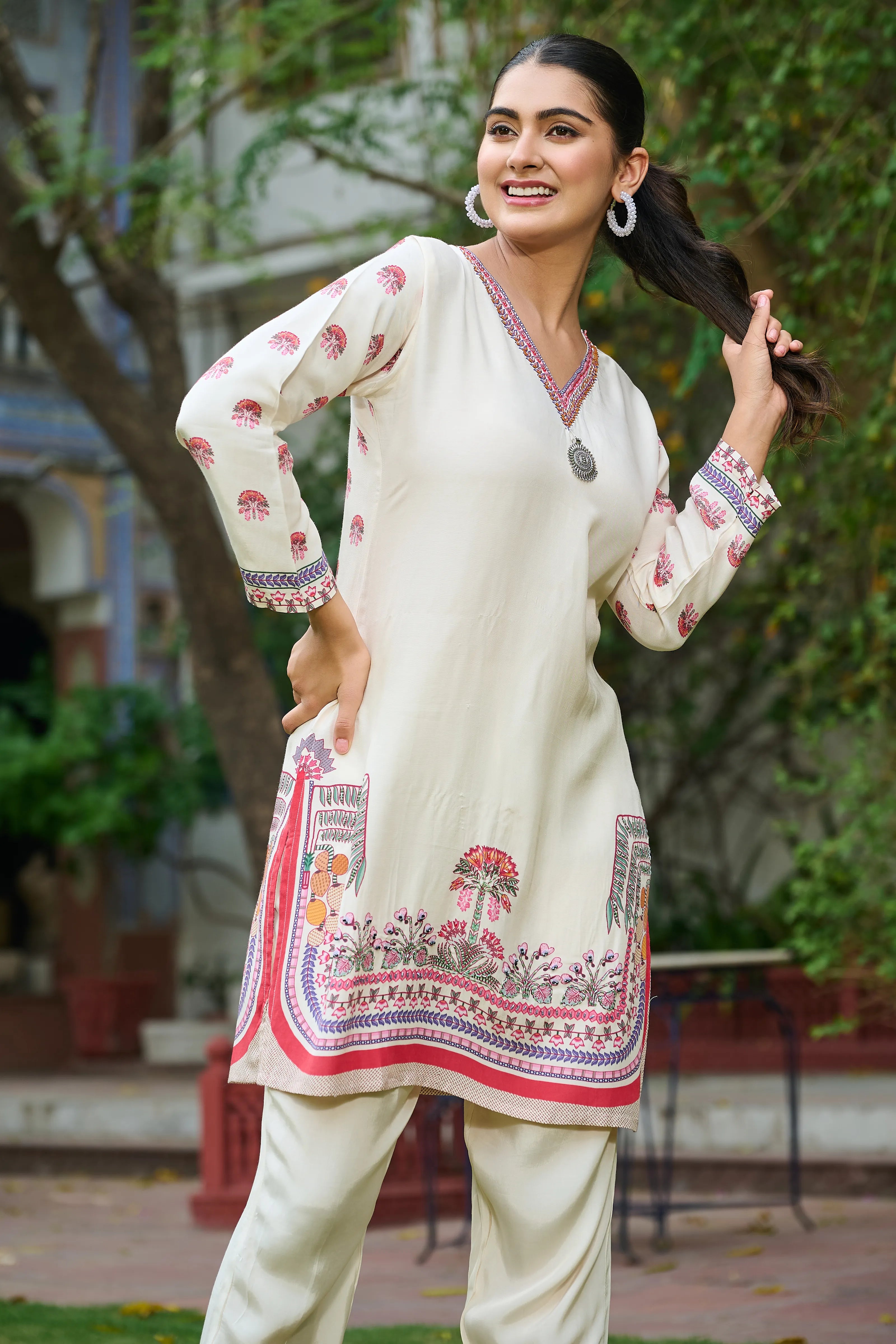 – Cream straight-fit pants with coordinated botanical print