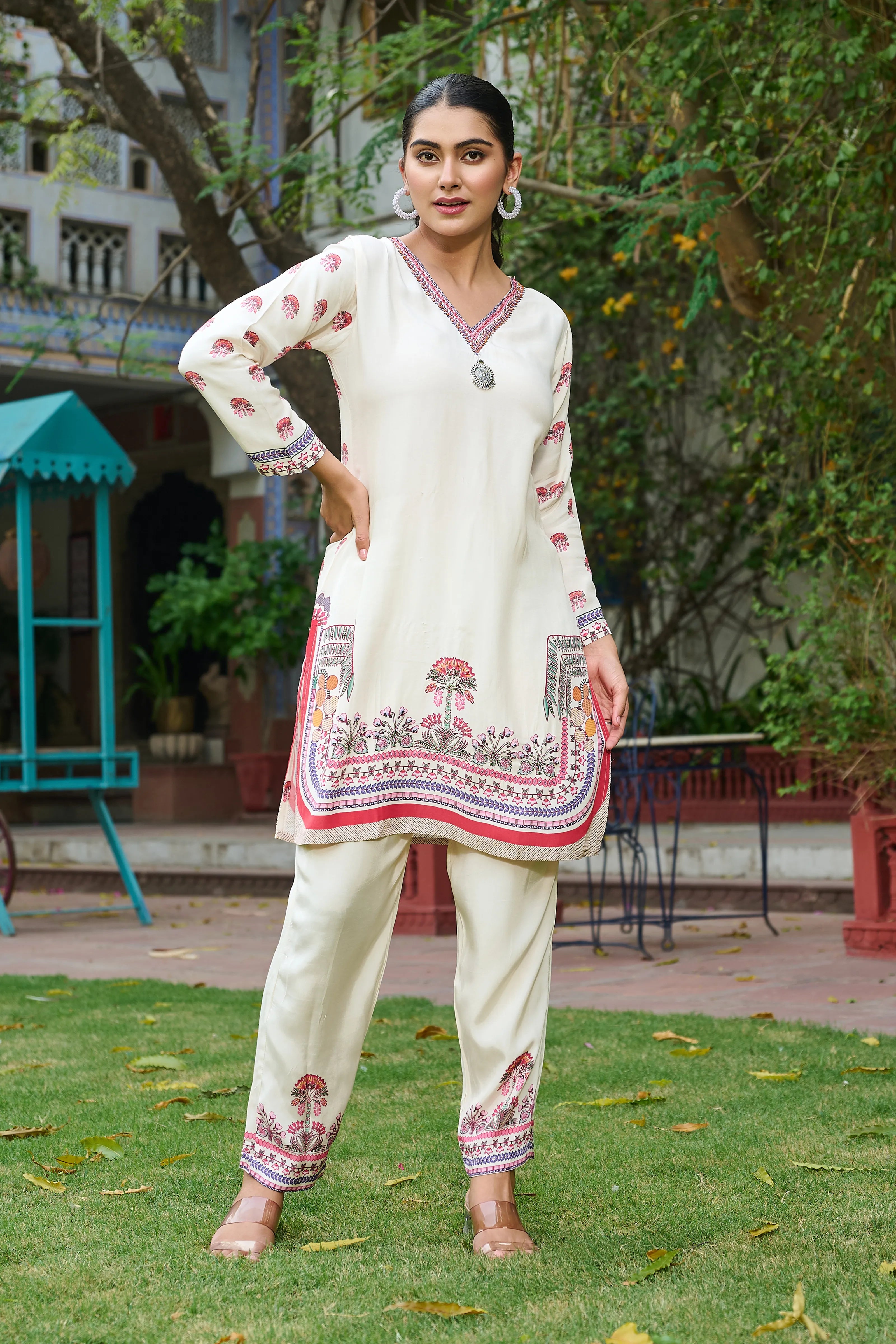 Step into a garden of elegance with Ivory Grove — a cream crepe co-ord set enriched with intricate botanical placement prints and delicate embellishments. Highlighted with fine beadwork and subtle salli detailing, the kurta features a V-neckline adorned with a striking silver brooch that adds just the right amount of shimmer.