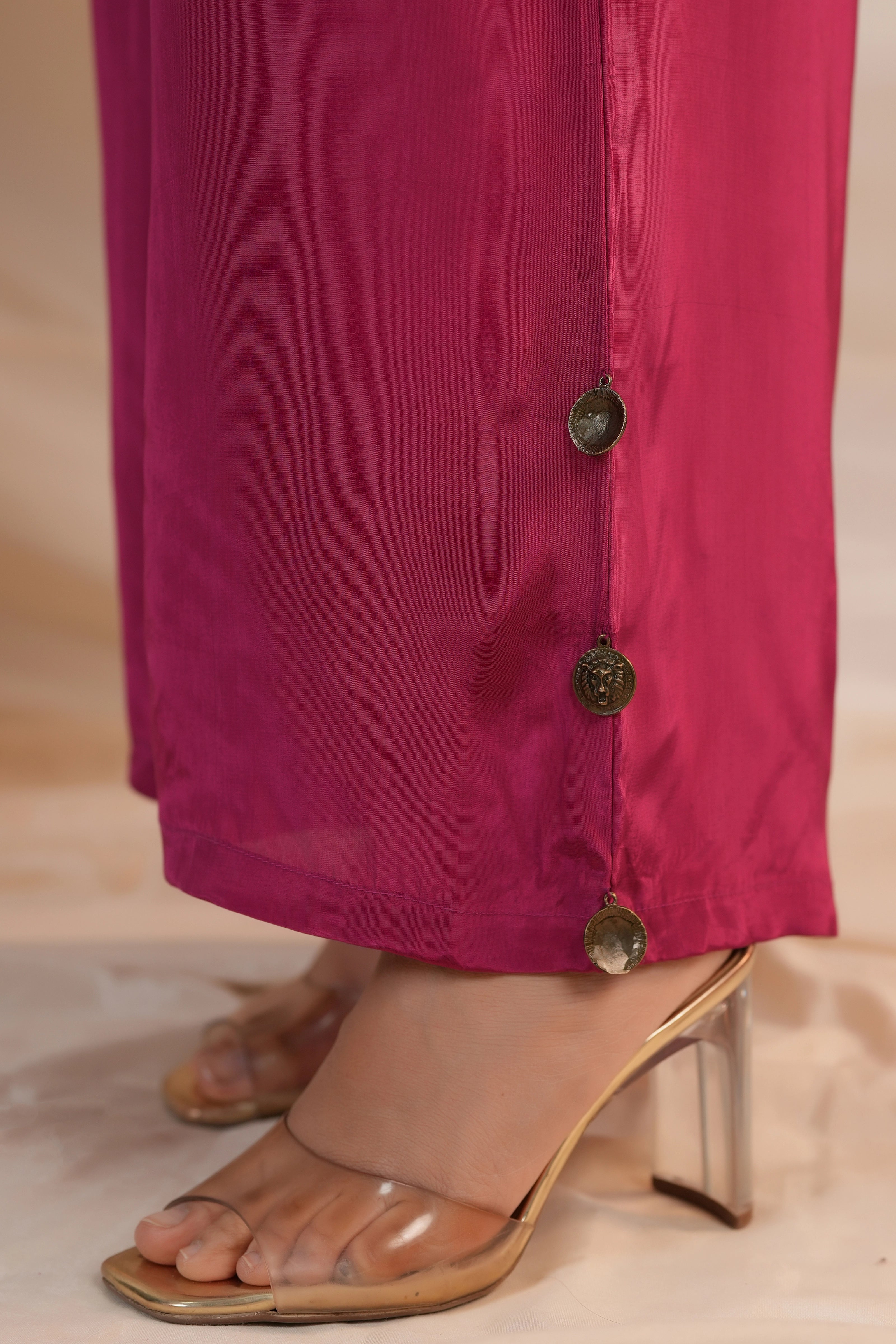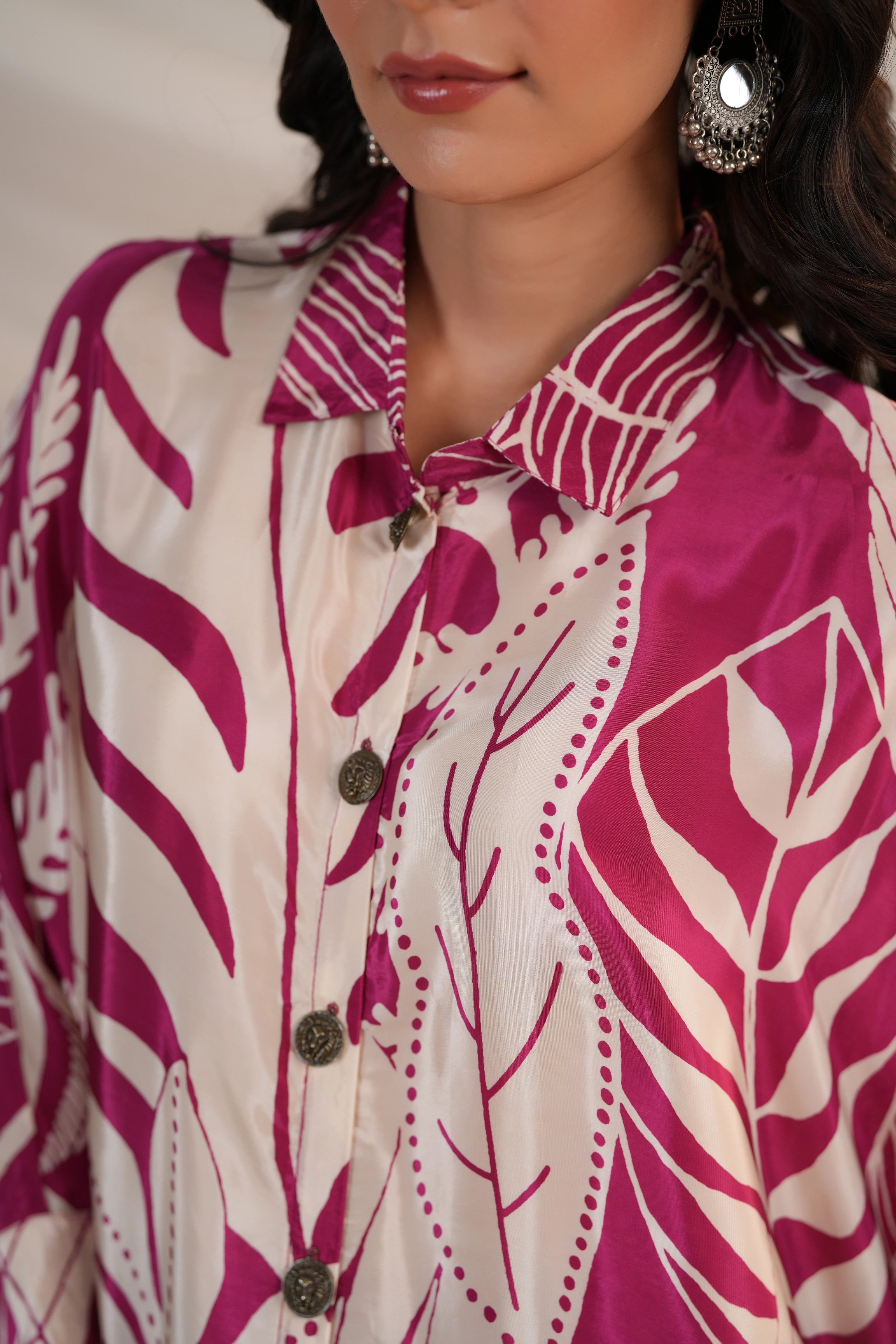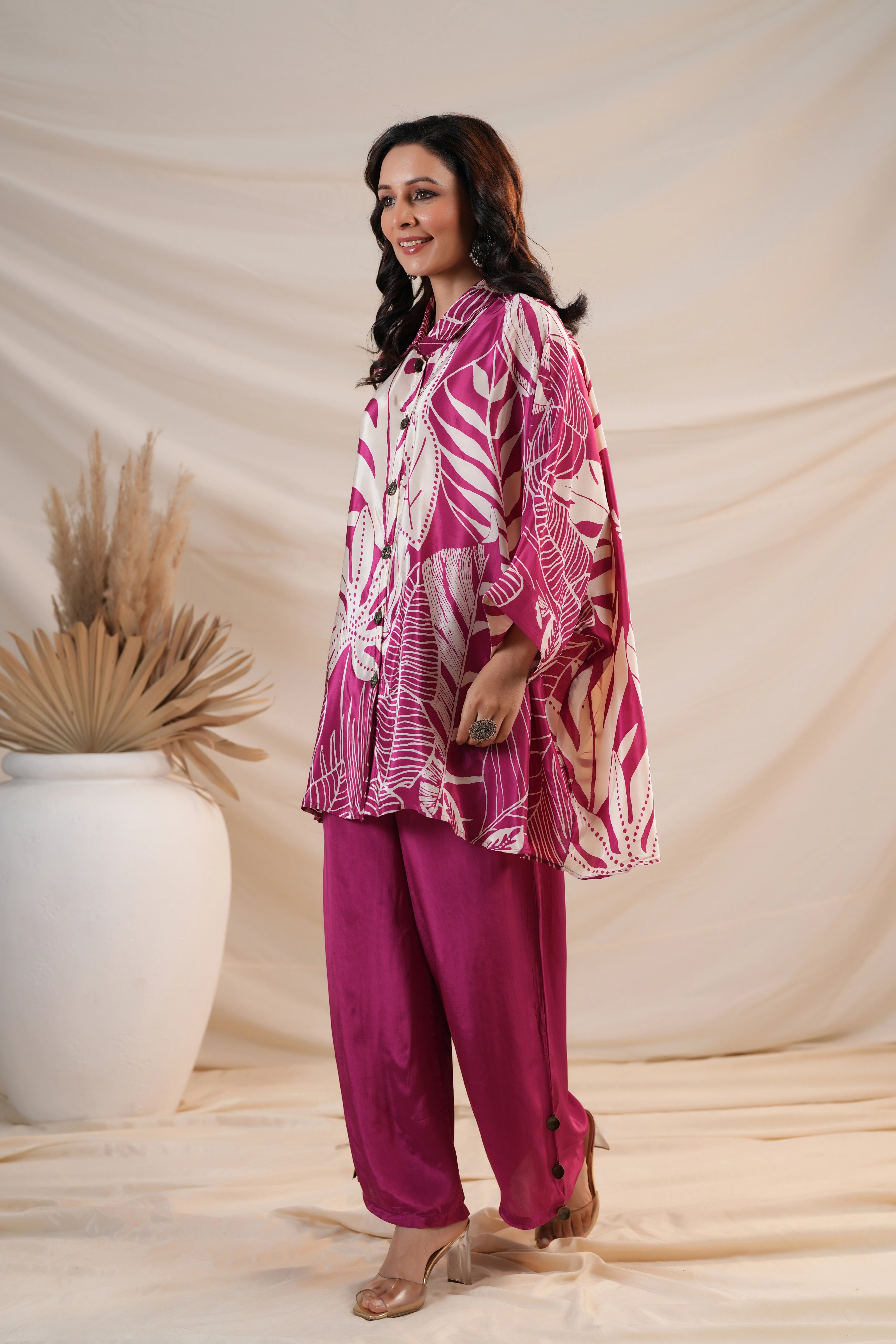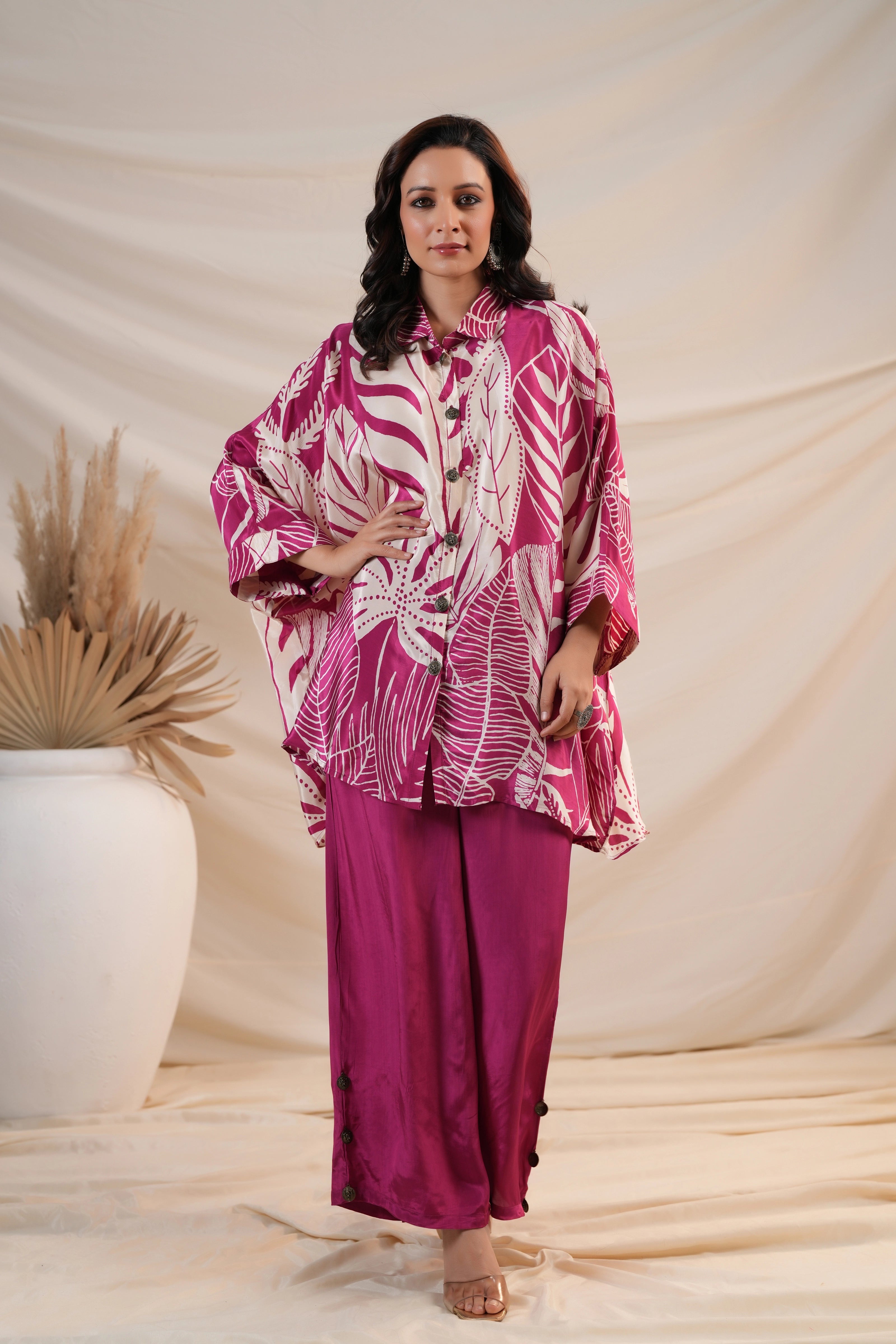 Add a vibrant flair to your wardrobe with this Cream & Magenta Co-Ord Set featuring bold leaf prints on luxurious Russian silk. Designed for an easy-breezy look, this set includes a loose fit button-front top with 3/4th sleeves, paired with comfortable wide-leg pants. The striking print and relaxed silhouette make it perfect for casual brunches, travel days, or statement everyday wear.