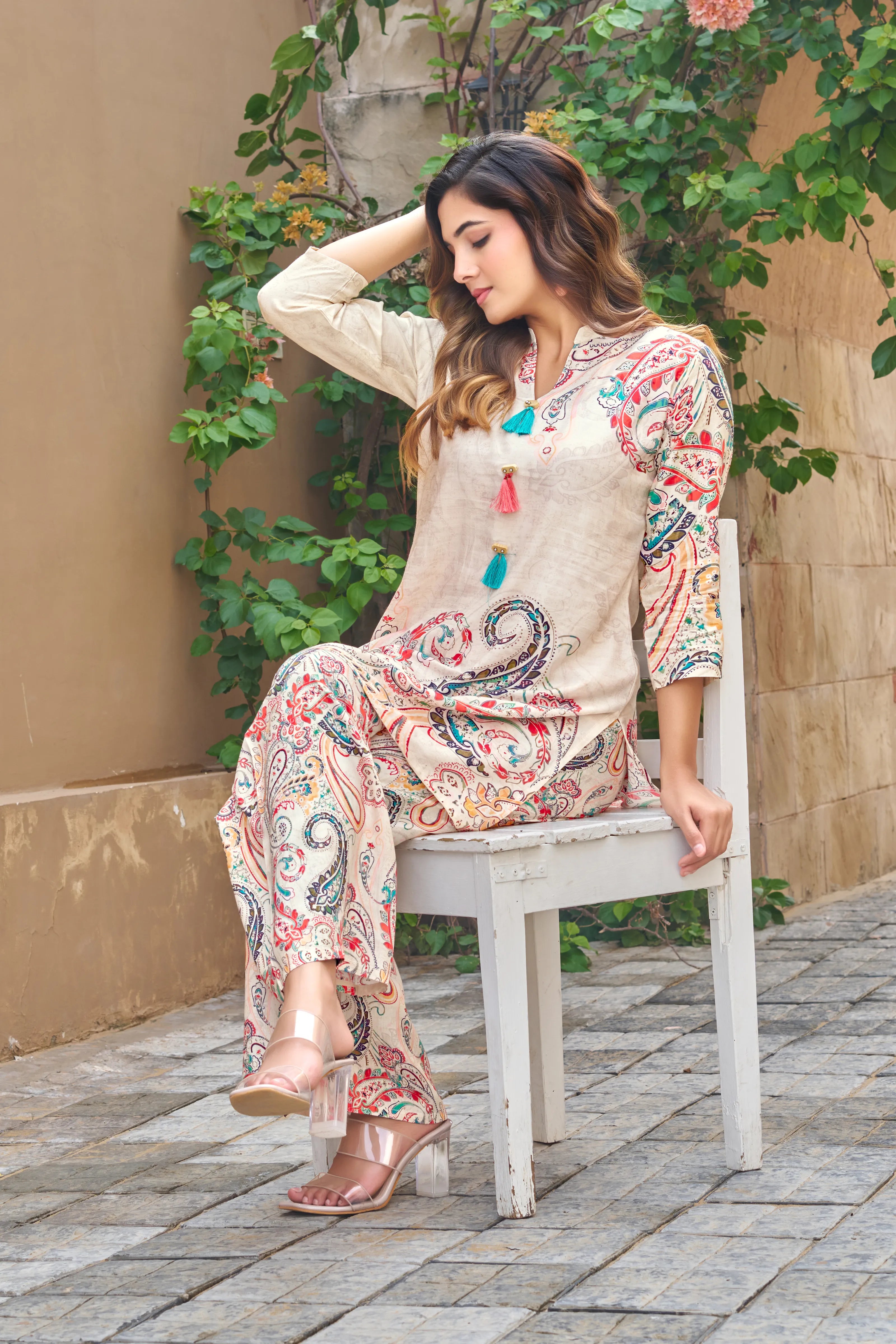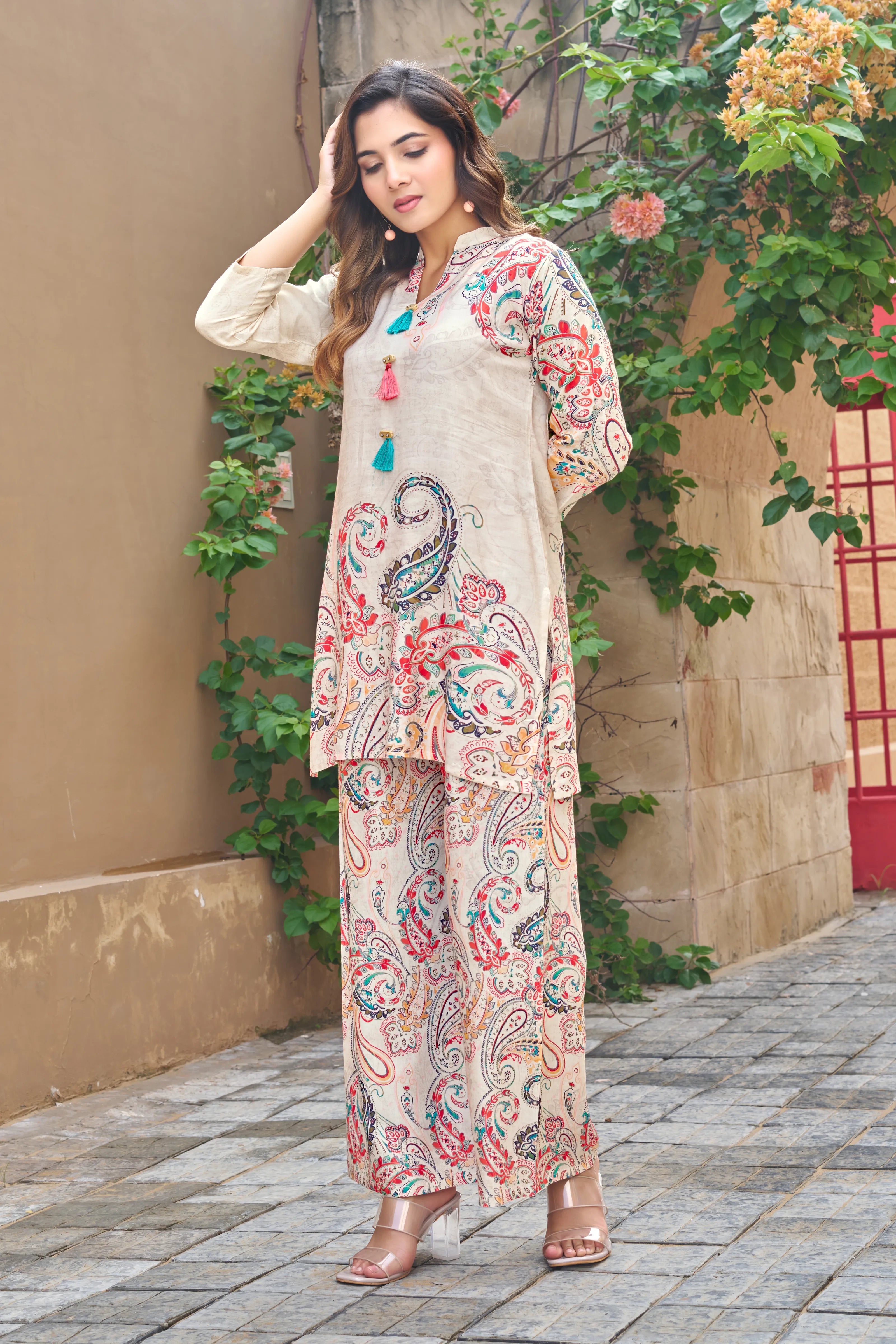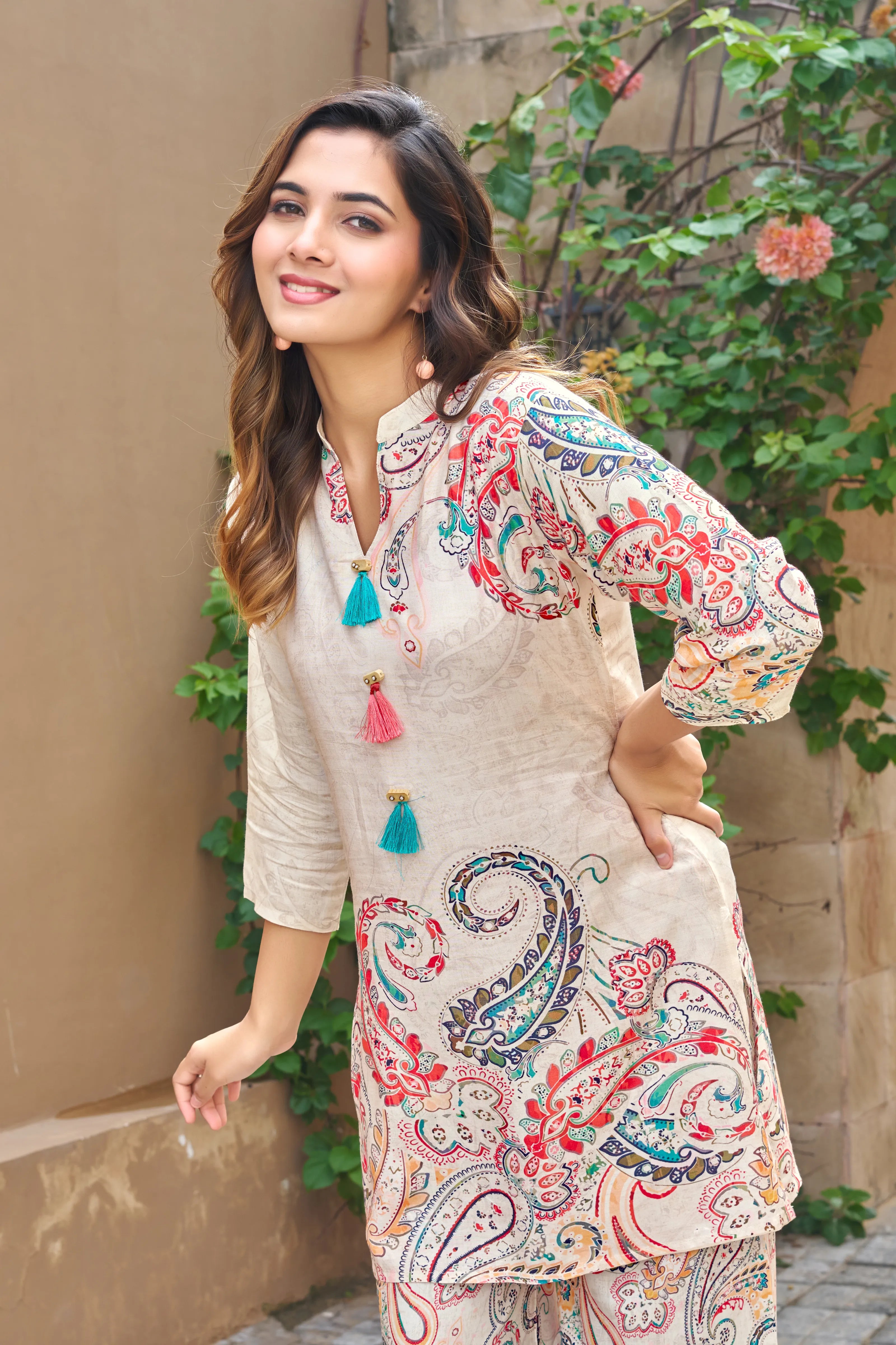 Elevate your everyday ethnic wardrobe with the Paisley Charm co-ord set — a refreshing take on timeless Indian prints. Crafted in airy cream muslin, this ensemble features a graceful long kurta adorned with vibrant paisley placement prints in hues of teal, red, ochre, and black. The kurta’s V-neckline with a mandarin collar and playful tassel accents adds a charming twist, while the relaxed 3/4th sleeves ensure ease and flow. Complemented by wide-leg printed pants that echo the kurta’s colorful palette, this set is equal parts festive and fuss-free.