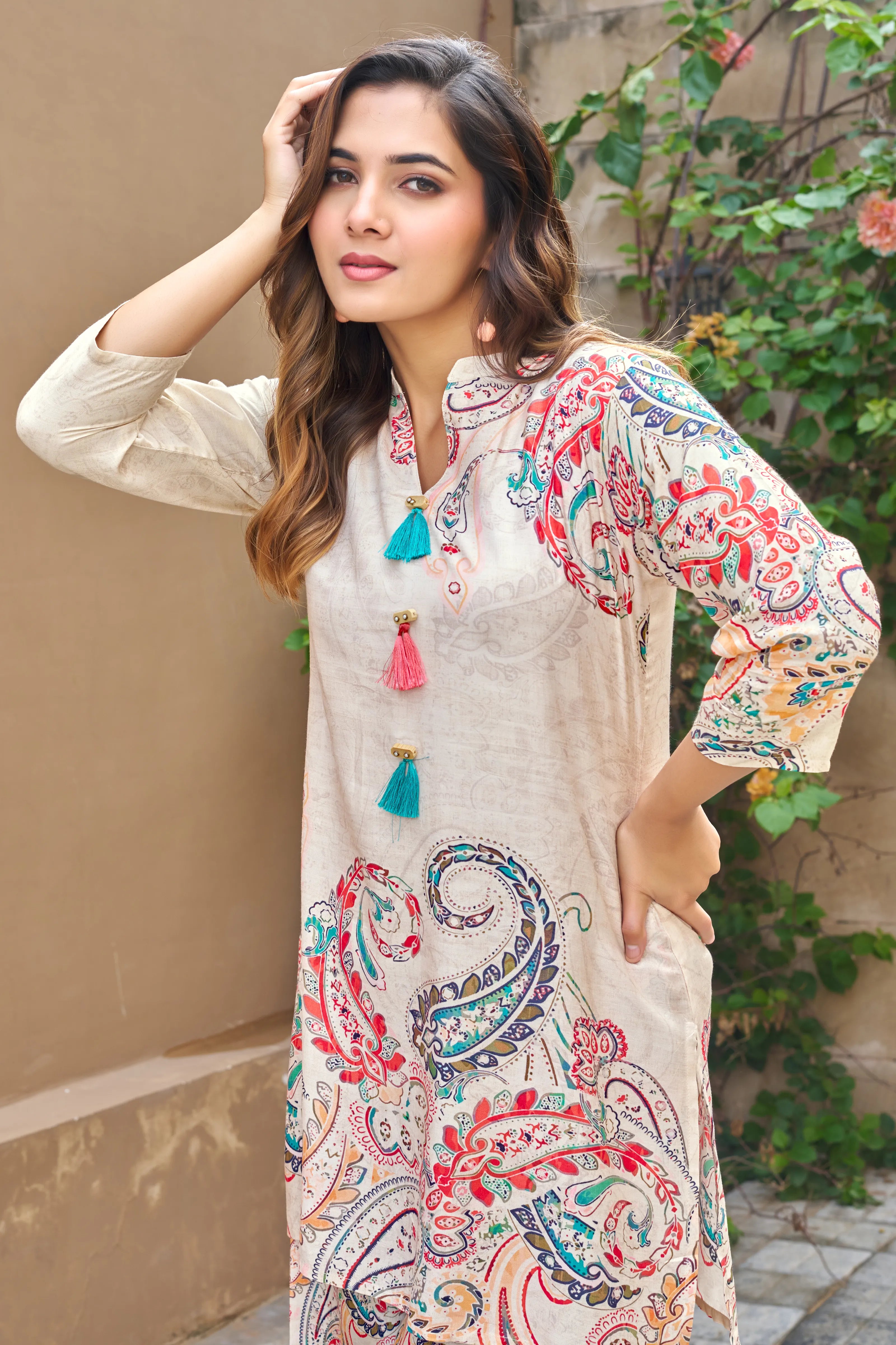 Paisley Charm: Cream Muslin Kurta Set with Multi-Color Elegance