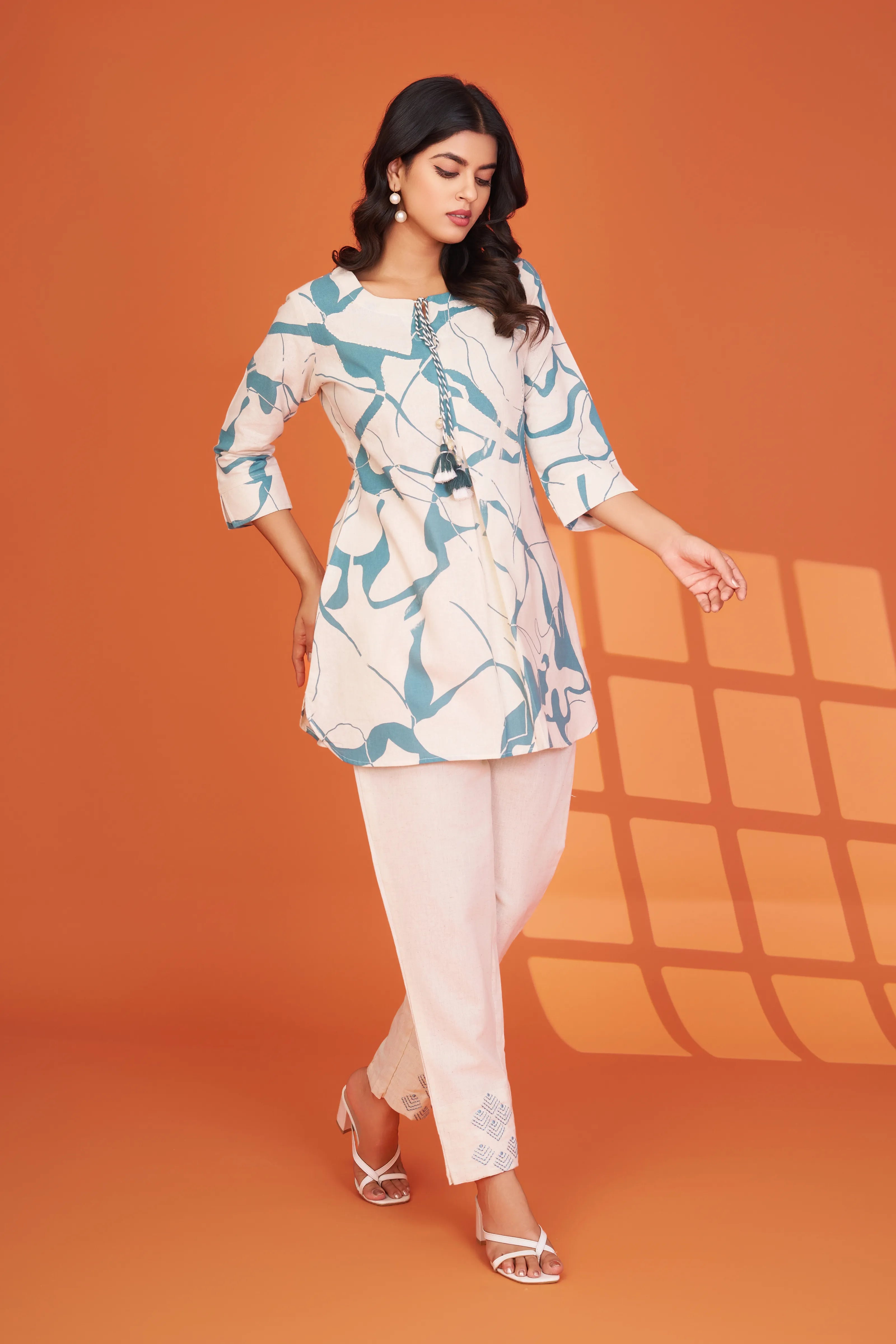 Ocean Whimsy: Cream & Pale Blue Abstract Cotton Flex Co-ord Set