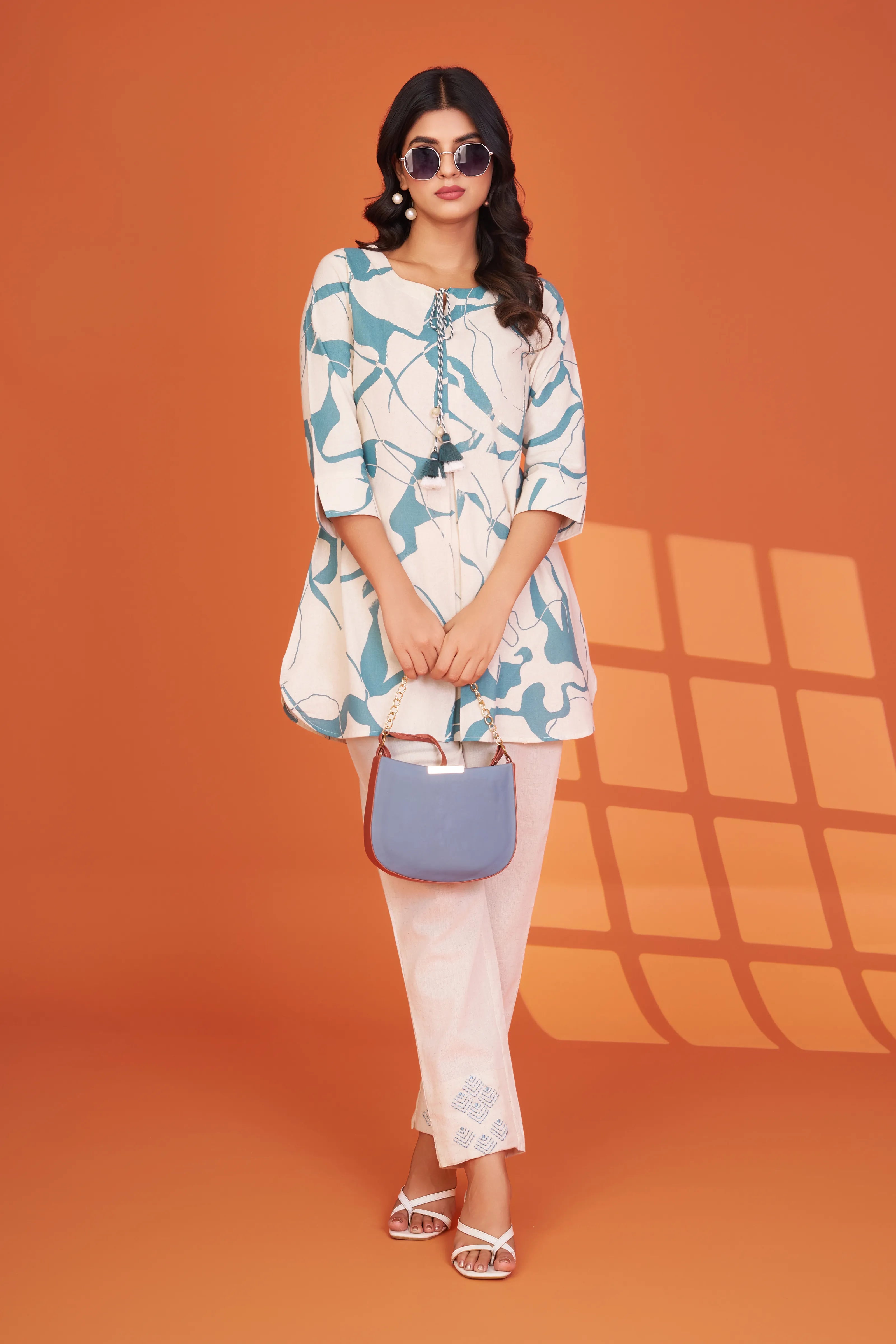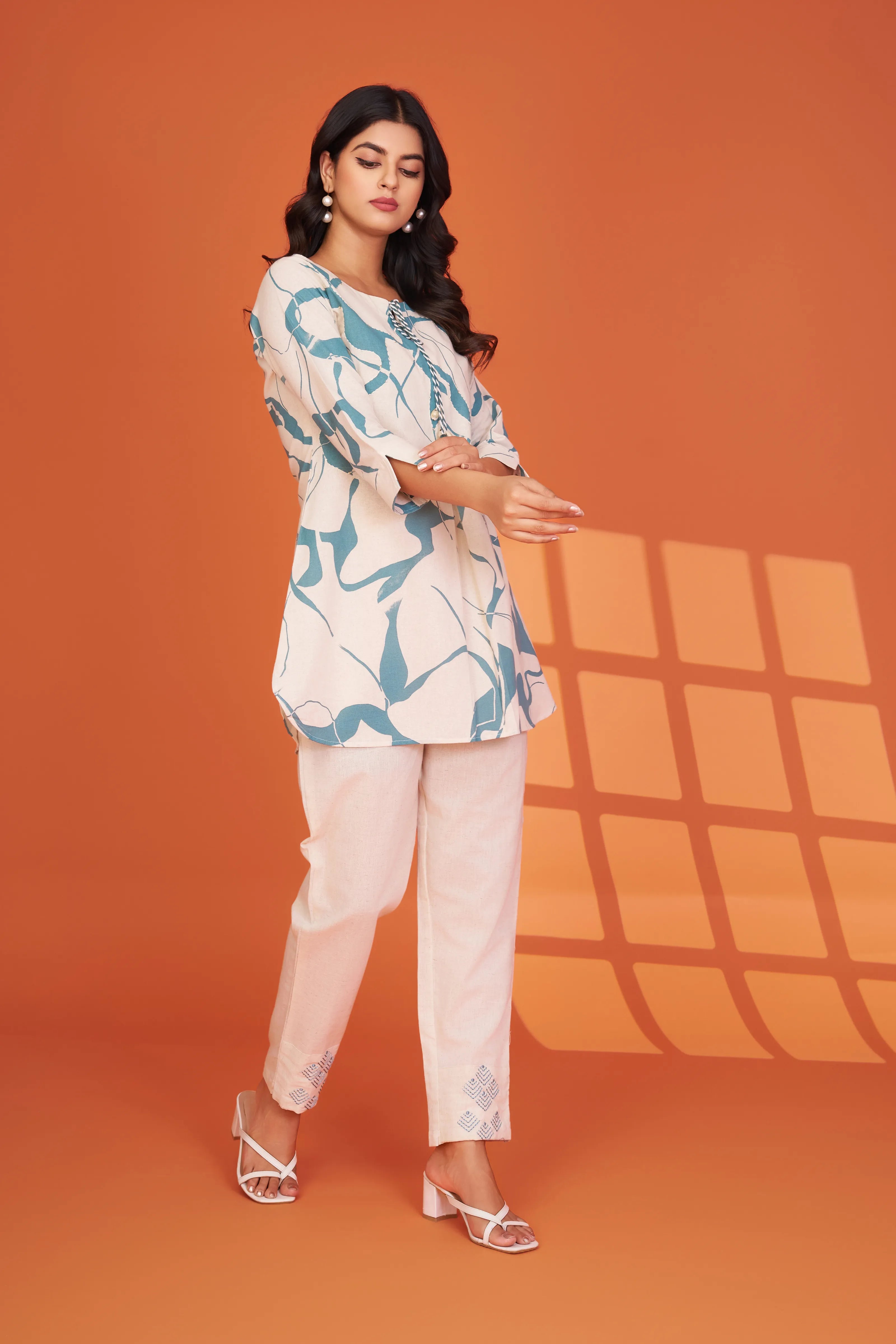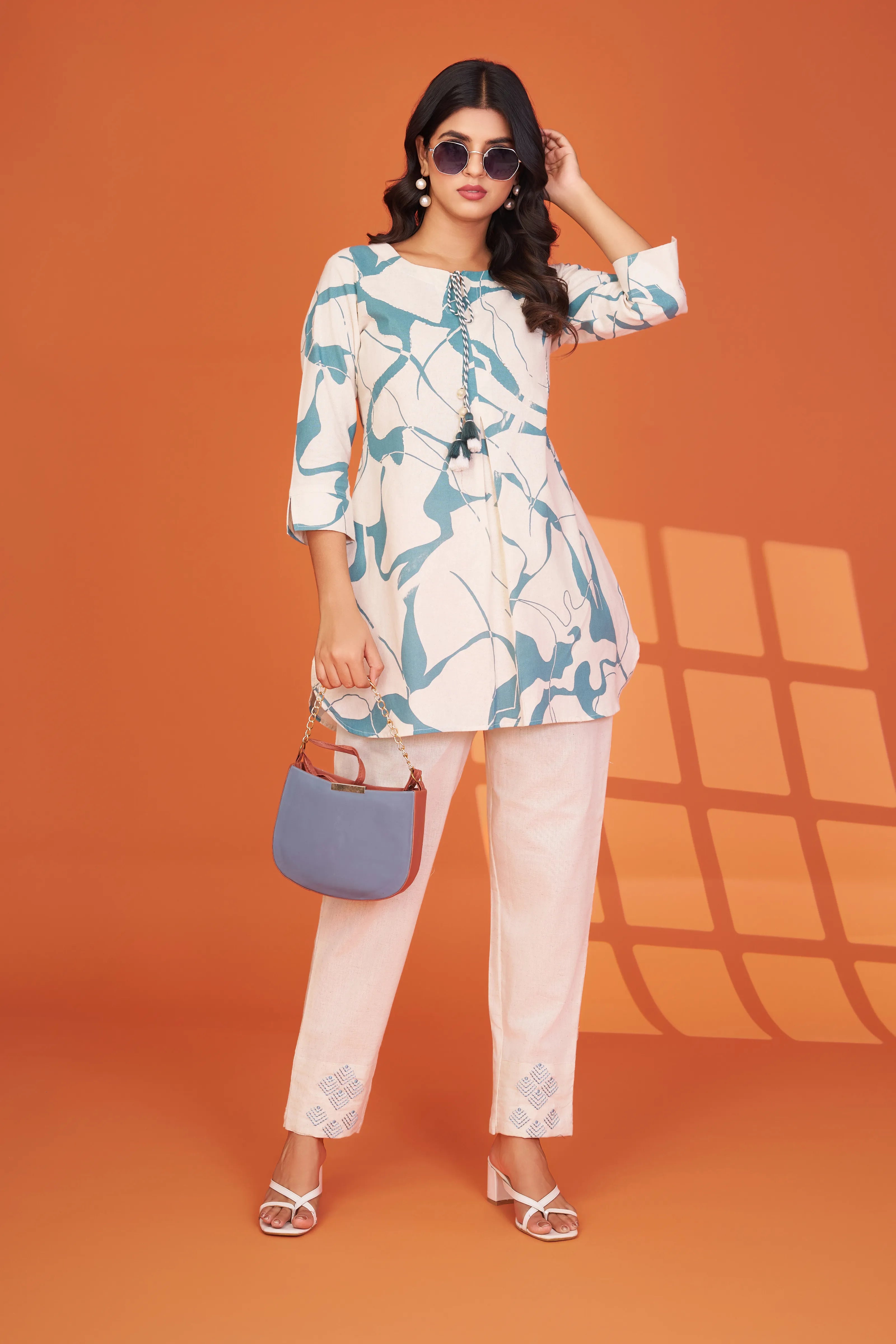 Infused with the serenity of sea breezes and soft silhouettes, Ocean Whimsy is a mood-lifting co-ord set that brings comfort and creativity together. Designed in a breathable cotton flex fabric, this cream base ensemble features a pale blue abstract print, brought to life with delicate blanket stitching and light sequin highlights.