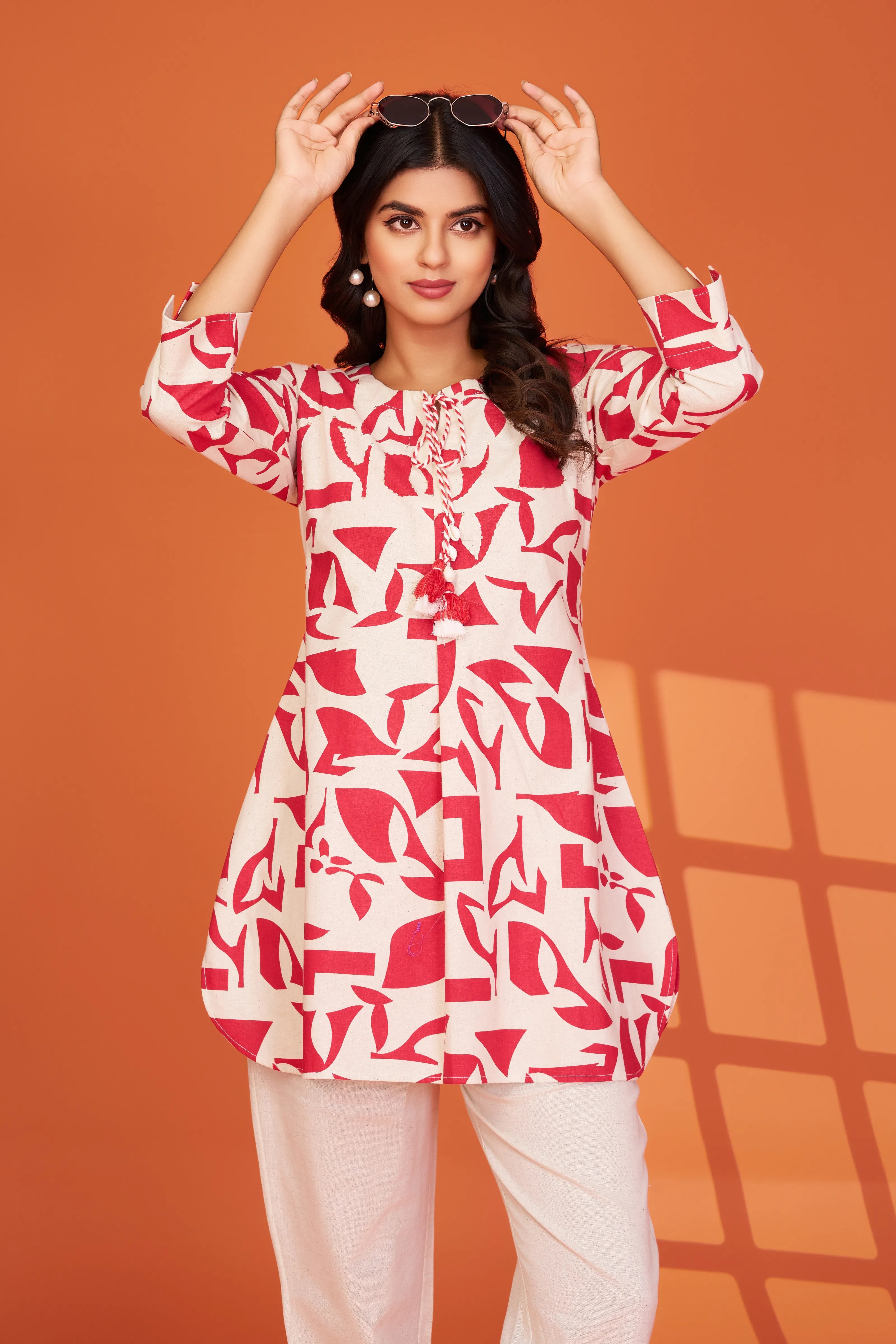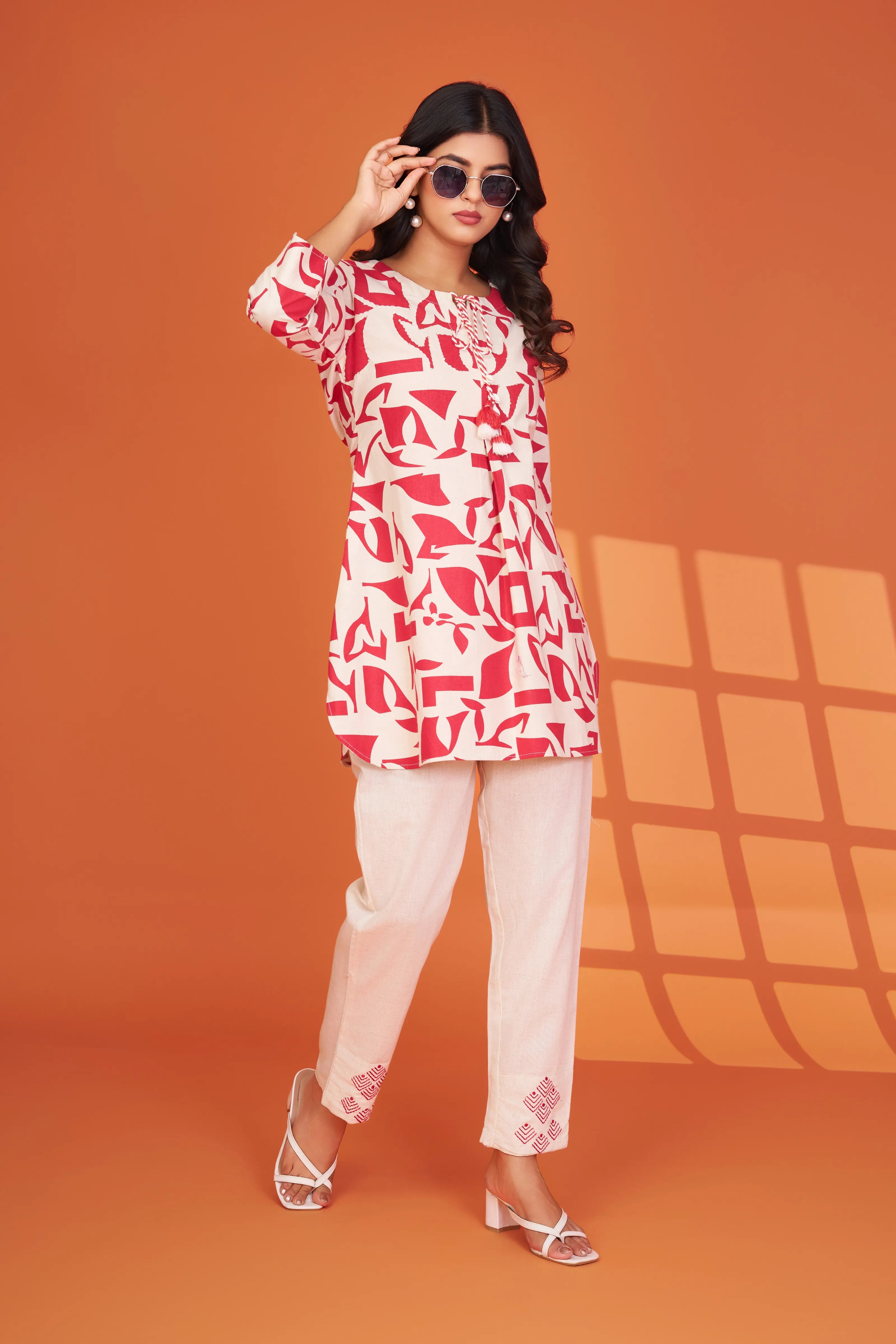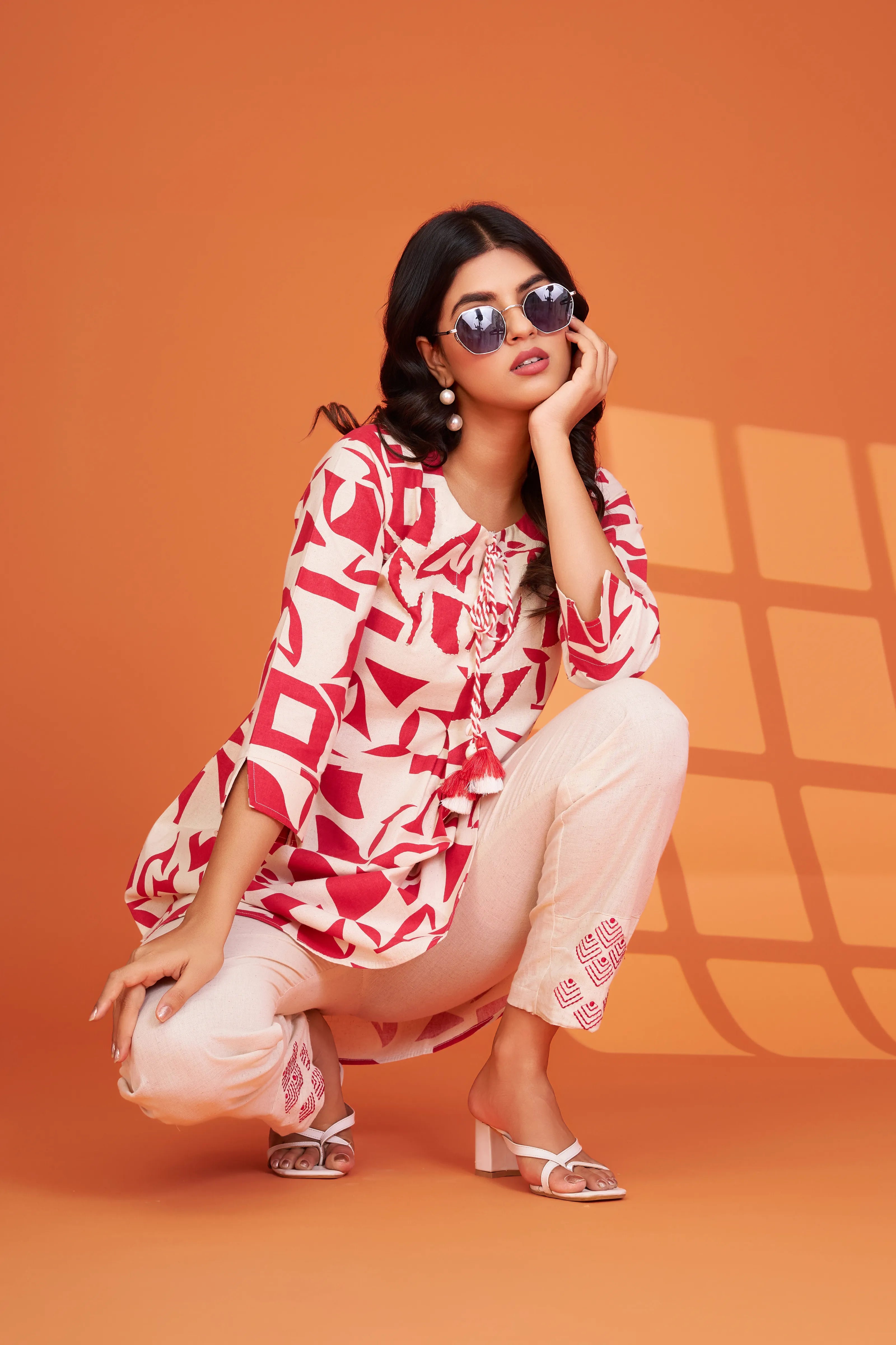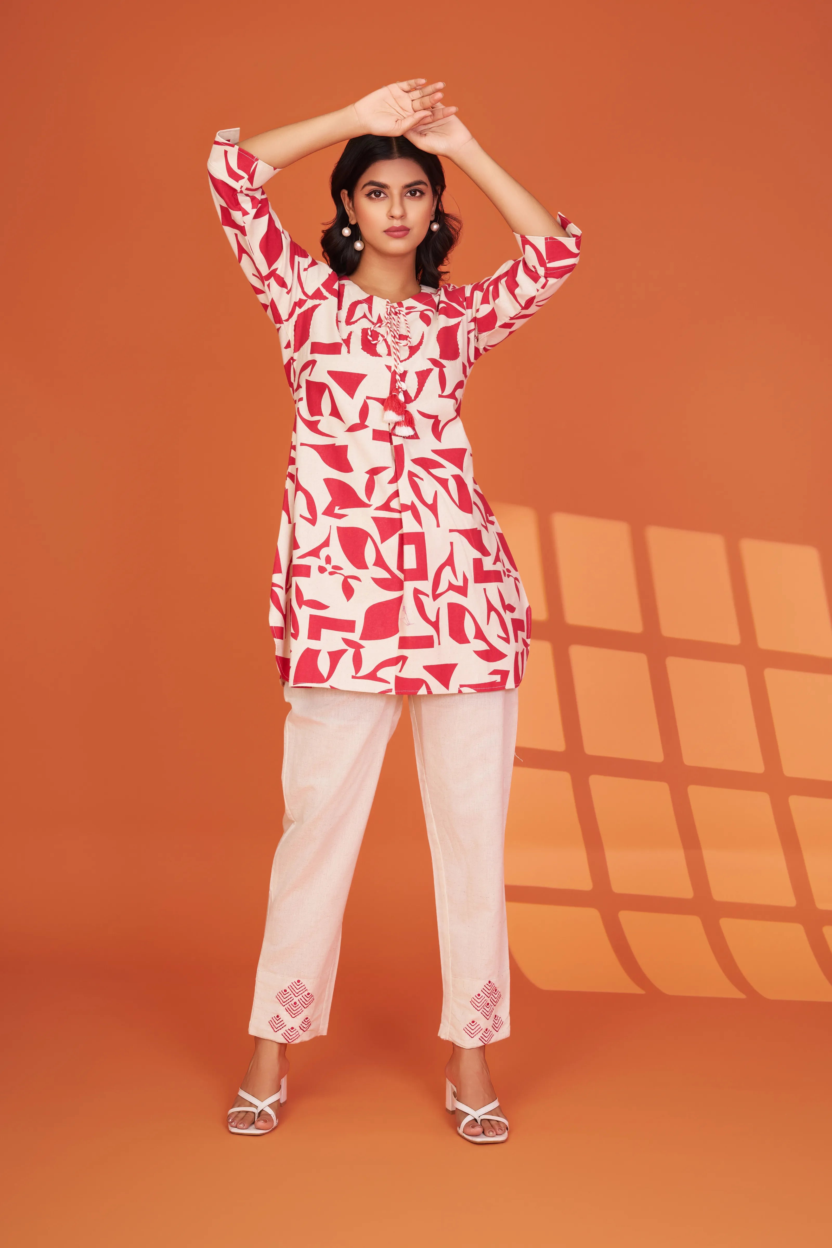 Modern Muse: Cream & Red Abstract Print Cotton Flex Co-ord Set
