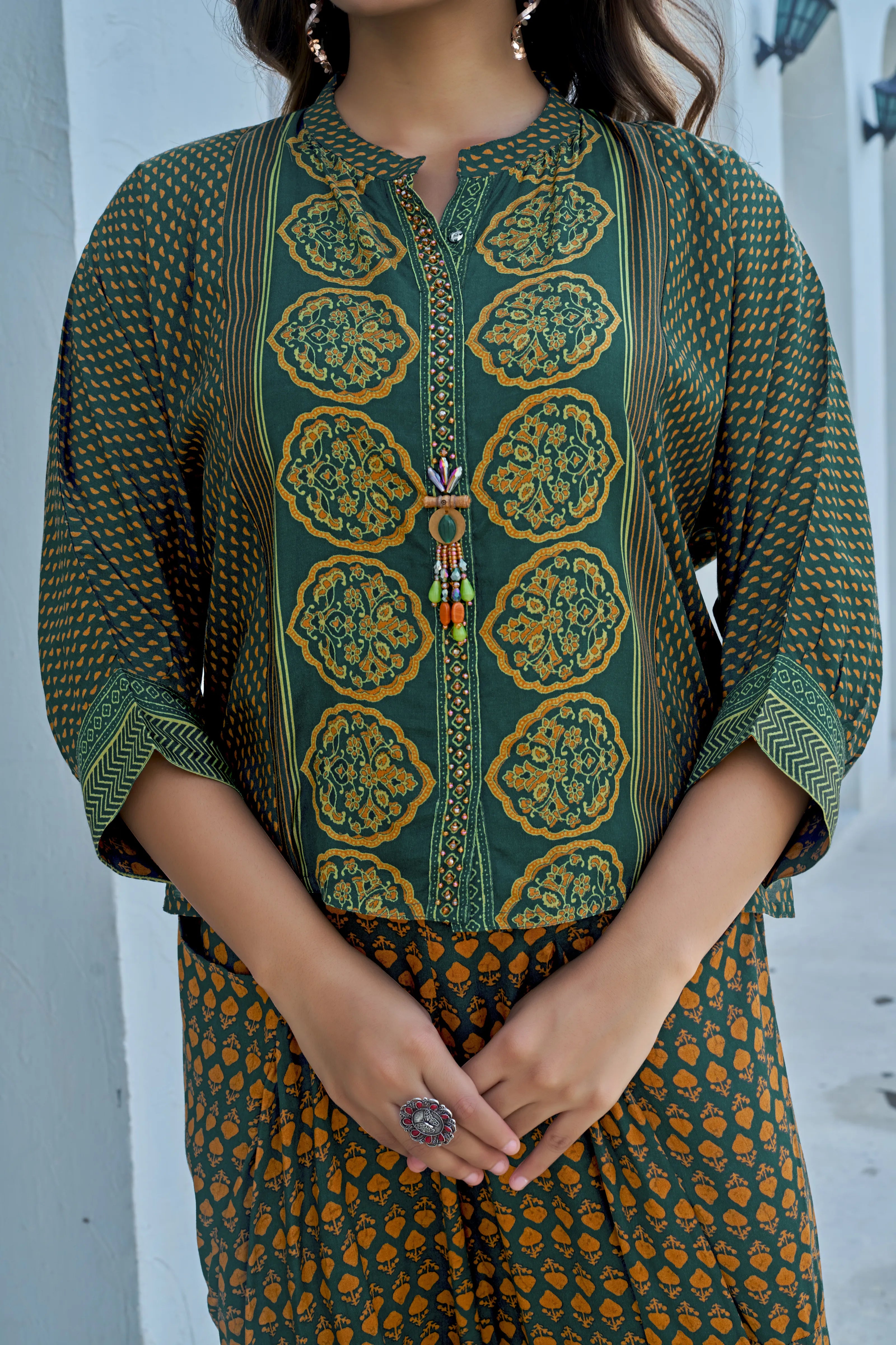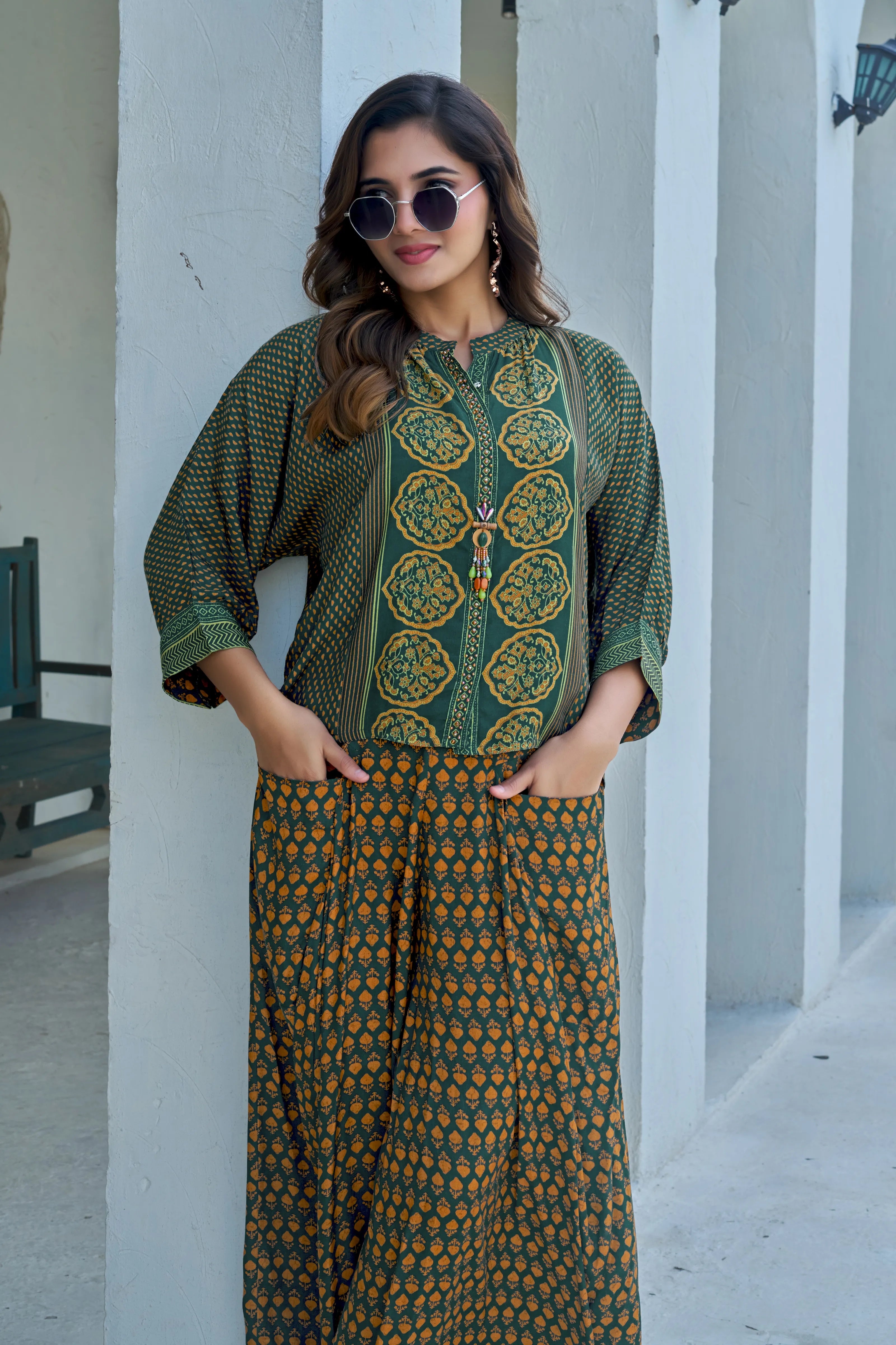 Channel regal heritage with a modern twist in Zehan Zari, a statement co-ord set crafted in fluid viscose silk. Featuring an enchanting dark green & golden yellow ethnic buti print, the short kurti is designed with a contrasting bold hand block patterned front, moti embellishment, and a brooch-detailed mandarin collar. The 3/4th sleeves are enhanced with border-printed cuffs, while the wide-leg printed pants with front pockets offer both flair and functionality.