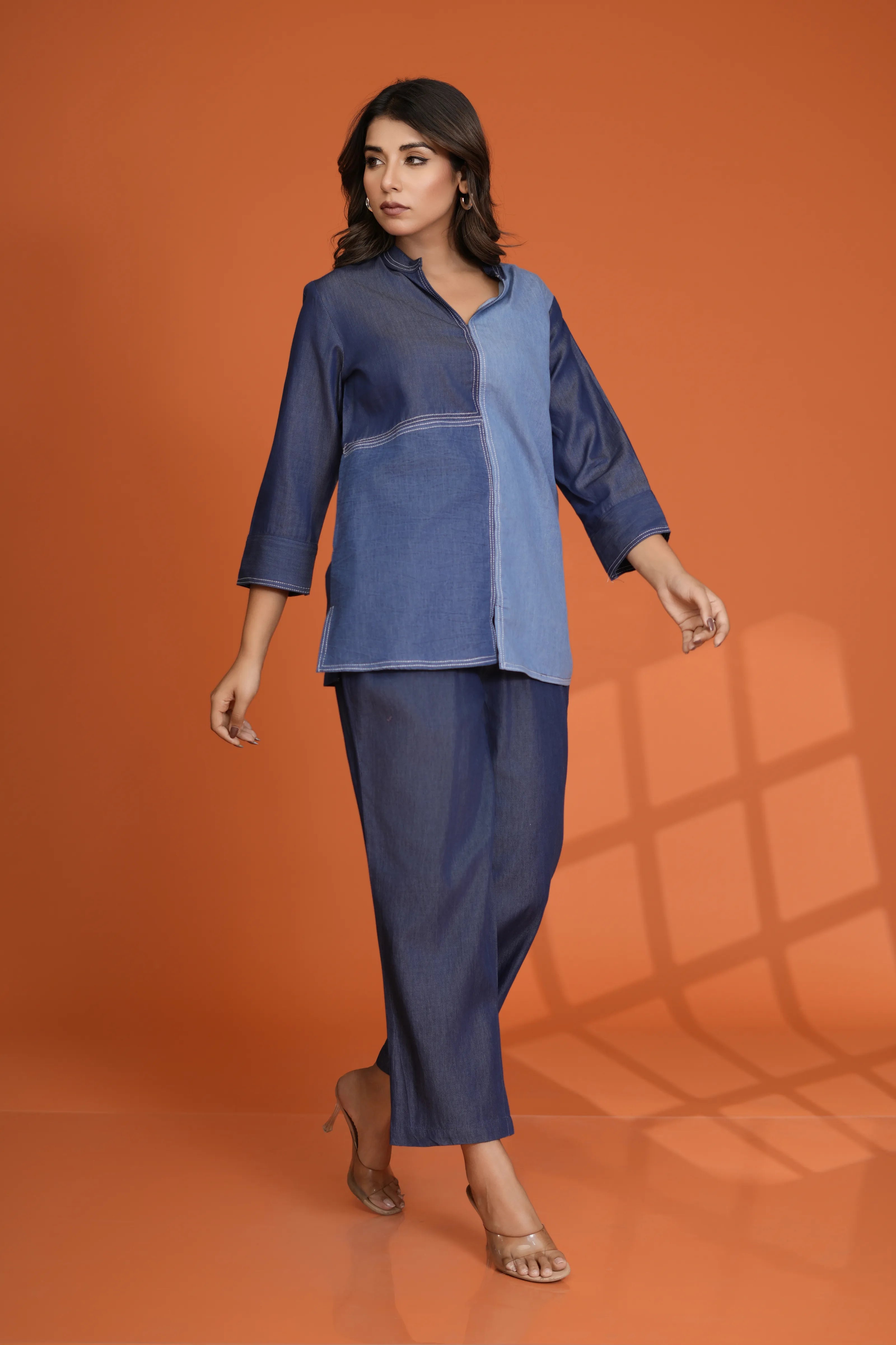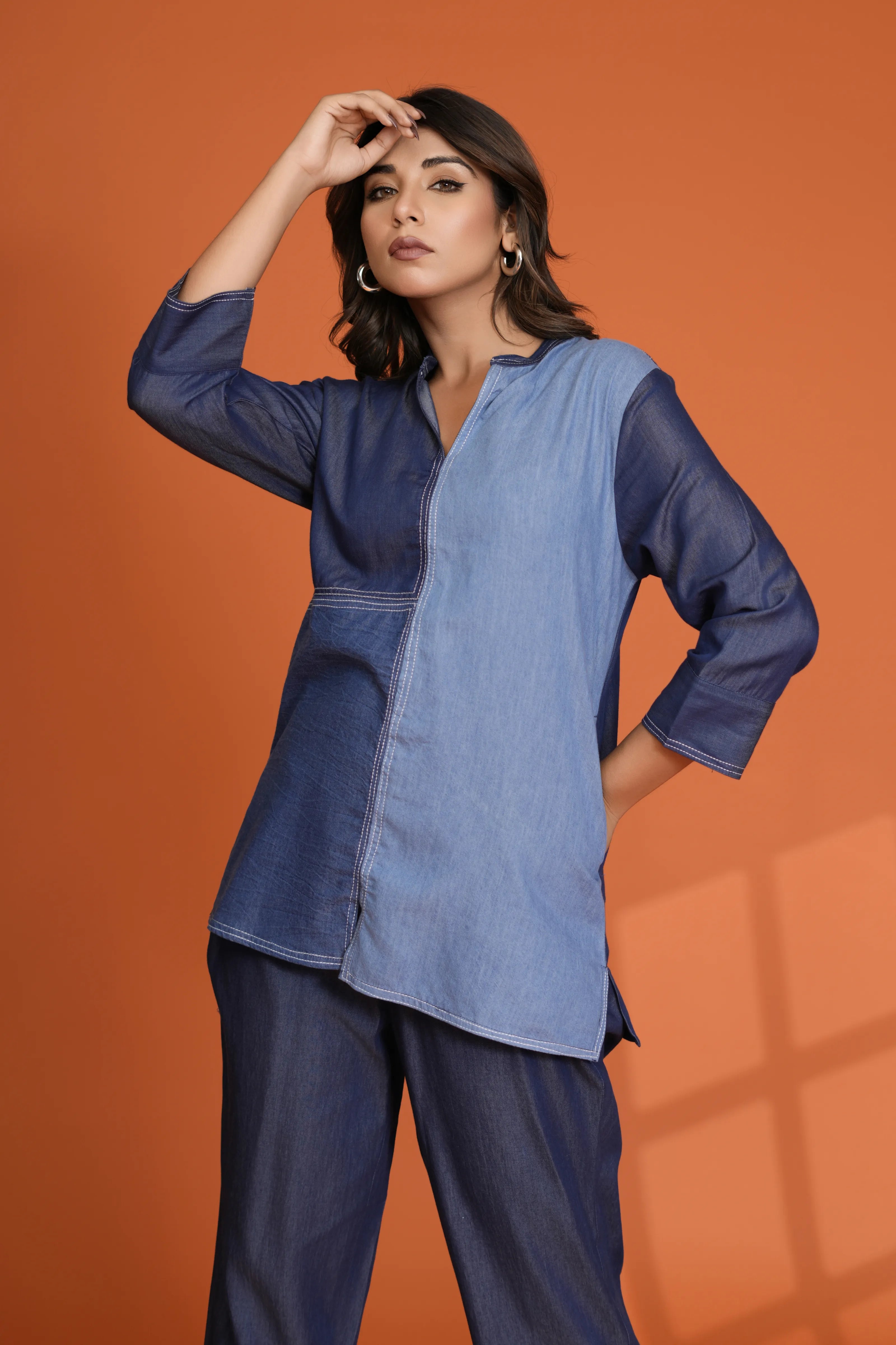 Denim Mismatch Top with White Topstitch in Cotton Denim