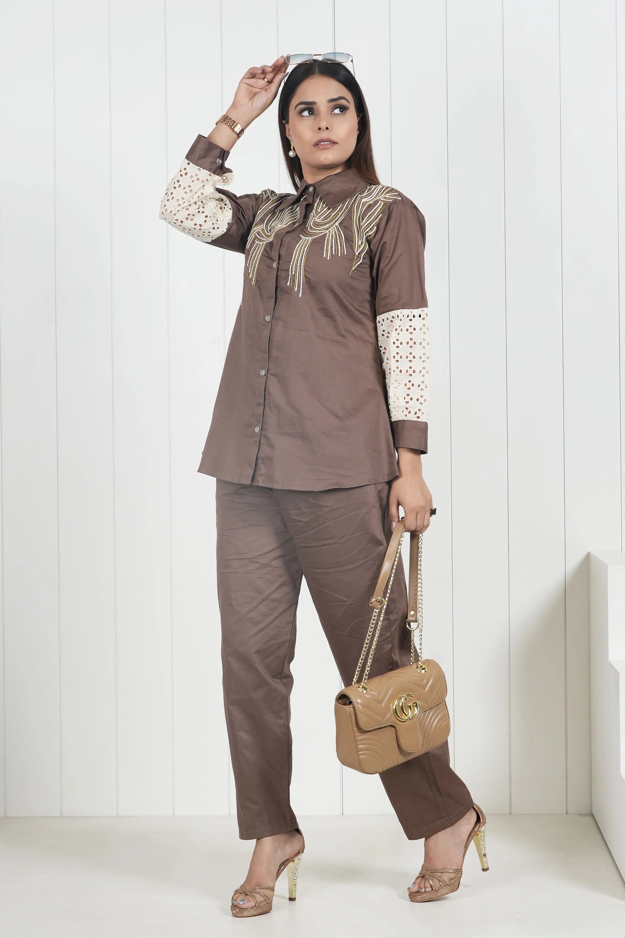 Elevate your wardrobe with this Elegant Brown Embroidered Tunic Set, a perfect blend of refined craftsmanship and modern ease. Designed in premium Cotton Satin, this ensemble features intricate Schiffli work and delicate thread embroidery, making it a standout choice for elegant daywear and semi-formal occasions.