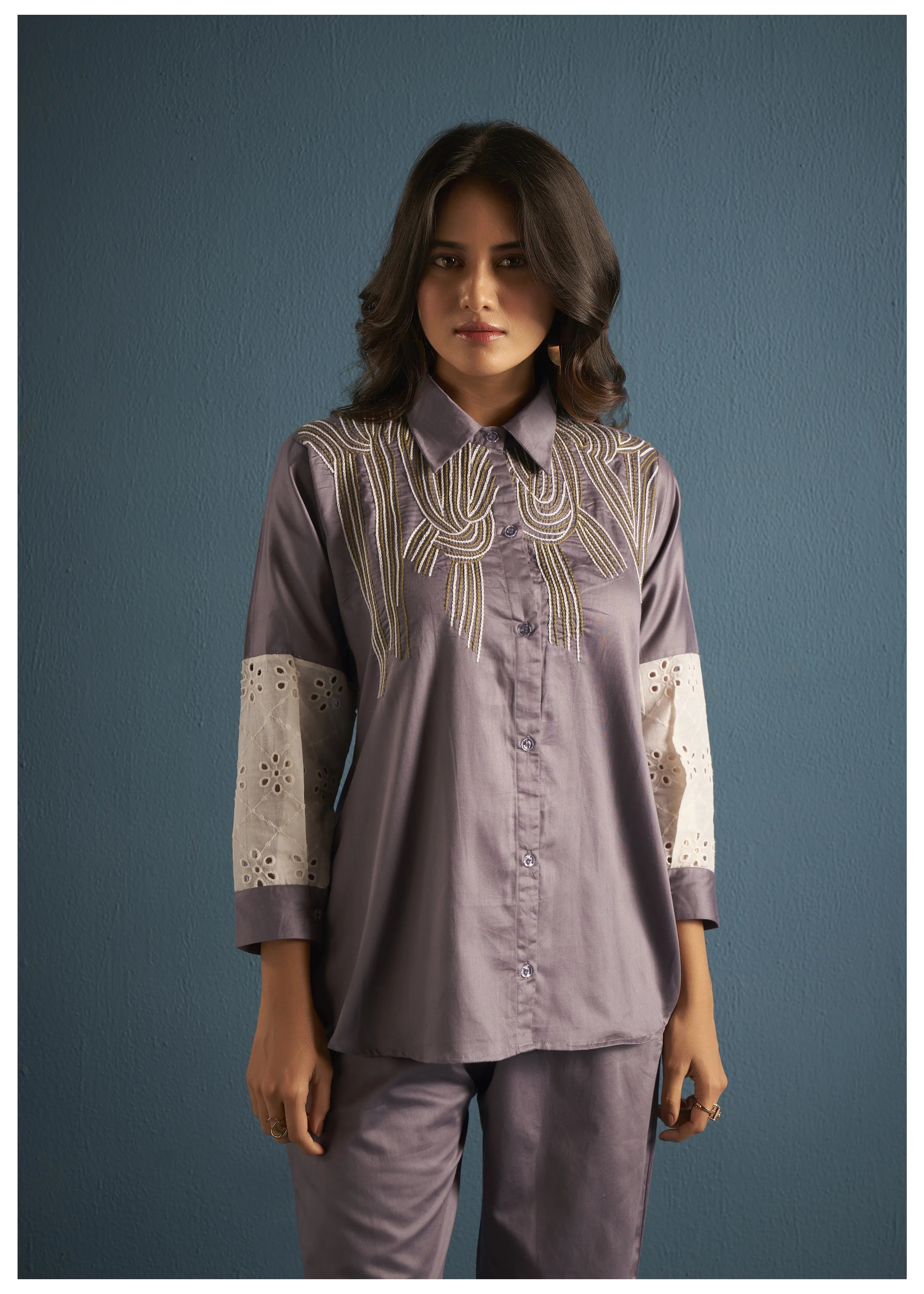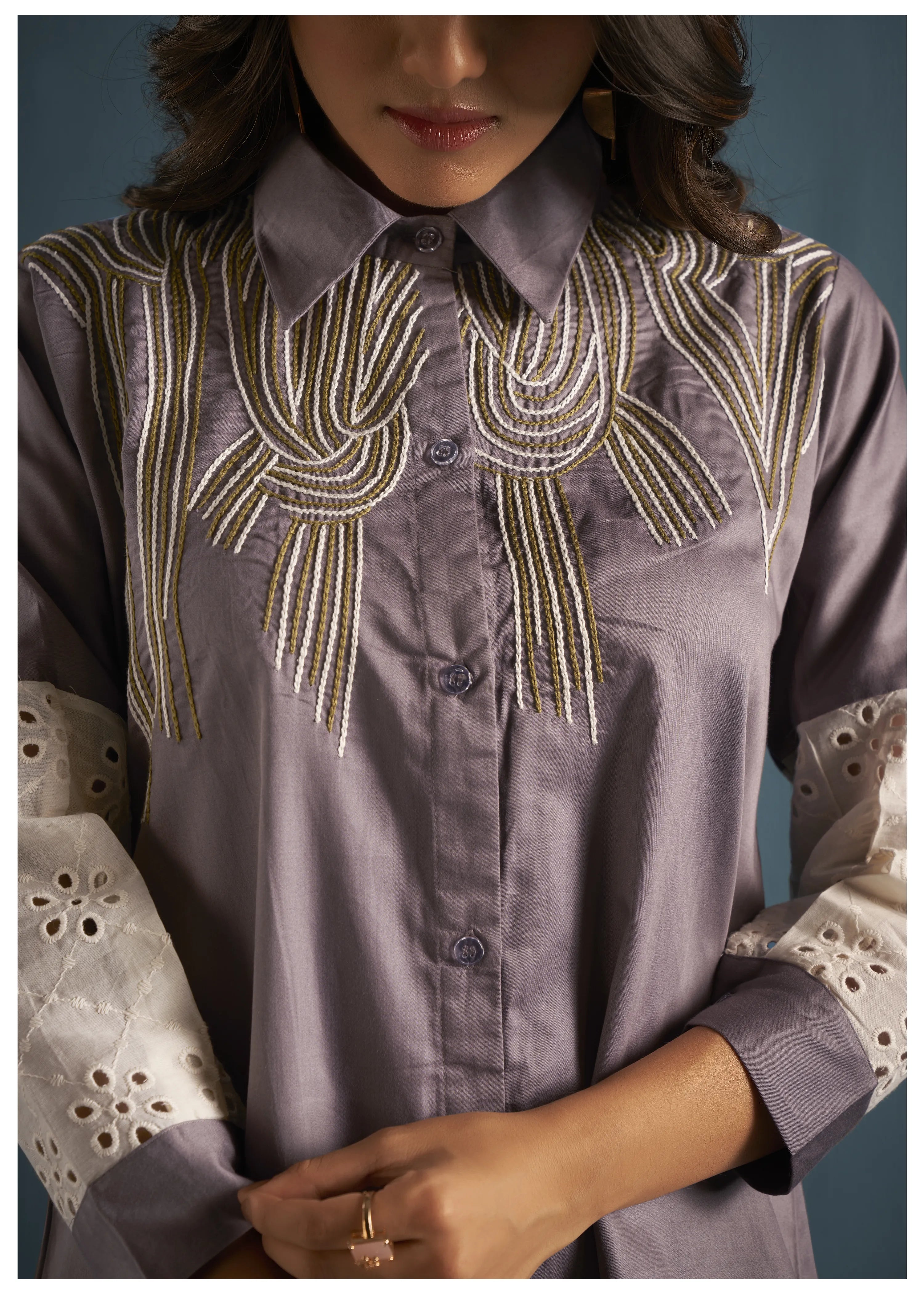 Tunic: Mauve Base, Schiffli Work, Thread Embroidery, Collared Neckline, Full Sleeves, Button Closure