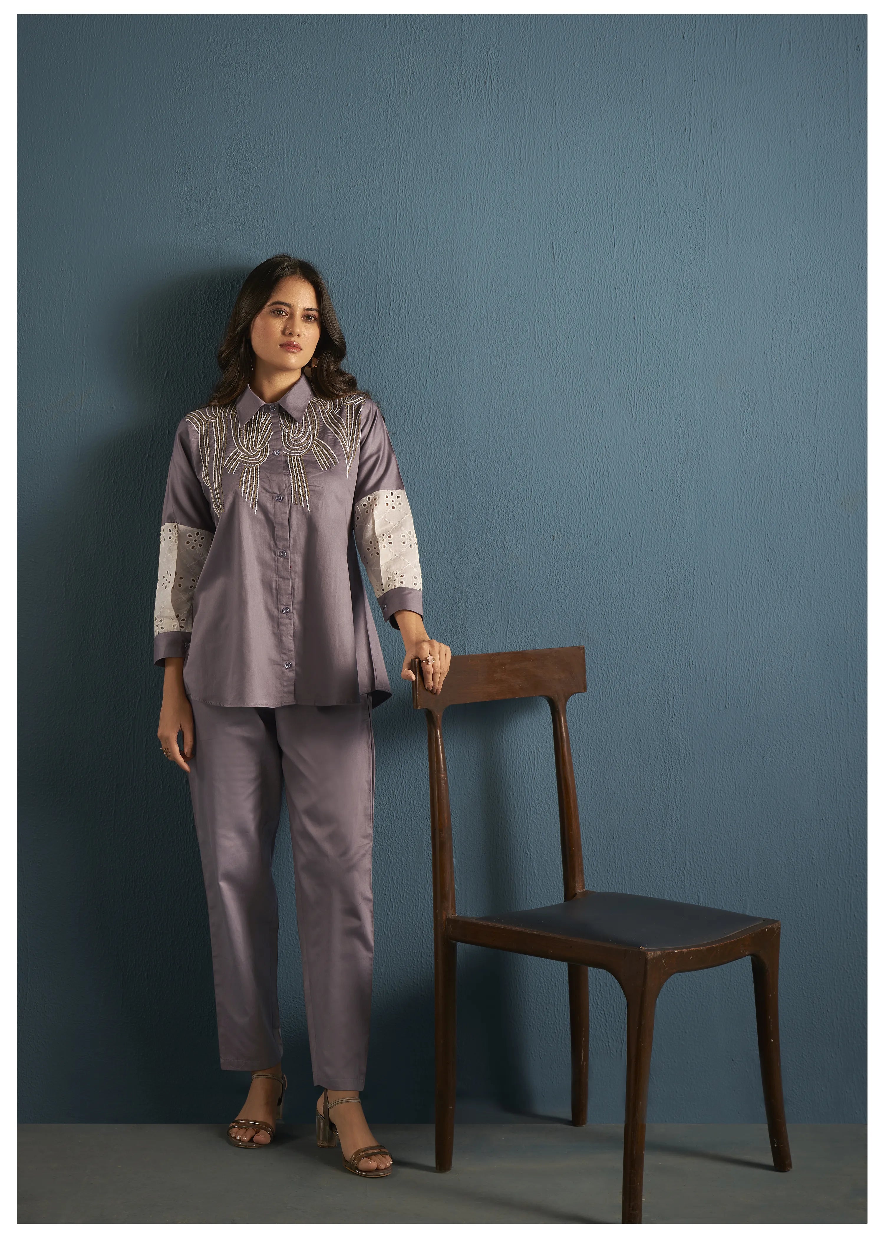 Refined Elegance: Mauve Cotton Satin Embroidered Tunic Set