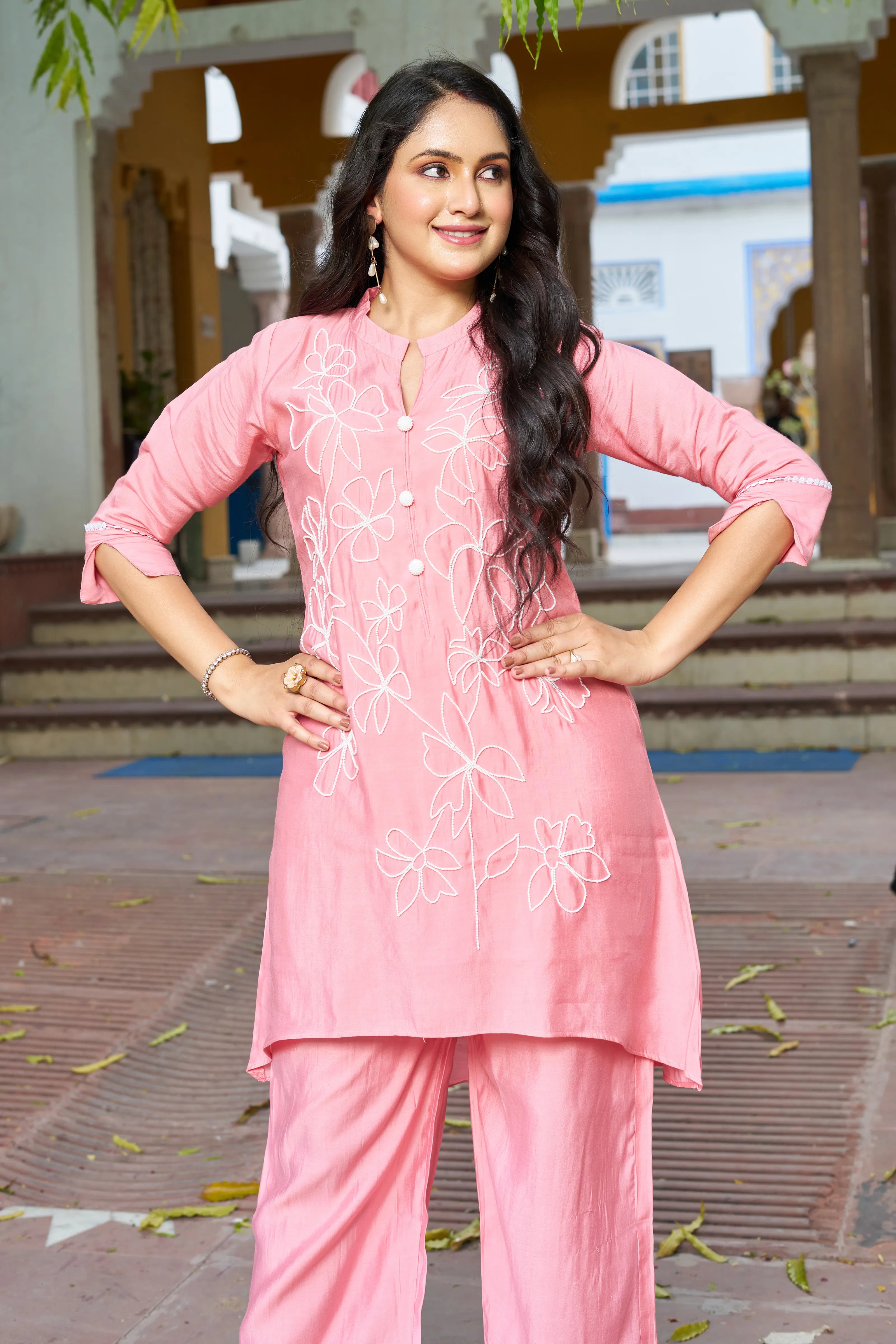 Bring a soft charm to your everyday wardrobe with Blush Breeze, a pastel pink co-ord set that celebrates graceful movement and feminine elegance. The A-line kurta features a high-low hem, V-neck with mandarin collar, and delicate floral motifs accentuated with beaded buttons and tonal thread embroidery. Paired with asymmetric lace-detailed pants, this silk set is a breezy blend of comfort and sophistication.
