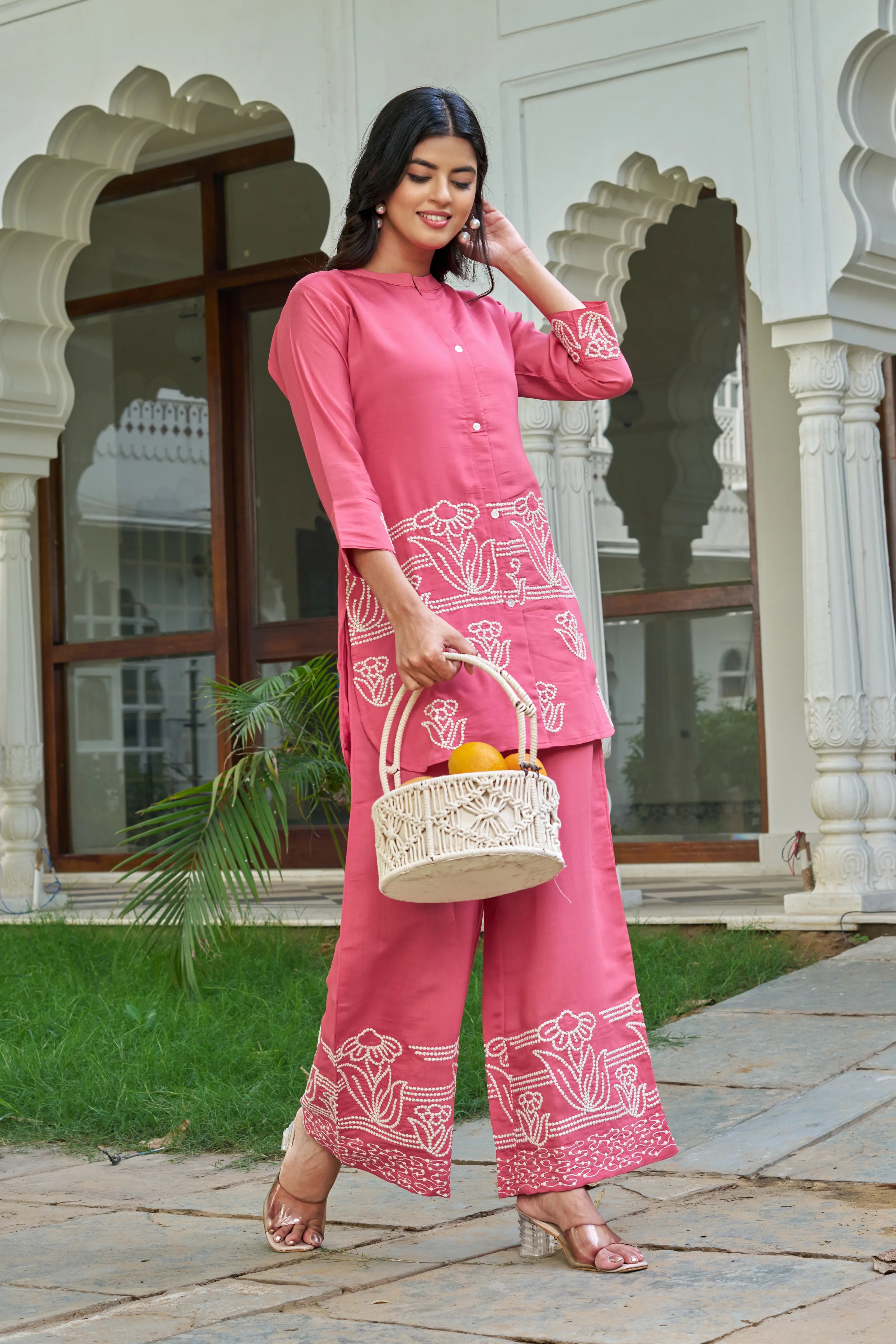 Blush Bloom: Floral Embroidered Co-ord Set in Rosewood Pink Silk