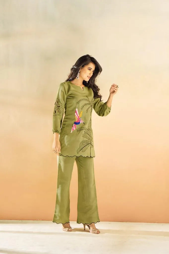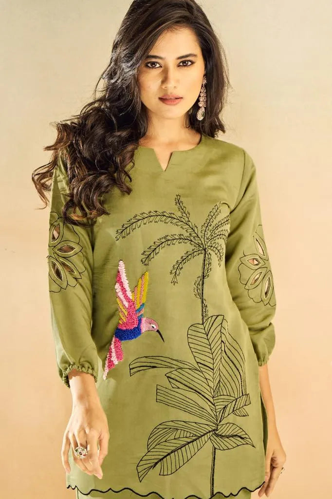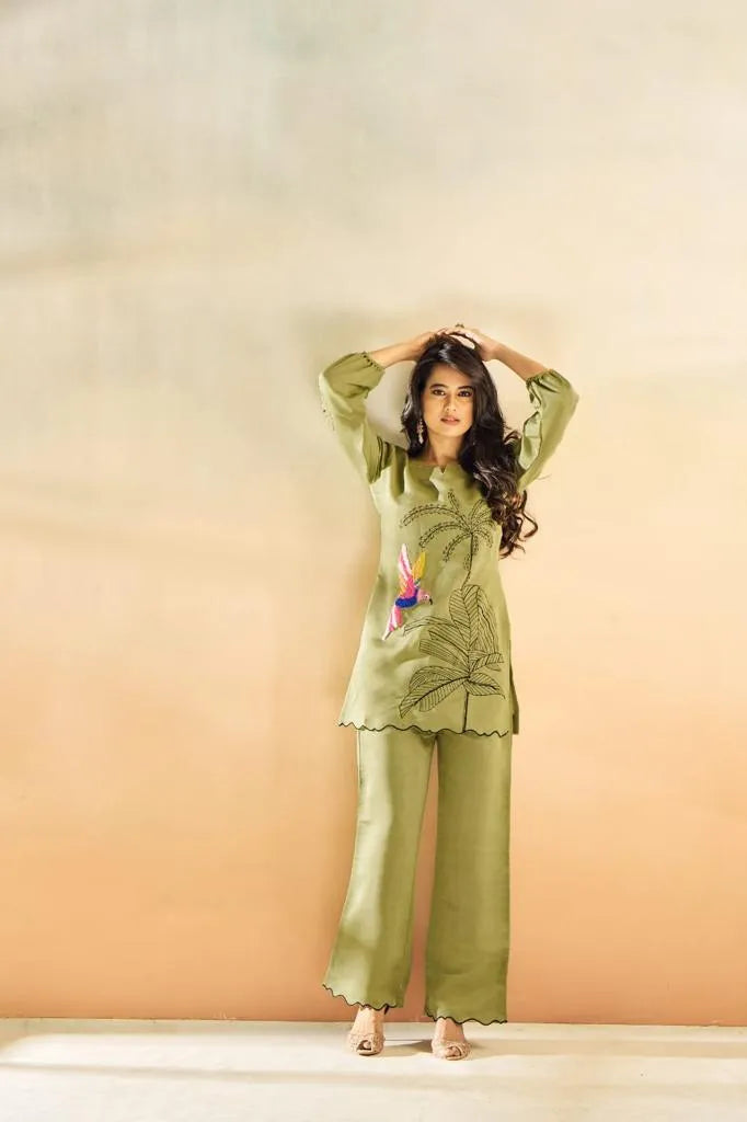 Green Embroidered Muslin Tunic & Trouser Co-Ord Set